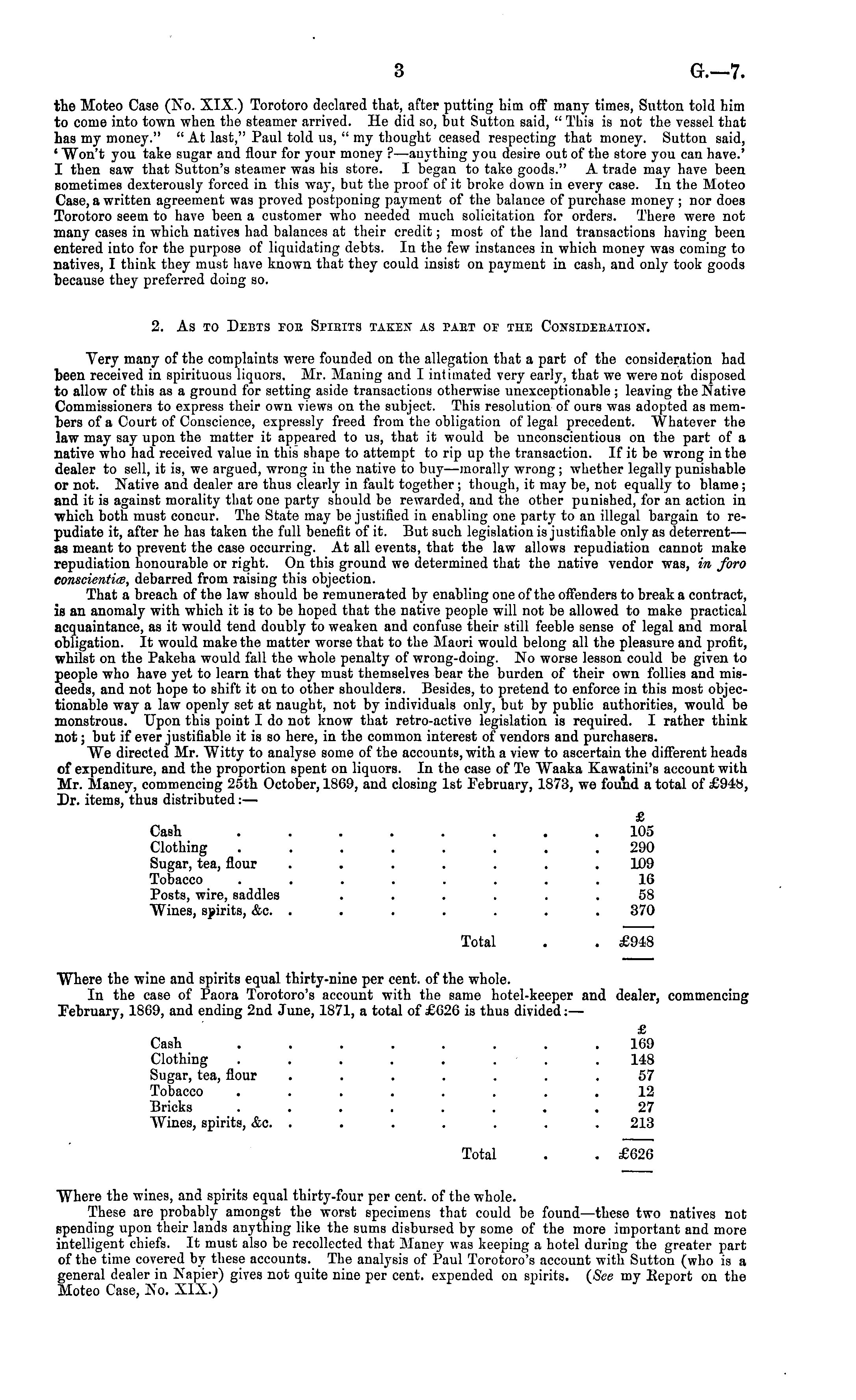 the Moteo Case (No. XIX.) Torotoro declared that, after putting him off many times, Sutton told him to come into town when the steamer arrived. He did so, but Sutton said, " This is not the vessel that has my money." "At last," Paul told us, "my thought ceased respecting that money. Sutton said, ' Won't you take sugar and flour for your money ? —anything you desire out of the store you can have.' I then saw that Sutton's steamer was his store. I began to take goods." A trade may have been, sometimes dexterously forced in this way, but the proof of it broke down in every case. In the Moteo Case, a written agreement was proved postponing payment of the balance of purchase money ; nor does Torotoro seem to have been a customer who needed much solicitation for orders. There were not many cases in which natives had balances at their credit; most of the land transactions having been entered into for the purpose of liquidating debts. In the few instances in which money was coming to natives, I think they must have known that they could insist on payment in cash, and only took goods because they preferred doing so. 2. As to Debts foe Spikits taken as past of the Coxsideeation. Very many of the complaints were founded on the allegation that a part of the consideration had been received in spirituous liquors. Mr. Maning and I intimated very early, that we were not disposed to allow of this as a ground for setting aside transactions otherwise unexceptionable; leaving the Native Commissioners to express their own views on the subject. This resolution of ours was adopted as members of a Court of Conscience, expressly freed from the obligation of legal precedent. Whatever the law may say upon the matter it appeared to us, that it would be unconscientious on the part of a native who had received value in this shape to attempt to rip up the transaction. If it be wrong in the dealer to sell, it is, we argued, wrong iv the native to buy—morally wrong; whether legally punishable or not. Native and dealer are thus clearly in fault together ; though, it may be, not equally to blame ; and it is against morality that one party should be rewarded, and the other punished, for an action in which both must concur. The State may be justified in enabling one party to an illegal bargain to repudiate it, after he has taken the full benefit of it. But such legislation is justifiable only as deterrent — as meant to prevent the case occurring. At all events, that the law allows repudiation cannot make repudiation honourable or right. On this ground we determined that the native vendor was, in foro conscientiw, debarred from raising this objection. That a breach of the law should be remunerated by enabling one of the offenders to break a contract, is an anomaly with which it is to be hoped that the native people will not be allowed to make practical acquaintance, as it would tend doubly to weaken and confuse their still feeble sense of legal and moral obligation. It would make the matter worse that to the Maori would belong all the pleasure and profit, whilst on the Pakeha would fall the whole penalty of wrong-doing. No worse lesson could be given to people who have yet to learn that they must themselves bear the burden of their own follies and misdeeds, and not hope to shift it on to other shoulders. Besides, to pretend to enforce in this most objectionable way a law openly set at naught, not by individuals only, but by public authorities, would be monstrous. Upon this point Ido not know that retro-active legislation is required. I rather think not; but if ever justifiable it is so here, in the common interest of vendors and purchasers. We directed Mr. Witty to analyse some of the accounts, with a view to ascertain the different heads of expenditure, and the proportion spent on liquors. In the case of Te Waaka Kawatini's account with Mr. Maney, commencing 25th October, 18G9, and closing Ist February, 1573, we found a total of £948, Dr. items, thus distributed:—> £ Cash ........ 105 Clothing ........ 290 Sugar, tea, flour ....... 109 Tobacco . . . . . . . .16 Posts, wire, saddles ...... 58 Wines, spirits, &c. ....... 370 Total . . £948 Where the wine and spirits equal thirty-nine per cent, of the whole. In the case of Paora Torotoro's account with the same hotel-keeper and dealer, commencing February, 1869, and ending 2nd June, 1871, a total of £026 is thus divided :— £ Cash ........ IG9 Clothing ........ 148 Sugar, tea, flour ....... 57 Tobacco . . . . . . . .12 Bricks ........ 27 Wines, spirits, &c. ....... 213 Total . . £626 Where the wines, and spirits equal thirty-four per cent, of the whole. These are probably amongst the worst specimens that could be found —these two natives not spending upon their lands anything like the sums disbursed by some of the more important and more intelligent chiefs. It must also be recollected that Maney was keeping a hotel during the greater part of the time covered by these accounts. The analysis of Paul Torotoro's account with Sutton (who is a general dealer in Napier) gives not quite nine per cent, expended on spirits. {See my Eeport on the Moteo Case, No. XIX.)