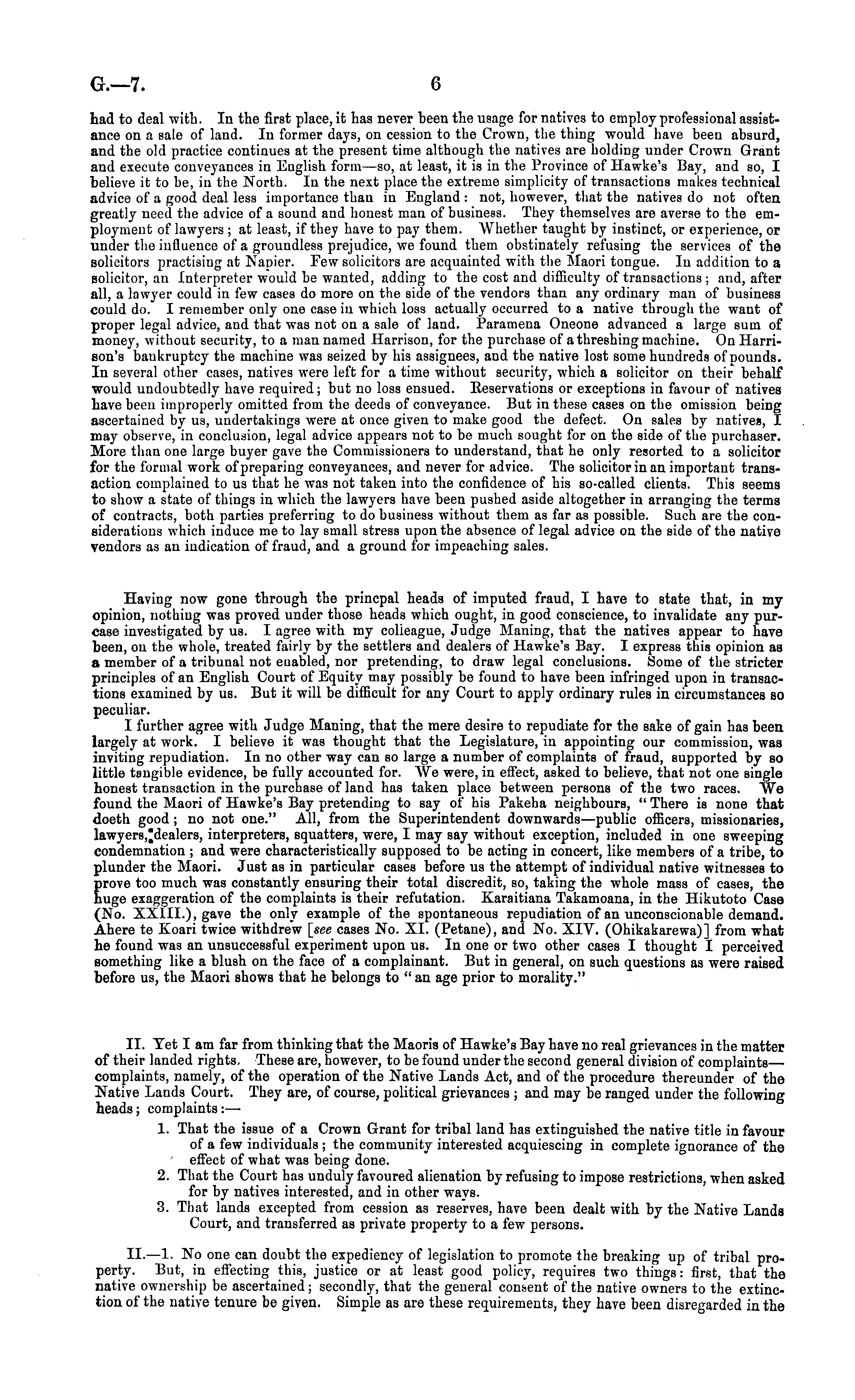 had to deal with. In the first place, it has never been the usage for natives to employ professional assistance on a sale of land. In former days, on cession to the Crown, the thing would have been absurd, and the old practice continues at the present time although the natives are holding under Crown Grant and execute conveyances in Euglish form —so, at least, it is in the Province of Hawke's Bay, and so, I believe it to be, in the North. In the next place the extreme simplicity of transactions makes technical advice of a good deal less importance than in England : not, however, that the natives do not often, greatly need the advice of a sound and honest man of business. They themselves are averse to the employment of lawyers ; at least, if they have to pay them. Whether taught by instinct, or experience, or under the influence of a groundless prejudice, we found them obstinately refusing the services of the solicitors practising at Napier. Few solicitors are acquainted with the Maori tongue. In addition to a solicitor, an Interpreter would be wanted, adding to the cost and difficulty of transactions ; and, after all, a lawyer could in few cases do more on the side of the vendors than any ordinary man of business could do. I remember only one case in which loss actually occurred to a native through the want of proper legal advice, and that was not on a sale of land. Paramena Oneone advanced a large sum of money, without security, to a man named Harrison, for the purchase of a threshing machine. On Harrison's bankruptcy the machine was seized by his assignees, and the native lost some hundreds of pounds. In several other eases, natives were left for a time without security, which a solicitor on their behalf would undoubtedly have required; but no loss ensued. Iteservations or exceptions in favour of natives Lave been improperly omitted from the deeds of conveyance. But in these cases on the omission being ascertained by us, undertakings were at once given to make good the defect. On sales by natives, I may observe, in conclusion, legal advice appears not to be much sought for on the side of the purchaser. More than one large buyer gave the Commissioners to understand, that he only resorted to a solicitor for the formal work of preparing conveyances, and never for advice. The solicitor in an important transaction complained to us that he was not taken into the confidence of his so-called clients. This seems to show a state of things in which the lawyers have been pushed aside altogether in arranging the terms of contracts, both parties preferring to do business without them as far as possible. Such are the considerations which induce me to lay small stress upon the absence of legal advice on the side of the native vendors as an indication of fraud, and a ground for impeaching sales. Having now gone through the princpal heads of imputed fraud, I have to state that, in my opinion, nothing was proved under those heads which ought, in good conscience, to invalidate any purcase investigated by us. I agree with my colleague, Judge Maning, that the natives appear to have been, on the whole, treated fairly by the settlers and dealers of Hawke's Bay. I express this opinion as a member of a tribunal not enabled, nor pretending, to draw legal conclusions. Some of the stricter principles of an English Court of Equity may possibly be found to have been infringed upon in transactions examined by us. But it will be difficult for any Court to apply ordinary rules in circumstances so peculiar. I further agree with Judge Maning, that the mere desire to repudiate for the sake of gain has been largely at work. I believe it was thought that the Legislature, in appointing our commission, was inviting repudiation. In no other way can so large a number of complaints of fraud, supported by so little tangible evidence, be fully accounted for. We were, in effect, asked to believe, that not one single honest transaction in the purchase of land has taken place between persons of the two races. We found the Maori of Hawke's Bay pretending to say of his Pakeha neighbours, " There is none that doeth good; no not one." All, from the Superintendent downwards—public officers, missionaries, lawyers,*dealers, interpreters, squatters, were, I may say without exception, included in one sweeping condemnation ; and were characteristically supposed to be acting in concert, like members of a tribe, to plunder the Maori. Just as in particular cases before us the attempt of individual native witnesses to prove too much was constantly ensuring their total discredit, so, taking the whole mass of cases, the huge exaggeration of the complaints is their refutation. Xaraitiana Takamoana, in the Hikutoto Case (No. XXIIL), gave the only example of the spontaneous repudiation of an unconscionable demand. Ahere te Koari twice withdrew [see cases No. XI. (Petane), and No. XIV. (Ohikakarewa)] from what he found was an unsuccessful experiment upon us. In one or two other cases I thought I perceived something like a blush on the face of a complainant. But in general, on such questions as were raised before us, the Maori shows that he belongs to " an age prior to morality." 11. Tet I am far from thinking that the Maoris of Hawke's Bay have no real grievances in the matter of their landed rights. These are, however, to be found under the second general division of complaints complaints, namely, of the operation of the Native Lands Act, and of the procedure thereunder of the Native Lands Court. They are, of course, political grievances ; and may be ranged under the following heads; complaints:— 1. That the issue of a Crown Grant for tribal land has extinguished the native title in favour of a few individuals ; the community interested acquiescing in complete ignorance of the effect of what was being done. 2. That the Court has unduly favoured alienation by refusing to impose restrictions, when asked for by natives interested, and in other ways.