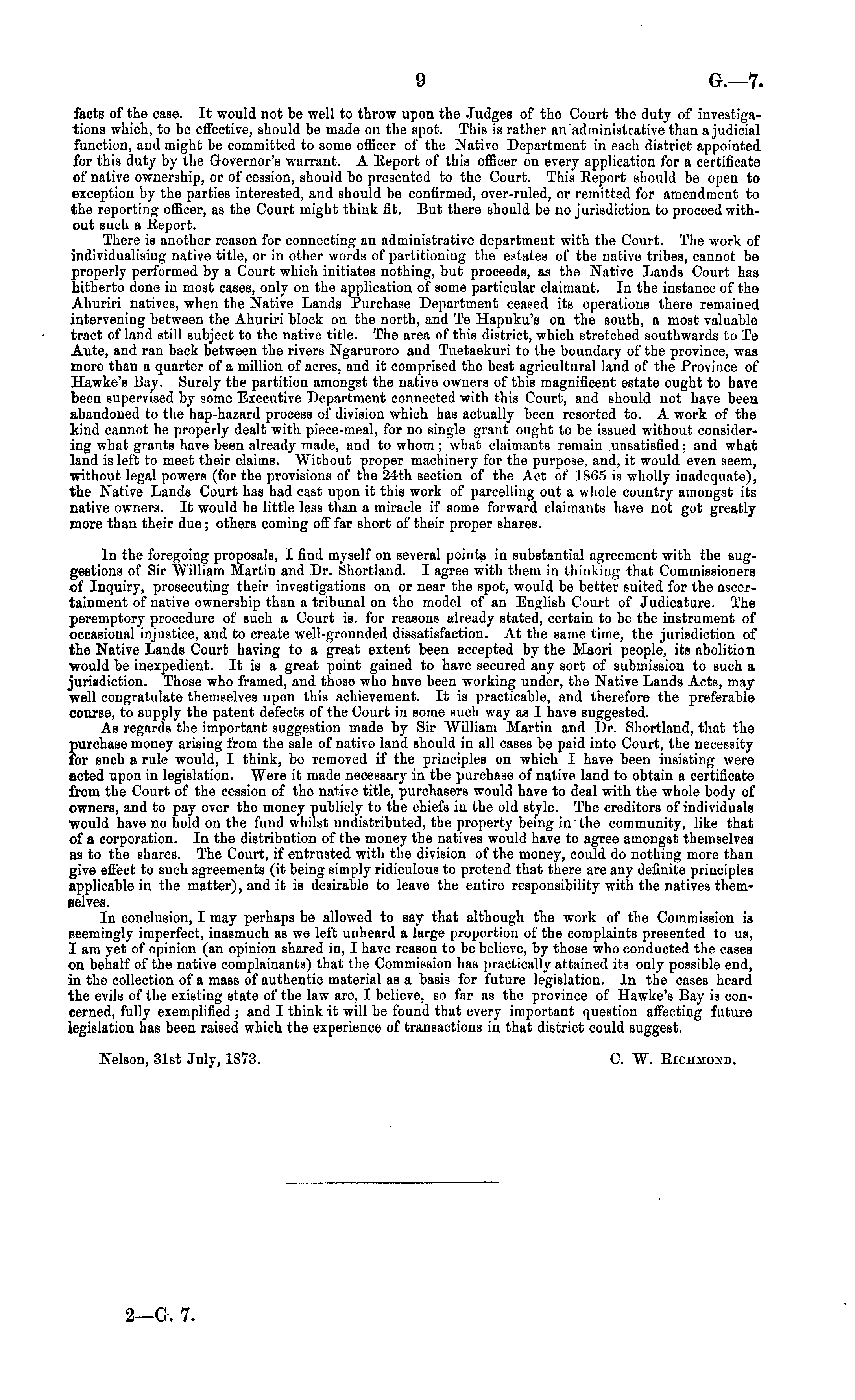 facts of the case. It would not be well to throw upon the Judges of the Court the duty of investigations which, to be effective, should be made on the spot. This is rather an administrative than ajudicial function, and might be committed to some officer of the Native Department in each district appointed for this duty by the Governor's warrant. A Eeport of this officer on every application for a certificate of native ownership, or of cession, should be presented to the Court. This Eeport should be open to exception by the parties interested, and should be confirmed, over-ruled, or remitted for amendment to the reporting officer, as the Court might tbiuk fit. But there should be no jurisdiction to proceed without such a Eeport. There is another reason for connecting an administrative department with the Court. The work of individualising native title, or in other words of partitioning the estates of the native tribes, cannot be properly performed by a Court which initiates nothing, but proceeds, as the Native Lands Court has hitherto done in most cases, only on the application of some particular claimant. In the instance of the Ahuriri natives, when the Native Lands Purchase Department ceased its operations there remained intervening between the Ahuriri block on the north, and Te Hapuku's on the south, a most valuable tract of land still subject to the native title. The area of this district, which stretched southwards to Te Aute, and ran back between the rivers Ngaruroro and Tuetaekuri to the boundary of the province, was more than a quarter of a million of acres, and it comprised the best agricultural land of the Province of Hawke's Bay. Surely the partition amongst the native owners of this magnificent estate ought to have been supervised by some Executive Department connected with this Court, and should not have been, abandoned to the hap-hazard process of division which has actually been resorted to. A work of the kind cannot be properly dealt with piece-meal, for no single grant ought to be issued without considering what grants have been already made, and to whom ; what claimants remain unsatisfied ; and what land is left to meet their claims. Without proper machinery for the purpose, and, it would even seem, without legal powers (for the provisions of the 24th section of the Act of 1865 is wholly inadequate), the Native Lands Court has had cast upon it this work of parcelling out a whole country amongst its native owners. It would be little less than a miracle if some forward claimants have not got greatly more than their due; others coming off far short of their proper shares. In the foregoing proposals, I find myself on several points in substantial agreement with the suggestions of Sir \Villiam Martin and Dr. Shortland. I agree with them in thinking that Commissioners of Inquiry, prosecuting their investigations on or near the spot, would be better suited for the ascertainment of native ownership than a tribunal on the model of an English Court of Judicature. The peremptory procedure of such a Court is. for reasons already stated, certain to be the instrument of occasional injustice, and to create well-grounded dissatisfaction. At the same time, the jurisdiction of the Native Lands Court having to a great extent been accepted by the Maori people, its abolition •would be inexpedient. It is a great point gained to have secured any sort of submission to such a jurisdiction. Those who framed, and those who have been working under, the Native Lands Acts, may well congratulate themselves upon this achievement. It is practicable, and therefore the preferable course, to supply the patent defects of the Court in some such way as I have suggested. As regards the important suggestion made by Sir "William Martin and Dr. Shortland, that the purchase money arising from the sale of native land should in all cases be paid into Court, the necessity for such a rule would, I think, be removed if the principles on which I have been insisting were acted upon in legislation. Were it made necessary in the purchase of native land to obtain a certificate from the Court of the cession of the native title, purchasers would have to deal with the whole body of owners, and to pay over the money publicly to the chiefs in the old style. The creditors of individuals would have no hold on the fund whilst undistributed, the property being in the community, like that of a corporation. In the distribution of the money the natives would have to agree amongst themselves as to the shares. The Court, if entrusted with the division of the money, could do nothing more than give effect to such agreements (it being simply ridiculous to pretend that there are any definite principles applicable in the matter), and it is desirable to leave the entire responsibility with the natives themselves. In conclusion, I may perhaps be allowed to say that although the work of the Commission is seemingly imperfect, inasmuch as we left unheard a large proportion of the complaints presented to us, I am yet of opinion (an opinion shared in, I have reason to be believe, by those who conducted the cases on behalf of the native complainants) that the Commission has practically attained its only possible end, in the collection of a mass of authentic material as a basis for future legislation. In the cases heard the evils of the existing state of the law are, I believe, so far as the province of Hawke's Bay is concerned, fully exemplified ; and I think it will be found that every important question affecting future legislation has been raised which the experience of transactions in that district could suggest. Nelson, 31st July, 1873. C. W. Eichmond. 2—G. 7.