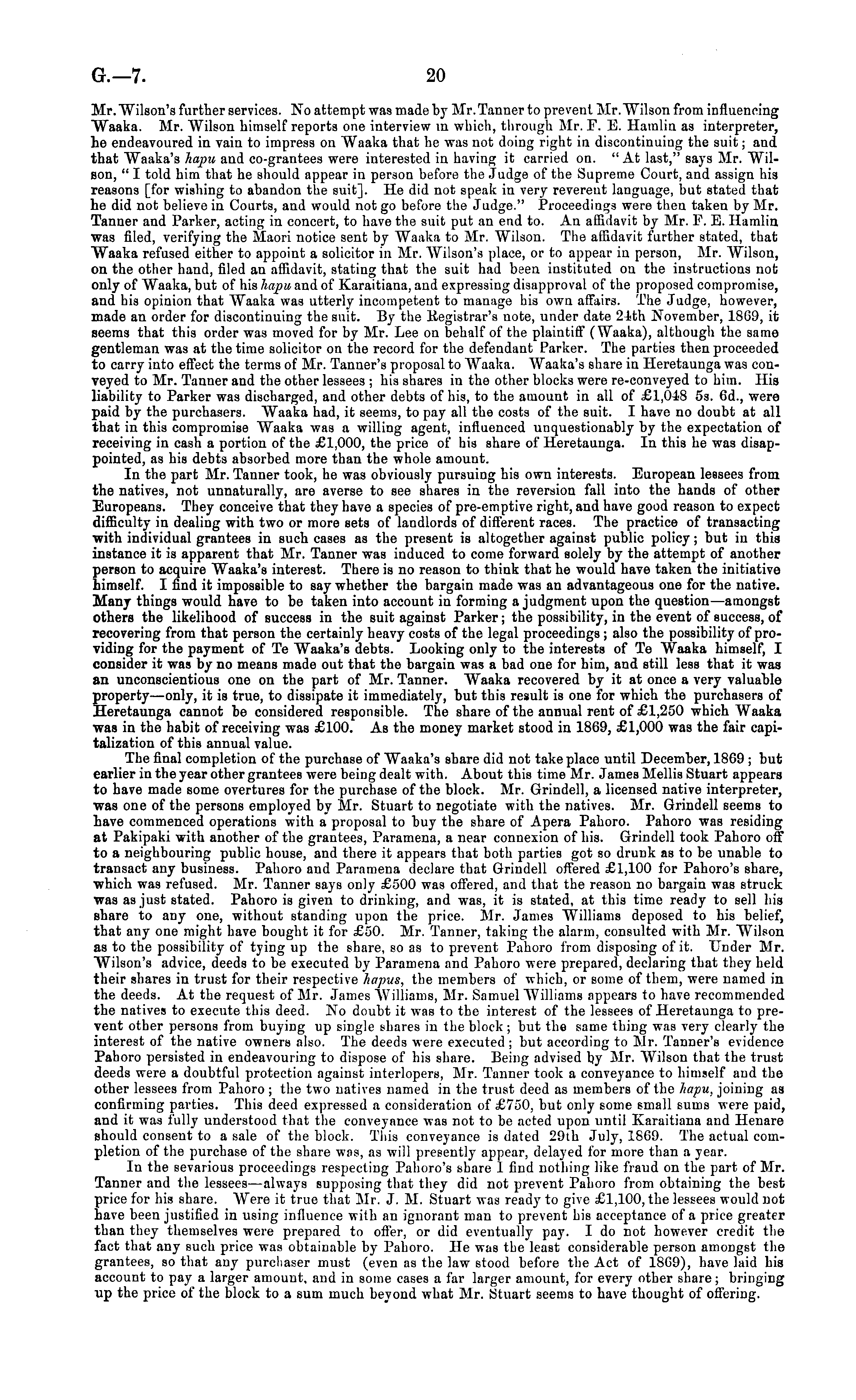 Mr. Wilson's farther services. No attempt was made by Mr. Tanner to prevent Mr. Wilson from influencing Waaka. Mr. Wilson himself reports one interview in which, through Mr. F. E. Hamlin as interpreter, he endeavoured in vain to impress on Waaka that he was not doing right in discontinuing the suit; and that Waaka's hapu and co-grantees were interested in having it carried on. "At last," says Mr. Wilson, " I told him that he should appear in person before the Judge of the Supreme Court, and assign his reasons [for wishing to abandon the suit]. He did not speak in very reverent language, but stated that he did not believe in Courts, and would not go before the Judge." Proceedings were then taken by Mr. Tanner and Parker, acting in concert, to have the suit put an end to. An affidavit by Mr. P. E. Hamlin was filed, verifying the Maori notice sent by Waaka to Mr. Wilson. The affidavit further stated, that Waaka refused either to appoint a solicitor in Mr. Wilson's place, or to appear in person, Mr. Wilson, on the other hand, filed an affidavit, stating that the suit had been instituted on the instructions not only of Waaka, but of his hapu and of Karaitiana, and expressing disapproval of the proposed compromise, and his opinion that Waaka was utterly incompetent to manage his own affairs. The Judge, however, made an order for discontinuing the suit. By the llegistrar's note, under date 2Ath November, 1869, it seems that this order was moved for by Mr. Lee on behalf of the plaintiff (Waaka), although the same gentleman was at the time solicitor on the record for the defendant Parker. The parties then proceeded to carry into effect the terms of Mr. Tanner's proposal to Waaka. Waaka's share in Heretaunga was conveyed to Mr. Tanner and the other lessees ; his shares in the other blocks were re-conveyed to him. His liability to Parker was discharged, and other debts of his, to the amount in all of £1,018 ss. 6d., were paid by the purchasers. Waaka had, it seems, to pay all the costs of the suit. I have no doubt at all that in this compromise Waaka was a willing agent, influenced unquestionably by the expectation of receiving in cash a portion of the £1,000, the price of his share of Heretaunga. In this he was disappointed, as his debts absorbed more than the whole amount. In the part Mr. Tanner took, he was obviously pursuing his own interests. European lessees from the natives, not unnaturally, are averse to see shares in the reversion fall into the hands of other Europeans. They conceive that they have a species of pre-emptive right, and have good reason to expect difficulty in dealing with two or more sets of landlords of different races. The practice of transacting ■with individual grantees in such cases as the present is altogether against public policy; but in thia instance it is apparent that Mr. Tanner was induced to come forward solely by the attempt of another person to acquire Waaka's interest. There is no reason to think that he would have taken the initiative himself. I find it impossible to say whether the bargain made was an advantageous one for the native. Many things would have to be taken into account in forming a judgment upon the question —amongst others the likelihood of success in the suit against Parker; the possibility, in the event of success, of recovering from that person the certainly heavy costs of the legal proceedings ; also the possibility of providing for the payment of Te Waaka's debts. Looking only to the interests of Te Waaka himself, I consider it was by no means made out that the bargain was a bad one for him, and still less that it was an unconscientious one on the part of Mr. Tanner. Waaka recovered by it at once a very valuable property —only, it ia true, to dissipate it immediately, but this result is one for which the purchasers of Heretaunga cannot be considered responsible. The share of the annual rent of £1,250 which Waaka ■was in the habit of receiving was £100. As the money market stood in 1869, £1,000 was the fair capitalization of this annual value. The final completion of the purchase of Waaka's share did not take place until December, 1869 ; but earlier in the year other grantees were being dealt with. About this time Mr. James Mellis Stuart appears to have made some overtures for the purchase of the block. Mr. Grindell, a licensed native interpreter, was one of the persons employed by Mr. Stuart to negotiate with the natives. Mr. Grindell seems to have commenced operations with a proposal to buy the share of Apera Pahoro. Pahoro was residing at Pakipaki with another of the grantees, Paramena, a near connexion of his. Grindell took Pahoro off to a neighbouring public house, and there it appears that both parties got so drunk as to be unable to transact any business. Pahoro and Paramena declare that Grindell offered £1,100 for Pahoro's share, which was refused. Mr. Tanner says only £500 was offered, and that the reason no bargain was struck was as just stated. Pahoro is given to drinking, and was, it is stated, at this time ready to sell his share to any one, without standing upon the price. Mr. James Williams deposed to his belief, that any one might have bought it for £50. Mr. Tanner, taking the alarm, consulted with Mr. Wilson as to the possibility of tying up the share, so as to prevent Pahoro from disposing of it. Under Mr. AVilson's advice, deeds to be executed by Paramena and Pahoro were prepared, declaring that they held their shares in trust for their respective hapus, the members of which, or some of them, were named in the deeds. At the request of Mr. James Williams, Mr. Samuel Williams appears to have recommended the natives to execute this deed. No doubt it was to the interest of the lessees of Heretaunga to prevent other persons from buying up single shares in the block; but the same thJDg was very clearly the interest of the native owners also. The deeds were executed ; but according to Mr. Tanner's evidence Pahoro