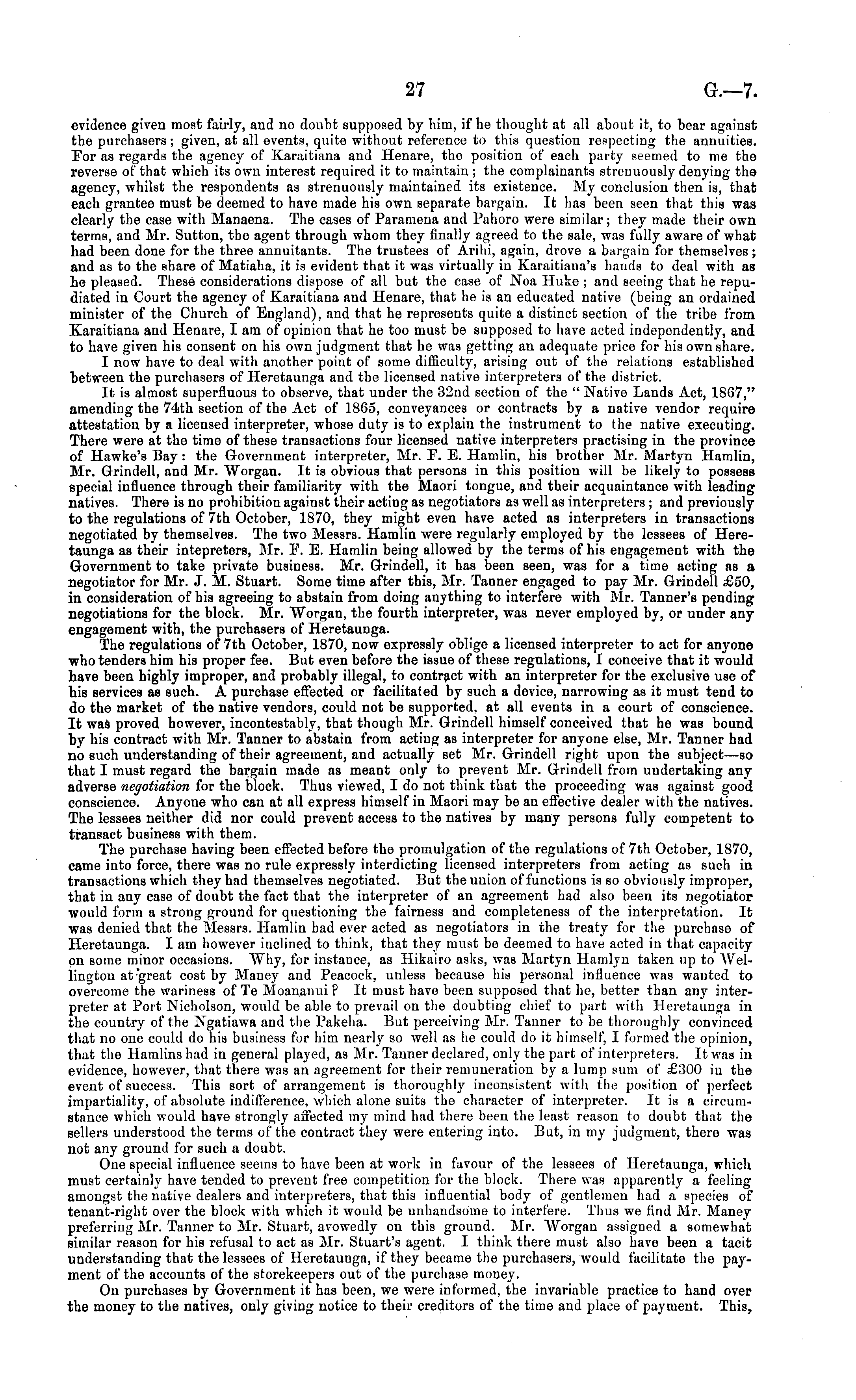 evidence given most fairly, and no doubt supposed by him, if lie thought at all about it, to bear against the purchasers ; given, at all events, quite without reference to this question respecting the annuities. For as regards the agency of Karaitiana and Henare, the position of each party seemed to me the reverse of that which its own interest required it to maintain ; the complainants strenuously denying the agency, whilst the respondents as strenuously maintained its existence. My conclusion then is, that each grantee must be deemed to have made his own separate bargain. It has been seen that this was clearly the case with Manaena. The cases of Paramena and Pahoro were similar; they made their own terms, and Mr. Sutton, the agent through whom they finally agreed to the sale, was fully aware of what had been done for the three annuitants. The trustees of Arihi, again, drove a bargain for themselves ; and as to the share of Matiaha, it is evident that it was virtually iv Karaitiana'S hands to deal with as he pleased. These considerations dispose of all but the case of Noa Huke ; and seeing that he repudiated in Court the agency of Karaitiana and Henare, that he is an educated native (being an ordained minister of the Church of England), and that he represents quite a distinct section of the tribe from Karaitiana and Henare, I am of opinion that he too must be supposed to have acted independently, and to have given his consent on hia own judgment that he was getting an adequate price for his own share. I now have to deal with another point of some difficulty, arising out of the relations established between the purchasers of Heretaunga and the licensed native interpreters of the district. It is almost superfluous to observe, that under the 32nd section of the " Native Lands Act, 1867," amending the 74th section of the Act of 1865, conveyances or contracts by a native vendor require attestation by a licensed interpreter, whose duty is to explain the instrument to the native executing. There were at the time of these transactions four licensed native interpreters practising in the province of Hawke's Bay : the Government interpreter, Mr. F. E. Hatnlin, his brother Mr. Martyn Hamlin, Mr. Grindell, and Mr. Worgan. It is obvious that persons in this position will be likely to possess special influence through their familiarity with the Maori tongue, and their acquaintance with leading natives. There is no prohibition against their acting as negotiators as well as interpreters ; and previously to the regulations of 7th October, 1870, they might even have acted as interpreters in transactions negotiated by themselves. The two Messrs. Hamlin were regularly employed by the lessees of Heretaunga as their intepreters, Mr. F. E. Hamlin being allowed by the terms of his engagement with the Government to take private business. Mr. Grindell, it has been seen, was for a time acting as a negotiator for Mr. J. M. Stuart. Some time after this, Mr. Tanner engaged to pay Mr. Grindell £50, in consideration of his agreeing to abstain from doing anything to interfere with Mr. Tanner's pending negotiations for the block. Mr. "Worgan, the fourth interpreter, was never employed by, or under any engagement with, the purchasers of Heretaunga. The regulations of 7th October, 1870, now expressly oblige a licensed interpreter to act for anyone ■who tenders him his proper fee. But even before the issue of these regulations, I conceive that it would have been highly improper, and probably illegal, to contract with an interpreter for the exclusive use of his services as such. A purchase effected or facilitated by such a device, narrowing as it must tend to do the market of the native vendors, could not be supported, at all events in a court of conscience. It was proved however, incontestable, that though Mr. Grindell himself conceived that he was bound by his contract with Mr. Tanner to abstain from acting as interpreter for anyone else, Mr. Tanner had no such understanding of their agreement, and actually set Mr. Grindell right upon the subject—so that I must regard the bargain made as meant only to prevent Mr. Grindell from undertaking any adverse negotiation for the block. Thus viewed, Ido not think that the proceeding was against good conscience. Anyone who can at all express himself in Maori may be an effective dealer with the natives. The lessees neither did nor could prevent access to the natives by many persons fully competent to transact business with them. The purchase having been effected before the promulgation of the regulations of 7th October, 1870, came into force, there was no rule expressly interdicting licensed interpreters from acting as such in transactions which they had themselves negotiated. But the union of functions is so obviously improper, that in any case of doubt the fact that the interpreter of an agreement had also been its negotiator would form a strong ground for questioning the fairness and completeness of the interpretation. It was denied that the Messrs. Hamlin bad ever acted as negotiators in the treaty for the purchase of Heretaunga. lam however inclined to think, that they must be deemed to have acted in that capacity on some minor occasions. Why, for instance, as Hikairo asks, was Martyn Hamlyn taken up to AVellington at great cost by Maney and Peacock, unless because his personal influence was wanted to overcome the wariness of Te Moananui? It must have been supposed that he, better than any interpreter at Port Nicholson, would be able to prevail on the doubting chief to part with Heretaunga in the country of the Ngatiawa and the Pakeha. But perceiving Mr. Tanner to be thoroughly convinced that no one could do his business for him nearly so well as he could do it himself, I formed the opinion, that the Hamlins had in general played, as Mr. Tanner declared, only the part of interpreters. It was in evidence, however, that there was an agreement for their remuneration by a lump s