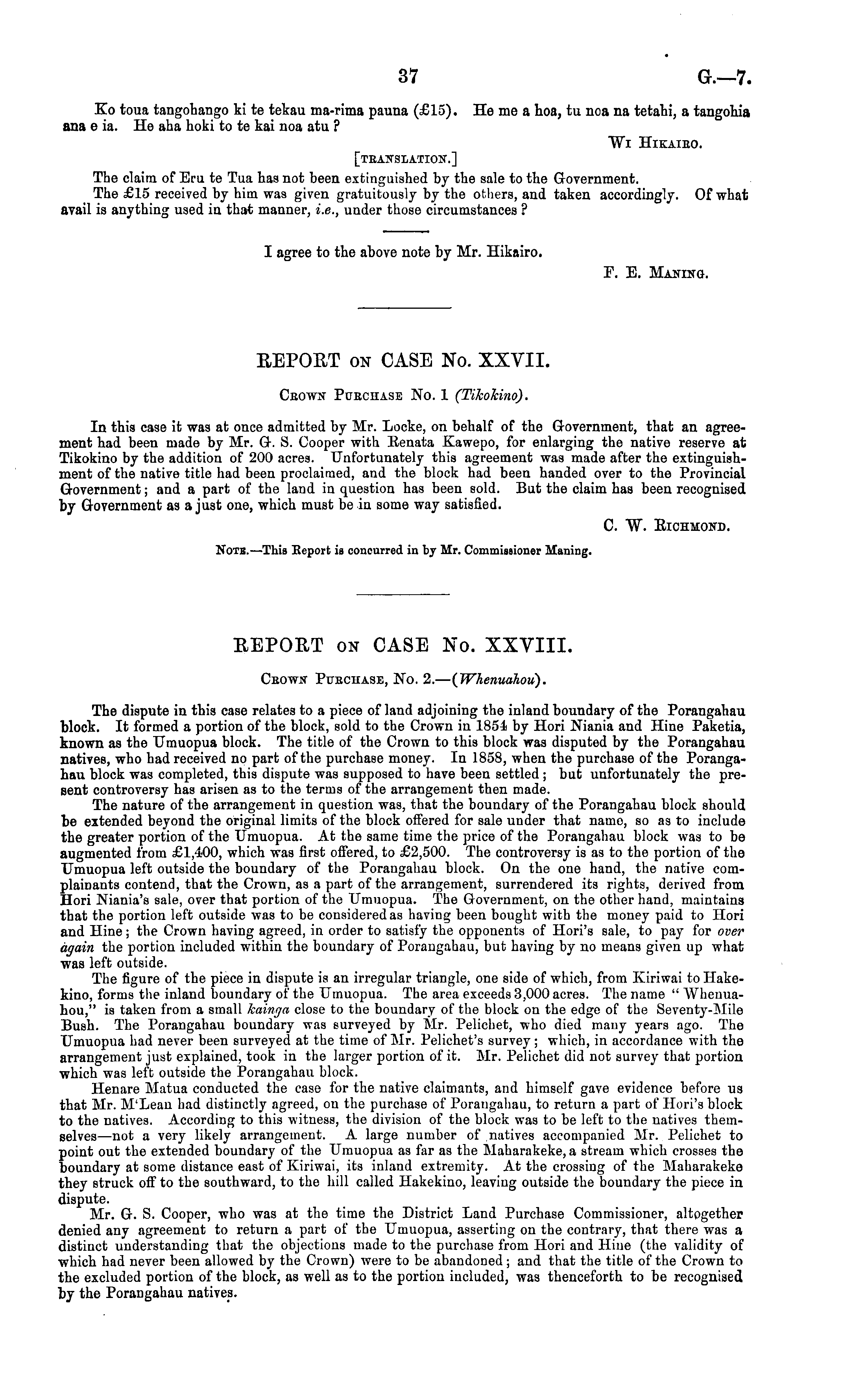 EEPORT on CASE No. XXVIII. Ceows Puechase, IS"o. 2.— (Whenuahou). The dispute in this case relates to a piece of land adjoining the inland boundary of the Porangahau block. It formed a portion of the block, sold to the Crown in 1851 by Hori Niania and Hine Paketia, known as the TJmuopua block. The title of the Crown to this block was disputed by the Porangahau natives, who had received no part of the purchase money. In 1858, when the purchase of the Porangahau block was completed, this dispute was supposed to have been settled ; but unfortunately the present controversy has arisen as to the terms of the arrangement then made. The nature of the arrangement in question was, that the boundary of the Porangahau block should be extended beyond the original limits of the block offered for sale under that namo, so as to include the greater portion of the Umuopua. At the same time the price of the Porangahau block was to be augmented from £1,400, which was first offered, to £2,500. The controversy is as to the portion of the Umuopua left outside the boundary of the Porangahau block. On the one hand, the native complainants contend, that the Crown, as a part of the arrangement, surrendered its rights, derived from Hori Niania's sale, over that portion of the Umuopua. The Government, on the other hand, maintains that the portion left outside was to be considered as having been bought with the money paid to Hori and Hine; tlie Crown having agreed, in order to satisfy the opponents of Hori's sale, to pay for over again the portion included within the boundary of Porangahau, but having by no means given up what was left outside. The figure of the piece in dispute is an irregular triangle, one side of which, from Kiriwai to Hakekino, forms the inland boundary of the Umuopua. The area exceeds 3,000 acres. The name " Whenuahou," is taken from a small Jcainc/a close to the boundary of the block on the edge of the Seventy-Mile Bush. The Porangahau boundary was surveyed by Mr. Pelichet, who died many years ago. The Umuopua had never been surveyed at the time of Mr. Pelichet's survey; which, in accordance with the arrangement just explained, took in the larger portion of it. Mr. Pelichet did not survey that portion which was left outside the Porangahau block. Henare Matua conducted the case for the native claimants, and himself gave evidence before us that Mr. M'Lean had distinctly agreed, on the purchase of Porangahau, to return a part of Hori's block to the natives. According to this witness, the division of the block was to be left to the natives themselves —not a very likely arrangement. A large number of natives accompanied Mr. Peliehet to point out the extended boundary of the Umuopua as far as the Maharakeke, a stream which crosses the boundary at some distance east of Kiriwai, its inland extremity. At the crossing of the Maharakeke they struck off to the southward, to the hill called Hakekino, leaving outside the boundary the piece in dispute. Mr. G. S. Cooper, who was at the time the District Land Purchase Commissioner, altogether denied any agreement to return a part of the Umuopua, asserting on the contrary, that there was a distinct understanding that the objections made to the purchase from Hori and Hive (the validity of which had never been allowed by the Crown) were to be abandoned; and that the title of the Crown to the excluded portion of the block, as well as to the portion included, was thenceforth to be recognised by the Porangahau natives.