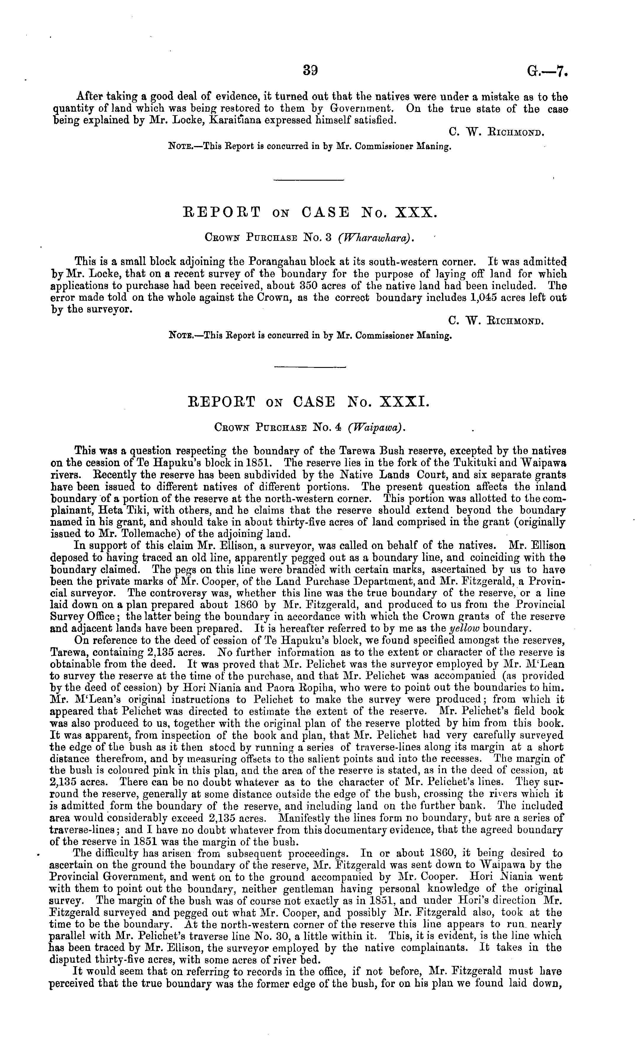 EEPOET on CASE No. XXXI. Ceown Purchase No. 4 (Waipawa). This was a question respecting the boundary of the Tarewa Bush reserve, excepted by the natives on the cession of Te Hapuku's block in 1851. The reserve lies in the fork of the Tukituki and Waipawa rivers. Eecently the reserve has been subdivided by the Native Lands Court, and sis separate grants have been issued to different natives of different portions. The present question affects the inland boundary of a portion of the reserve at the north-western corner. This portion was allotted to the complainant, Heta Tiki, with others, and he claims that the reserve should extend beyond the boundary named in his grant, and should take in about thirty-five acres of land comprised in the grant (originally issued to Mr. Tollemache) of the adjoining land. In support of this claim Mr. Ellison, a surveyor, was called on behalf of the natives. Mr. Ellison deposed to having traced an old line, apparently pegged out as a boundary line, and coinciding with the boundary claimed. The pegs on this line were branded with certain marks, ascertained by us to have been the private marks of Mr. Cooper, of the Land Purchase Department, and Mr. Fitzgerald, a Provincial surveyor. The controversy was, whether this line was the true boundary of the reserve, or a line laid down on a plan prepared about 18G0 by Mr. Fitzgerald, and produced to us from the Provincial Survey Office; the latter being the boundary in accordance with which the Crown grants of the reserve and adjacent lands have been prepared. It is hereafter referred to by me as the yellow boundary. On reference to the deed of cession of Te Hapuku's block, we found specified amongst the reserves, Tarewa, containing 2,135 acres. No further information as to the extent or character of the reserve is obtainable from the deed. It was proved that Mr. Pelichet was the surveyor employed by Mr. M'Lean to survey the reserve at the time of the purchase, and that Mr. Pelichet was accompanied (as provided by the deed of cession) by Hori Niania and Paora Eopiha, who were to point out the boundaries to him. Mr. M'Lean's original instructions to Pelichet to make the survey were produced; from which it appeared that Pelichet was directed to estimate the extent of the reserve. Mr. Pelichet's field book was also produced to us, together with the original plan of the reserve plotted by him from this book. It was apparent, from inspection of the book and plan, that Mr. Pelichet had very carefully surveyed the edge of the bush as it then stood by running a series of traverse-lines along its margin at a short distance therefrom, and by measuring offsets to the salient points and into the recesses. The margin of the bush is coloured pink in this plan, and the area of the reserve is stated, as in the deed of cession, at 2,135 acres. There can be no doubt whatever as to the character of Mr. Pelichet's lines. They surround the reserve, generally at some distance outside the edge of the bush, crossing the rivers which it is admitted form the boundary of the reserve, and including land on the further bank. The included area would considerably exceed 2,135 acres. Manifestly the lines form no boundary, but are a series of traverse-lines; and I have no doubt whatever from this documentary evidence, that the agreed boundary of the reserve in 1851 was the margin of the bush. The difficulty has arisen from subsequent proceedings. In or about 1860, it being desired to ascertain on the ground the boundary of the reserve, Mr. Fitzgerald was sent down to Waipawa by the Provincial Government, and went on to the ground accompanied by Mr. Cooper. Hori JNiania went with them to point out the boundary, neither gentleman having personal knowledge of the original survey. The margin of the bush was of course not exactly as in 1851, and under Hori's direction Mr. Fitzgerald surveyed and pegged out what Mr. Cooper, and possibly Mr. Fitzgerald also, took at the time to be the boundary. At the north-western corner of the reserve this line appears to run nearly parallel with Mr. Pelichet's traverse line No. 30, a little within it. This, it is evident, is the line which has been traced by Mr. Ellison, the surveyor employed by the native complainants. It takes in the disputed thirty-five acres, with some acres of river bed. It would seem that on referring to records in the office, if not before, Mr. Fitzgerald must have perceived that the true boundary was the former edge of the bush, for on his plan we found laid down,