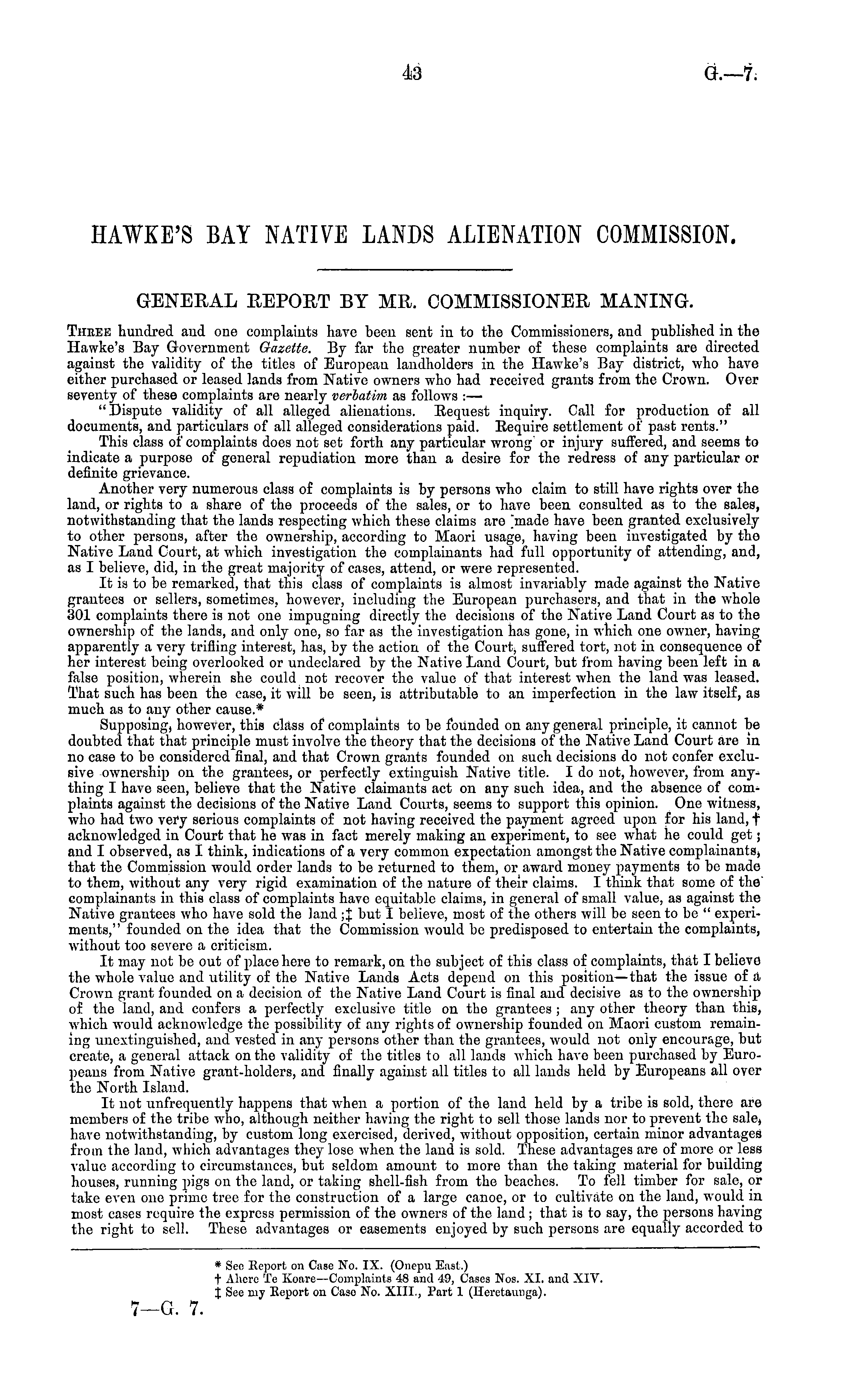 GENERAL REPORT BY MR. COMMISSIONER MANING. Three hundred and one complaints have been sent in to the Commissioners, and published in the Hawke's Bay Government Gazette. By far the greater number of these complaints are directed against the validity of the titles of European landholders in the Hawko's Bay district, who have either purchased or leased lands from Native owners who had received grants from the Crown. Over seventy of these complaints are nearly verbatim as follows :— "Dispute validity of all alleged alienations. Request inquiry. Call for production of all documents, and particulars of all alleged considerations paid. Eequire settlement of past rents." This class of complaints does not set forth any particular wrong or injury suffered, and seems to indicate a purpose of general repudiation more than a desire for the redress of any particular or definite grievance. Another very numerous class of complaints is by persons who claim to still have rights over the land, or rights to a share of the proceeds of the sales, or to have been consulted as to the sales, notwithstanding that the lands respecting which these claims are [made have been granted exclusively to other persons, after the ownership, according to Maori usage, having been investigated by tho Native Land Court, at which investigation the complainants had full opportunity of attending, and, as I believe, did, in the great majority of cases, attend, or were represented. It is to be remarked, that this class of complaints is almost invariably made against the Native grantees or sellers, sometimes, however, including the European purchasers, and that in the whole 301 complaints there is not one impugning directly tho decisions of the Native Land Court as to the ownership of the lands, and only one, so far as the investigation has gone, in which one owner, having apparently a very trifling interest, has, by the action of the Court, suffered tort, not in consequence of her interest being overlooked or undeclared by the Native Land Court, but from having been left in a false position, wherein she could not recover the value of that interest when the land was leased. That such has been the case, it will be seen, is attributable to an imperfection in the law itself, as much as to any other cause.* Supposing, however, this class of complaints to be founded on any general principle, it cannot be doubted that that principle must involve the theory that the decisions of the Native Land Court are in no case to be considered final, and that Crown grants founded on such decisions do not confer exclusive ownership on the grantees, or perfectly extinguish Native title. Ido not, however, from anything I have seen, believe that the Native claimants act on any such idea, and the absence of coinplaints against the decisions of the Native Land Courts, seems to support this opinion. One witness, who had two very serious complaints of not having received the payment agreed upon for his land, f acknowledged in Court that he was in fact merely making an experiment, to see what he could get; and I observed, as I think, indications of a very common expectation amongst tho Native complainants, that the Commission would order lands to be returned to them, or award money payments to be made to them, without any very rigid examination of the nature of their claims. I think that some of the' complainants in this class of complaints have equitable claims, in general of small value, as against the Native grantees who have sold the land ;J but I believe, most of the others will be seen to be " experiments," founded on the idea that the Commission would be predisposed to entertain the complaints, without too severe a criticism. It may not be out of place here to remark, on the subject of this class of complaints, that I believe the whole value and utility of the Native Lands Acts depend on this position—that the issue of a Crown grant founded on a decision of the Native Land Court is final and decisive as to the ownership of the land, and confers a perfectly exclusive title on the grantees ; any other theory than this, which would acknowledge the possibility of any rights of ownership founded on Maori custom remaining uncxtinguished, and vested in any persons other than the grantees, would not only encourage, but create, a general attack on the validity of the titles to all lands which have been purchased by Europeans from Native grant-holders, and finally against all titles to all lands held by Europeans all over the North Island. It not unfrequently happens that when a portion of the land held by a tribe is sold, there are members of the tribe who, although neither having the right to sell those lands nor to prevent the sale, have notwithstanding, by custom long exercised, derived, without opposition, certain minor advantages from the land, which advantages they lose when the land is sold. These advantages are of more or less value according to circumstances, but seldom amount to more than the taking material for building houses, running pigs on the land, or taking shell-fish from the beaches. To fell timber for sale, or take even one prime tree for the construction of a large canoe, or to cultivate on the land, would in most cases require the express permission of the owners of the land ; that is to say, the persons having the right to sell. These advantages or easements enjoyed by such persons are equally accorded to * See Report on Case No. IX. (Onepu East.) t A here Te Koare —Complaints 48 and 49, Cases Nos. XI. and XIV. j See my Report on Case No. XIII., Part I (Ileretaunga). 7—G. 7.
