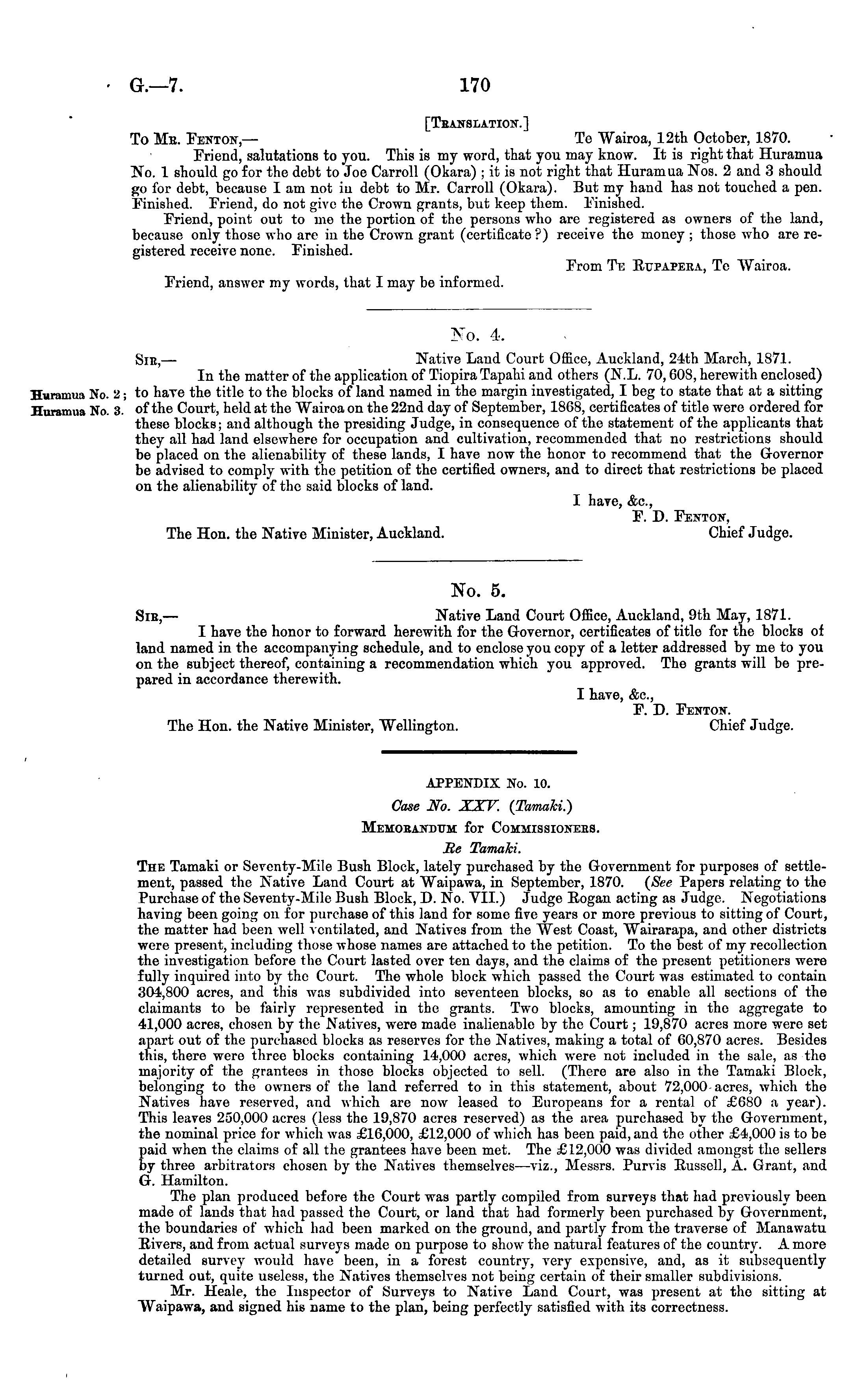 [Translation.] To Mr. Fenton,— To Wairoa, 12th October, 1870. Friend, salutations to you. This is my word, that you may know. It is right that Huramua No. 1 should go for the debt to Joe Carroll (Okara) ; it is not right that Huramua Nos. 2 and 3 should go for debt, because lam not iv debt to Mr. Carroll (Okara). But my hand has not touched a pen. Finished. Friend, do not give the Crown grants, but keep them. Finished. Friend, point out to me the portion of the persons who are registered as owners of the land, because only those who are in the Crown grant (certificate ?) receive the money ; those who are registered receive none. Finished. From Te Rtjpapera, To Wairoa. Friend, answer my words, that I may be informed.