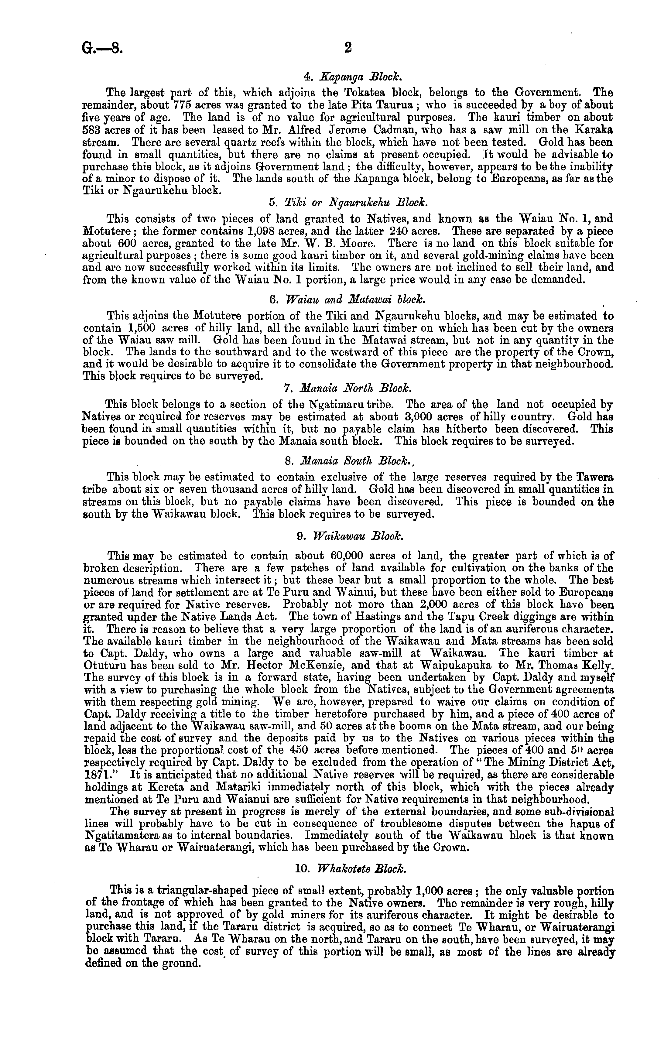 4. Kapanga Block. The largest part of this, which adjoins the Tokatea block, belongs to the Government. The remainder, about 775 acres was granted to the late Pita Taurua ; who is succeeded by a boy of about five years of age. The laud is of no value for agricultural purposes. The kauri timber on about 583 acres of it has been leased to Mr. Alfred Jerome Cadman, who has a saw mill on the Karaka stream. There are several quartz reefs within the block, which have not been tested. Gold has been found in small quantities, but there are no claims at present occupied. It would be advisable to purchase this block, as it adjoins Government land; the difficulty, however, appears to be the inability of a minor to dispose of it. The lands south of the Kapanga block, belong to Europeans, as far as the Tiki or Ngaurukehu block. 5. Tiki or Ngaurukehu Block. This consists of two pieces of land granted to Natives, and known as the Waiau No. 1, and Motutere ; the former contains 1,098 acres, and the latter 240 acres. These are separated by a piece about 600 acres, granted to the late Mr. W. B. Moore. There is no land on this block suitable for agricultural purposes ; there is some good kauri timber on it, and several gold-mining claims havo been and are now successfully worked within its limits. The owners are not inclined to sell their land, and from the known value of the Waiau No. 1 portion, a large price would in any case be demanded. G. Waiau and Matawai block. This adjoins the Motutere portion of the Tiki and Ngaurukehu blocks, and may be estimated to contain 1,500 acres of hilly land, all the available kauri timber on which has been cut by the owners of tho Waiau saw mill. Gold has been found in the Matawai stream, but not in any quantity in the block. The lands to the southward and to the westward of this piece are the property of the Crown, and it would be desirable to acquire it to consolidate the Government property in that neighbourhood. This block requires to be surveyed. 7. Manaia North Block. This block belongs to a section of the Ngatimaru tribe. The area of the land not occupied by Natives or required for reserves may be estimated at about 3,000 acres of hilly country. Gold has been found in small quantities within it, but no payable claim has hitherto been discovered. This piece is bounded on the south by the Manaia south, block. This block requires to be surveyed. 8. Manaia South Block., This block may be estimated to contain exclusive of the large reserves required by the Tawera tribe about six or seven thousand acres of hilly land. Gold has been discovered in small quantities in streams on this block, but no payable claims have been discovered. This piece is bounded on the south by the Waikawau block. This block requires to be surveyed. 9. Waikawau Block. This may be estimated to contain about 60,000 acres of land, the greater part of which is of broken description. There are a few patches of land available for cultivation on the banks of the numerous streams which intersect it; but these bear but a small proportion to the whole. The best pieces of land for settlement are at Te Puru and Wainui, but these have been either sold to Europeans or are required for Native reserves. Probably not more than 2,000 acres of this block have been granted under the Native Lands Act. The town of Hastings and the Tapu Creek diggings are within it. There is reason to believe that a very large proportion of the land is of an auriferous character. The available kauri timber in the neighbourhood of the Waikawau and Mata streams has been sold to Capt. Daldy, who owns a large and valuable saw-mill at Waikawau. The kauri timber at Otuturu has been sold to Mr. Hector McKenzie, and that at Waipukapuka to Mr. Thomas Kelly. The survey of this block is in a forward state, having been undertaken by Capt. Daldy and myself with a view to purchasing the whole block from the Natives, subject to the Government agreements with them respecting gold mining. We are, however, prepared to waive our claims on condition of Capt. Daldy receiving a title to the timber heretofore purchased by him, and a piece of 400 acres of land adjacent to the Waikawau saw-mill, and 50 acres at the booms on the Mata stream, and our being repaid the cost of survey and the deposits paid by us to the Natives on various pieces within the block, less the proportional cost of the 450 acres before mentioned. The pieces of 400 and 50 acres respectively required by Capt. Daldy to be excluded from the operation of " The Mining District Act, 1871." It is anticipated that no additional Native reserves will be required, as there are considerable holdings at Kereta and Matariki immediately north of this block, which with the pieces already mentioned at Te Puru and Waianui are sufficient for Native requirements in that neighbourhood. The survey at present in progress is merely of the external boundaries, and some sub-divisional lines will probably have to be cut in consequence of troublesome disputes between the hapus of Ngatitamatera as to internal boundaries. Immediately south of the Waikawau block is that known as Te Wharau or Wairuaterangi, which has been purchased by the Crown. 10. Whakotete Block. This is a triangular-shaped piece of small extent, probably 1,000 acres ; the only valuable portion of the frontage of which has been granted to the Native owners. The remainder is very rough, hilly land, and is not approved of by gold miners for its auriferous character. It might be desirable to purchase this land, if the Tararu district is acquired, so as to connect Te Wharau, or Wairuaterangi block with Tararu. As Te Wharau on the north, and Tararu on the south, have been surveyed, it may be assumed that the cost of survey of this portion will be small, as most of the lines are already defined on the ground.