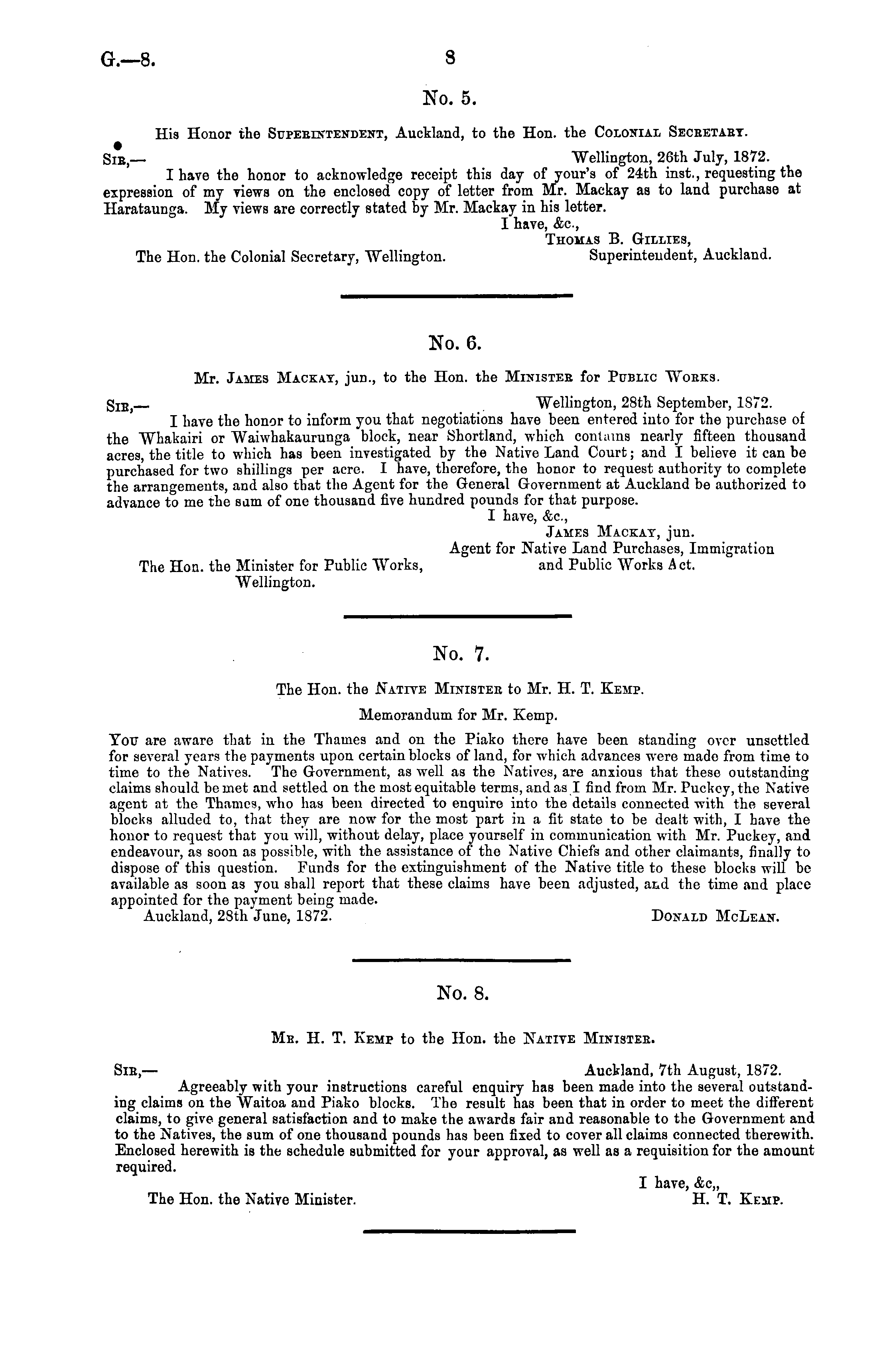 No. 7. The Hon. the Native Minister to Mr. H. T. Kemp. Memorandum for Mr. Kemp. Tou are aware that in the Thames and on the Piako there have been standing over unsettled for several years the payments upon certain blocks of land, for which advances were made from time to time to the Natives. The Government, as well as tho Natives, are anxious that these outstanding claims should be met and settled on the most equitable terms, and as I find from Mr. Puckey, the Native agent at the Thames, who has been directed to enquire into the details connected with the several blocks alluded to, that they are now for the most part in a fit state to be dealt with, I have the honor to request that you will, without delay, place yourself in communication with Mr. Puckey, and endeavour, as soon as possible, with the assistance of the Native Chiefs and other claimants, finally to dispose of this question. Funds for tho extinguishment of the Native title to these blocks will be available as soon as you shall report that these claims have been adjusted, and the time and place appointed for the payment being made. Auckland, 28th June, 1872. Donald McLean.