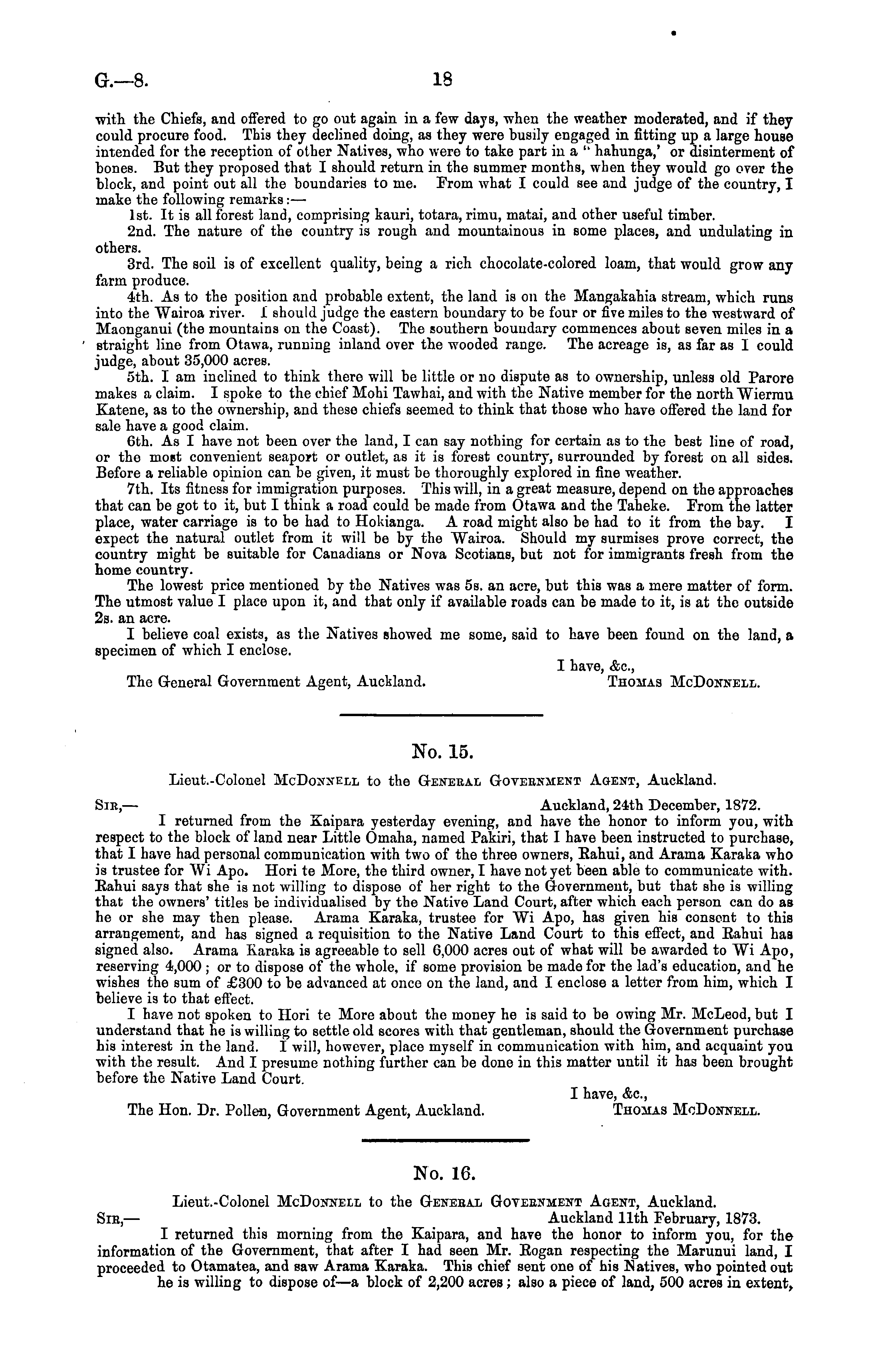 No. 16. Lieut.-Colonel McDonnell to the Genebal Government Agent, Auckland. Blß,— Auckland 11th February, 1873. I returned this morning from the Kaipara, and have the honor to inform you, for the information of the Government, that after I had seen Mr. Rogan respecting the Marunui land, I proceeded to Otamatea, and saw Arama Karaka. This chief sent one of his Natives, who pointed out he is willing to dispose of—a block of 2,200 acres ; also a piece of land, 500 acres in extent,
