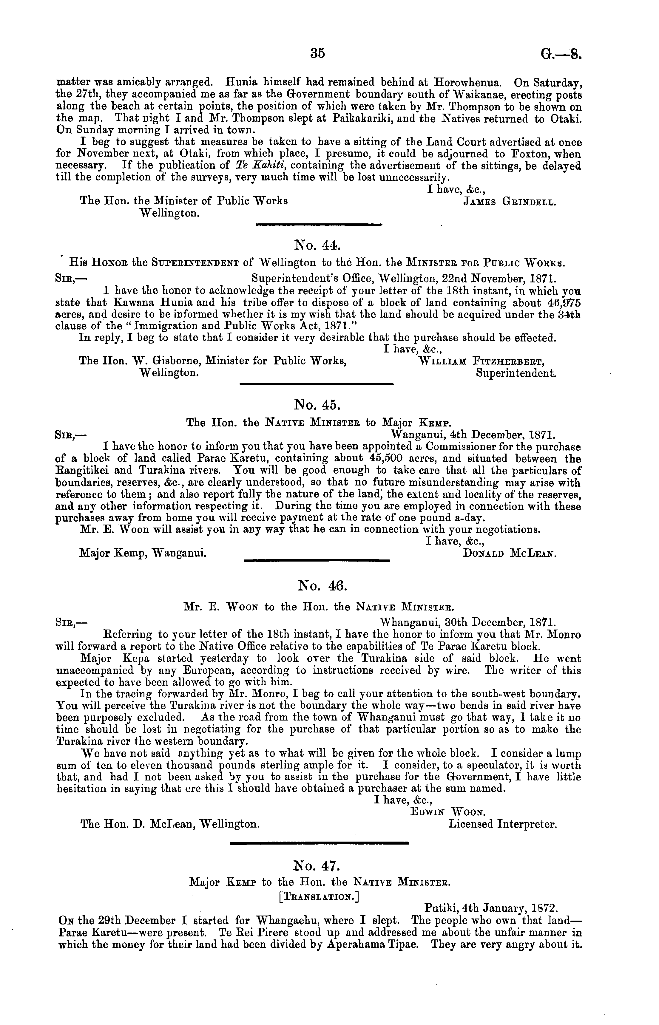 No. 46. Mr. E. Woon to the Hon. the Native Ministee. Sib, — Whanganui, 30th December, 1871. Eeferring to your letter of the 18th instant, I have the honor to inform you that Mr. Monro will forward a report to the Native Office relative to the capabilities of Te Parae Karetu block. Major Kepa started yesterday to look over the Turakina side of said block. He went unaccompanied by any European, according to instructions received by wire. The writer of this expected to have hecn allowed to go with him. In the tracing forwarded by Mr. Monro, I beg to call your attention to the south-west boundary. You will perceive the Turakina river is not the boundary the whole way —two bends in said river have been purposely excluded. As the road from the town of Whanganui must go that way, 1 take it no time should be lost in negotiating for the purchase of that particular portion so as to make the Turakina river the western boundary. We have not said anything yet as to what will be given for the whole block. I consider a lump sum of ten to eleven thousand pounds sterling ample for it. I consider, to a speculator, it is worth that, and had I not been asked by you to assist in the purchase for the Government, I have little hesitation in saying that ore this I should have obtained a purchaser at the sum named. I have, &c, Edwin Woon. The Hon. D. McLean, Wellington. Licensed Interpreter.