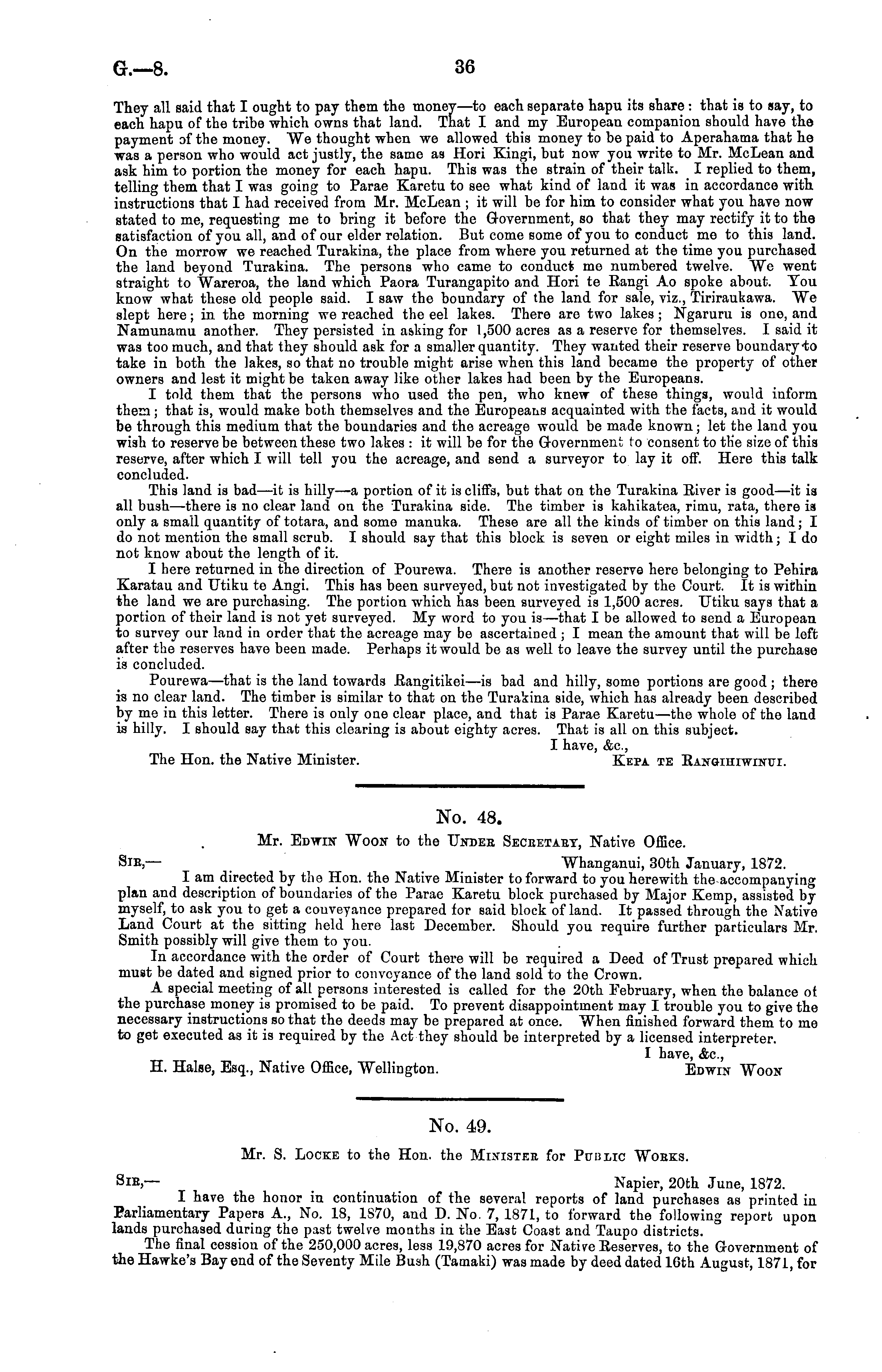 No. 49. Mr. S. Locke to the Hon. the Minister for Public Woeks. Sic,— Napier, 20th June, 1872. I have the honor in continuation of the several reports of land purchases as printed iv Parliamentary Papers A., No. 18, 1870, and D. No. 7, 1871, to forward the following report upon lands purchased during the past twelve mouths in the East Coast and Taupo districts. The final cession of the 250,000 acres, less 19,870 acres for Native Eeserves, to the Government of the Hawke's Bay end of the Seventy Mile Bush (Tamaki) was made by deed dated lGth August, 1871, for