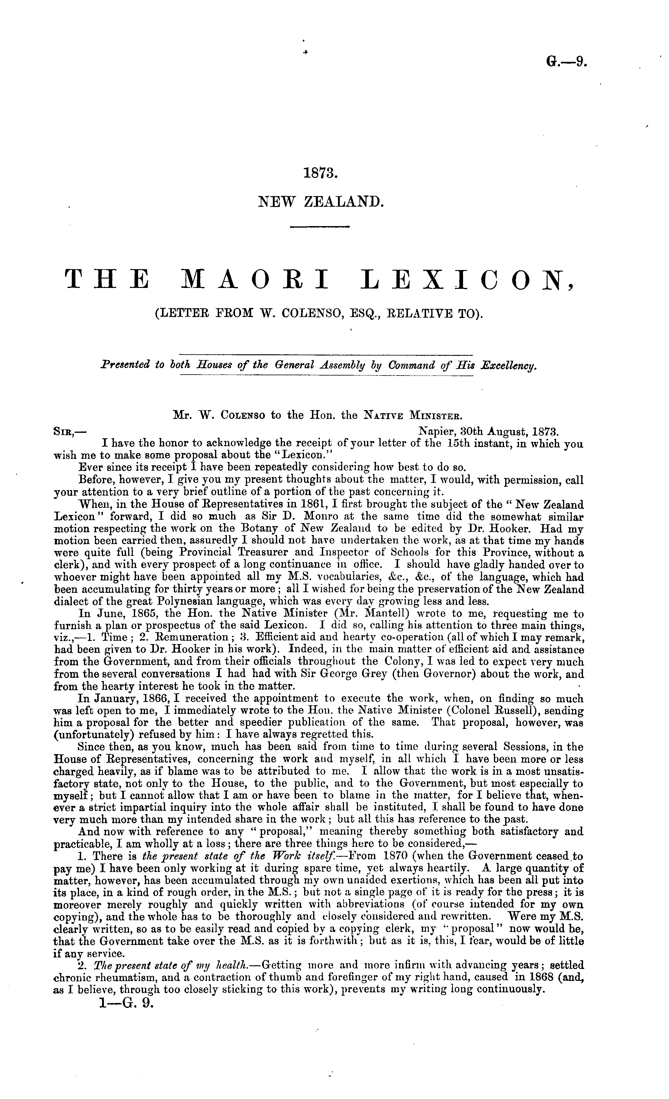 Mr. "W. Colejtso to the Hon. the Native Ministeh. Sir, — IS'apier, 30th August, 1873. I have the honor to acknowledge the receipt of your letter of the 15th instant, in which you wish me to make some proposal about the "Lexicon." Ever since its receipt I have been repeatedly considering how best to do so. Before, however, I give you my present thoughts about the matter, I would, with permission, call your attention to a very brief outline of a portion of the past concerning it. "When, in the House of Kepresentatives in 1861, I first brought the subject of the " New Zealand Lexicon" forward, I did so much as Sir D. Monro at the same time did the somewhat similar motion respecting the work on the Botany of New Zealand to be edited by Dr. Hooker. Had my motion been carried then, assuredly I should not hare undertaken the work, as at that time my hands were quite full (being Provincial Treasurer and Inspector of Schools for this Province, without a clerk), and with every prospect of a long continuance in office. I should have gladly handed over to whoever might have been appointed all my M.S. vocabularies, &c., &c, of the language, which had been accumulating for thirty years or more ; all I wished for being the preservation of the New Zealand dialect of the great Polynesian language, which was every day growing less and less. In June, 1865, the Hon. the Native Minister (Mr. Mantell) wrote to me, requesting me to furnish a plan or prospectus of the said Lexicon. I did so, calling his attention to three main things, viz.,' —1. Time; 2. Remuneration; 3. Efficient aid and hearty co-operation (all of which I may remark, had been given to Dr. Hooker in his work). Indeed, in the main matter of efficient aid and assistance from the Government, and from their officials throughout the Colony, 1 was led to expect very much from the several conversations I had had with Sir George Grey (then Governor) about the work, and from the hearty interest he took in the matter. In January, 1866, I received the appointment to execute the work, when, on finding so much was left open to me, I immediately wrote to the Hon. the Native Minister (Colonel Russell), sending him a proposal for the better and speedier publication of the same. That proposal, however, was (unfortunately) refused by him : I have always regretted this. Since then, as you know, much has been said from time to time daring several Sessions, in the House of Representatives, concerning the work and myself, in all which I have been more or less charged heavily, as if blame was to be attributed to me. I allow that the work is in a most unsatisfactory state, not only to the House, to the public, and to the Government, but most especially to myself; but I cannot allow that lam or have been to blame in the matter, for I believe that, whenever a strict impartial inquiry into the whole affair shall be instituted, I shall be found to have done very much more than my intended share in the work ; but all this has reference to the past. And now with reference to any " proposal," meaning thereby something both satisfactory and practicable, I am wholly at a loss; there are three things here to be considered, — 1. There is the present state of the Work itself'. —From 1870 (when the Government ceased to pay me) I have been only working at it during spare time, yet always heartily. A large quantity of matter, however, has been accumulated through my own unaided exertions, which has been all put into its place, in a kind of rough order, in the M.S.; hut not a single page of it is ready for the press; it is moreover merely roughly and quickly written with abbreviations (of course intended for my own copying), and the whole has to be thoroughly and closely considered and rewritten. Were my M.S. clearly written, so as to be easily read and copied by a copying clerk, my '" proposal" now would be, that the Government take over the M.S. as it is forthwith; but as it is, this, I fear, would be of little if any service. 2. The present state of my health. —Getting more and more infirm with advancing years; settled chronic rheumatism, aud a contraction of thumb and forefinger of my right hand, caused in 186S (and, as I believe, through too closely sticking to this work), prevents my writing loug continuously. I—G. 9.