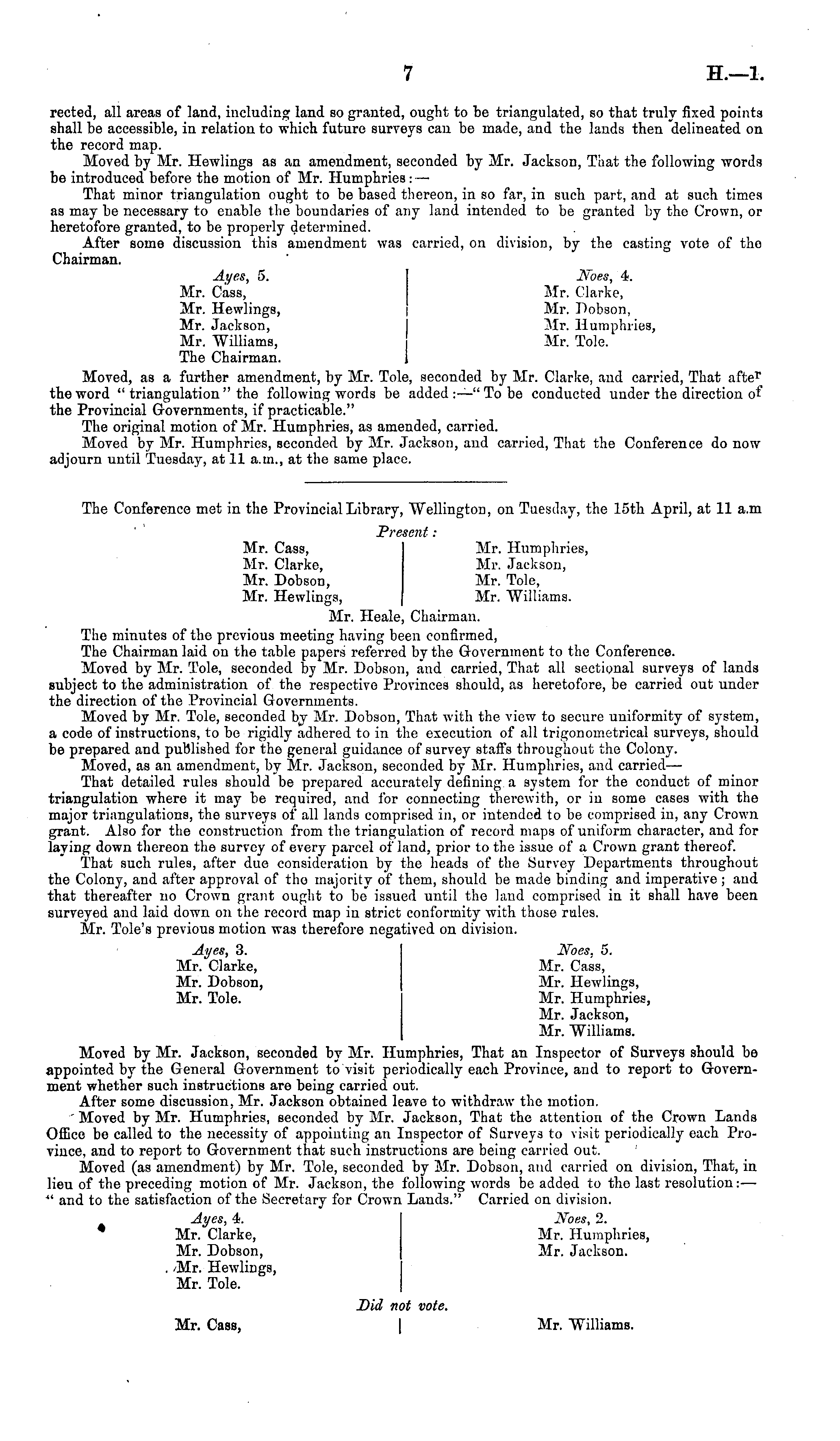 The Conference met in the Provincial Library, "Wellington, on Tuesday, the 15th April, at 11 a.m Present : Mr. Cass, Mr. Humphries, Mr. Clarke, Mr. Jackson, Mr. Dobson, Mr. Tole, Mr. Hewlings, Mr. "Williams. Mr. Heale, Chairman. The minutes of the previous meeting having been confirmed, The Chairman laid on the table papers referred by the Government to the Conference. Moved by Mr. Tole, seconded by Mr. Dobson, and carried, That .all sectional surveys of lands subject to the administration of the respective Provinces should, as heretofore, be carried out under the direction of the Provincial Governments. Moved by Mr. Tole, seconded by Mr. Dobson, That with the view to secure uniformity of system, a code of instructions, to be rigidly adhered to in the execution of all trigonometrical surveys, should be prepared and published for the general guidance of survey staffs throughout the Colony. Moved, as an amendment, by Mr. Jackson, seconded by Mr. Humphries, and carried — That detailed rules should be prepared accurately defining a system for the conduct of minor triangulation where it may be required, and for connecting therewith, or in some cases with the major triangulations, the surveys of all lands comprised in, or intended to be comprised in, any Crown grant. Also for the construction from the triangulation of record maps of uniform character, and for laying down thereon the survey of every parcel of land, prior to the issue of a Crown grant thereof. That such rules, after duo consideration by the heads of the Survey Departments throughout the Colony, and after approval of tho majority of them, should be made binding and imperative ; and that thereafter no Crown grant ought to be issued until the land comprised in it shall have been surveyed and laid down on the record map iv strict conformity with those rules. Mr. Tole's previous motion was therefore negatived on division. Ayes, 3. Noes, 5. Mr. Clarke, Mr. Cass, Mr. Dobson, Mr. Hewlings, Mr. Tole. Mr. Humphries, Mr. Jackson, Mr. "Williams. Moved by Mr. Jackson, seconded by Mr. Humphries, That an Inspector of Surveys should be appointed by the General Government to visit periodically each Province, aud to report to Government whether such instructions are being carried out. After some discussion. Mr. Jackson obtained leave to withdraw the motion. Moved by Mr. Humphries, seconded by Mr. Jackson, That the attention of the Crown Lands Office be called to the necessity of appointing an Inspector of Surveys to visit periodically each Province, and to report to Government that such instructions are being carried out. Moved (as amendment) by Mr. Tole, seconded by Mr. Dobson, and carried on division, That, in lieu of the preceding motion of Mr. Jackson, the following words be added to tho last resolution: —■ " and to the satisfaction of the Secretary for Crown Lands." Carried on division. Ayes, 4. Noes, 2. Mr. Clarke, Mr. Humphries, Mr. Dobson, Mr. Jackson. . -Mr. Hewlings, Mr. Tole. Did not vote. Mr. Cass, | Mr. "Williams.
