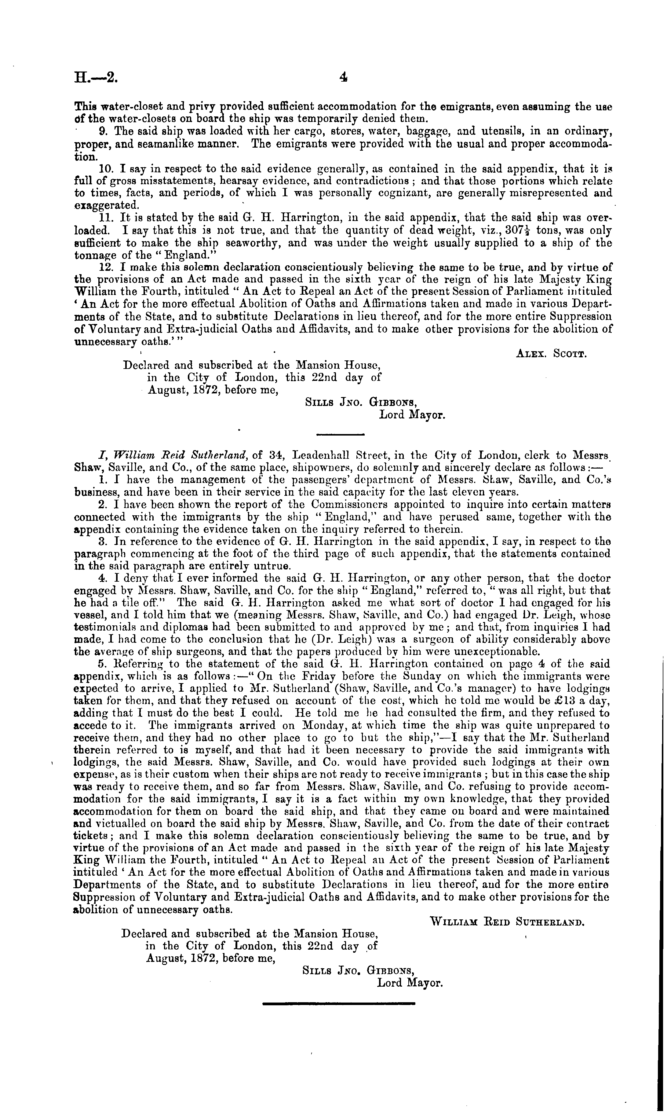 This water-closet and privy provided sufficient accommodation for the emigrants, even assuming the use of the water-closets on board the ship was temporarily denied them. 9. The said ship was loaded with her cargo, stores, water, baggage, and utensils, in an ordinary, proper, and seamanlike manner. The emigrants were provided with the usual and proper accommodation. 10. I say in respect to the said evidence generally, as contained in the said appendix, that it is full of gross misstatements, hearsay evidence, and contradictious ; and that those portions which relate to times, facts, and periods, of which I was personally cognizant, are generally misrepresented and exaggerated. 11. It is stated by the said Gr. 11. Harrington, in the said appendix, that the said ship was overloaded. I say that this is not true, and that the quantity of dead weight, viz., 307£ tons, was only sufficient to make the ship seaworthy, and was under the weight usually supplied to a ship of the tonnage of the " England." 12. I make this solemn declaration conscientiously believing the same to be true, and by virtue of the provisions of an Act made and passed in the sixth year of the reign of his late Majesty King William the Fourth, intituled " An Act to Eepeal an Act of the present Session of Parliament intituled ' An Act for the more effectual Abolition of Oaths and Affirmations taken and made in various Departments of the State, and to substitute Declarations in lieu thereof, and for the more entire Suppression of Voluntary and Extra-judicial Oaths and Affidavits, and to make other provisions for the abolition of unnecessary oaths.' " Alex. Scott. Declared and subscribed at the Mansion House, in the City of London, this 22nd day of August, 1872, before me, Sills Jso. Gibbojts, Lord Mayor. I, William Held Sutherland, of 34, Leadenhall Street, in the City of London, clerk to Messrs Shaw, Saville, and Co., of the same place, shipowners, do solemnly and sincerely declare as follows: — 1. I have the management of the passengers' department of Messrs. Shaw, Saville, and Co.'s business, and have been in their service in the said capacity for the last eleven years. 2. I have been shown the report of the Commissioners appointed to inquire into certain matters connected with the immigrants by the ship " England," and have perused same, together witli the appendix containing the evidence taken on the inquiry referred to therein. 3. In reference to the evidence of Gr. H. Harrington in the said appendix, I say, in respect to the paragraph commencing at the foot of the third page of such appendix, that the statements contained in the said paragraph are entirely untrue. 4. I deny that I ever informed the said G. H. Harrington, or any other person, that the doctor engaged by Messrs. Shaw, Saville, and Co. for the ship "England," referred to, "was all right, but that he had a tile off." The said Gr. H. Harrington asked me what sort of doctor I had engaged for his vessel, and I told him that we (meaning Messrs. Shaw, Saville, and Co.) had engaged Dr. Leigh, whose testimonials and diplomas had been submitted to and approved by me ; and that, from inquiries 1 had made, I had come to the conclusion that he (Dr. Leigh) was a surgeon of ability considerably above the average of ship surgeons, and that the papers produced by him were unexceptionable. 5. Referring to the statement of the said (i. 11. Harrington contained on page 4 of the said appendix, which is as follows : —" On the Friday before the Sunday on which the immigrants were expected to arrive, I applied to Mr. Sutherland (Shaw, Saville, and Co.'s manager) to have lodgings taken for them, and that they refused on account of the cost, which he told me would be £13 a day, adding that I must do the best I could. He told me he had consulted the firm, and they refused to accede to it. The immigrants arrived on Monday, at which time the ship was quite unprepared to receive them, and they had no other place to go to but the ship,"—l say that the Mr. Sutherland therein referred to is myself, and that had it been necessary to provide the said immigrants with lodgings, the said Messrs. Shaw, Saville, and Co. would have provided such lodgings at their own expense, as is their custom when their ships are not ready to receive immigrants ; but in this case the ship was ready to receive them, and so far from Messrs. Shaw, Saville, and Co. refusing to provide accommodation for the said immigrants, I say it is a fact within my own knowledge, that they provided accommodation for them on board the said ship, and that they came on board and were maintained and victualled on board the said ship by Messrs. Shaw, Saville, and Co. from the date of their contract tickets ; and I make this solemn declaration conscientiously believing the same to be true, and by virtue of the provisions of an Act made and passed in the sixth year of the reign of his late Majesty King William the Fourth, intituled " An Act to Repeal an Act of the present Session of Parliament intituled ' An Act for the more effectual Abolition of Oaths and Affirmations taken and made in various Departments of the State, and to substitute Declarations in lieu thereof, aud for the more entire Suppression of Voluntary and Extra-judicial Oaths and Affidavits, and to make other provisions for the abolition of unnecessary oaths. "William Reid Sutherland. Declared and subscribed at the Mansion House, , in the City of London, this 22nd day of August, 1872, before me, Sills Jno. Gibbons, Lord Mayor.