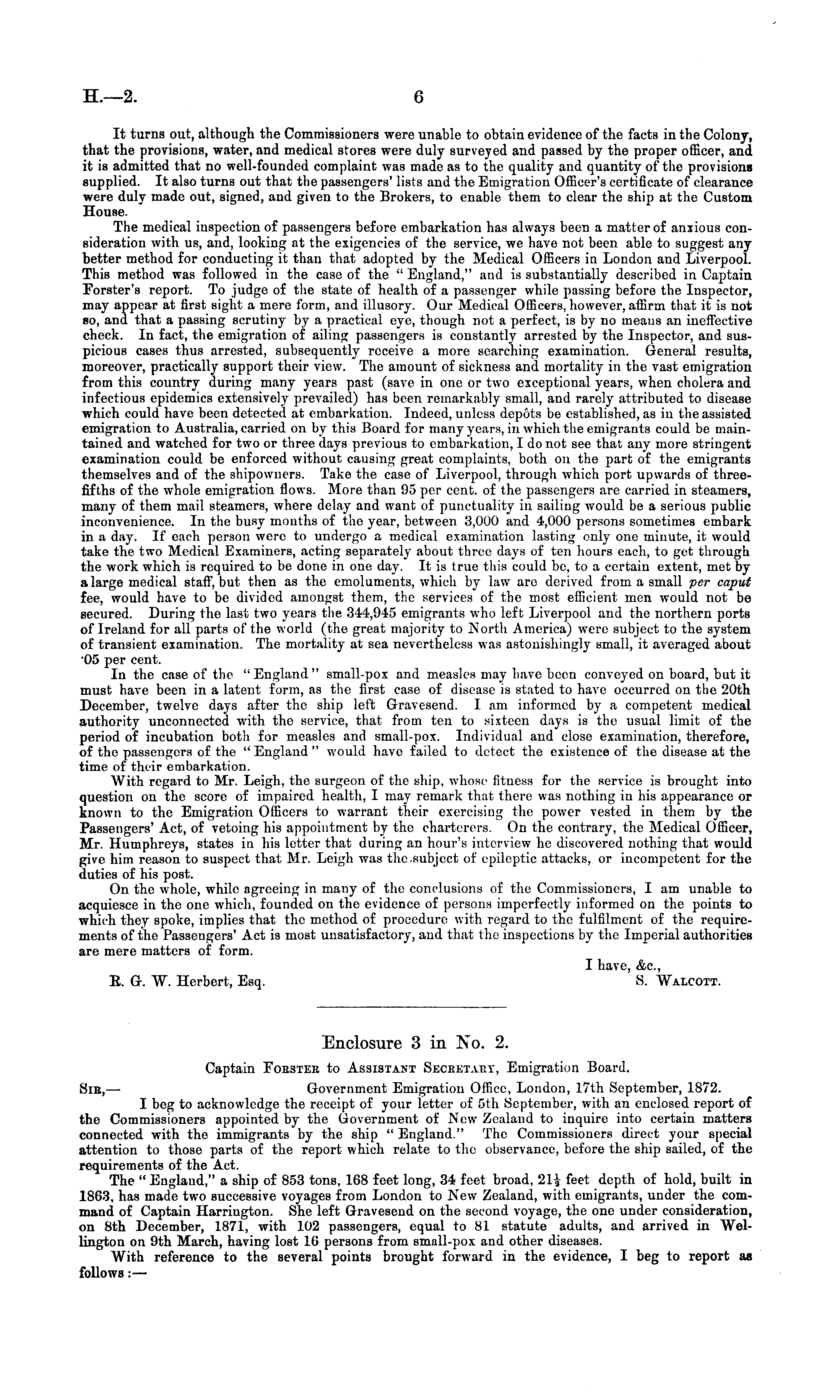 It turns out, although the Commissioners were unable to obtain evidence of the facts in the Colony, that the provisions, water, and medical stores were duly surveyed and passed by the proper officer, and it is admitted that no well-founded complaint was made as to the quality and quantity of the provisions supplied. It also turns out that the passengers' lists and the Emigration Officer's certificate of clearance were duly made out, signed, and given to the Brokers, to enable them to clear the ship at the Custom House. The medical inspection of passengers before embarkation has always been a matter of anxious consideration with us, and, looking at the exigencies of the service, we have not been able to suggest any better method for conducting it than that adopted by the Medical Officers in London and Liverpool. This method was followed in the case of the " England," and is substantially described in Captain Forster's report. To judge of the state of health of a passenger while passing before the Inspector, may appear at first sight a mere form, and illusory. Our Medical Officers, however, affirm that it is not so, and that a passing scrutiny by a practical eye, though not a perfect, is by no means an ineffective check. In fact, the emigration of ailing passengers is constantly arrested by the Inspector, and suspicious cases thus arrested, subsequently receive a more searching examination. General results, moreover, practically support their view. The amount of sickness and mortality in the vast emigration from this country during many years past (save in one or two exceptional years, when cholera and infectious epidemics extensively prevailed) has been remarkably small, and rarely attributed to disease which could have been detected at embarkation. Indeed, unless depots be established, as in the assisted emigration to Australia, carried on by this Board for many years, in which the emigrants could be maintained and watched for two or three days previous to embarkation, I do not see that any more stringent examination could be enforced without causing great complaints, both on the part of the emigrants themselves and of the shipowners. Take the case of Liverpool, through which port upwards of threefifths of the whole emigration flows. More than 95 per cent, of the passengers are carried in steamers, many of them mail steamers, where delay and want of punctuality in sailing would be a serious public inconvenience. In the busy months of the year, between 3,000 and 4,000 persons sometimes embark in a day. If each person were to undergo a medical examination lasting only one minute, it would take the two Medical Examiners, acting separately about three days of ten hours each, to get through, the work which is required to be done in one day. It is true this could bo, to a certain extent, met by a large medical staff, but then as the emoluments, which by law are derived from a small per caput fee, would have to be divided amongst them, the services of the most efficient men would not be secured. During the last two years the 344,945 emigrants who left Liverpool and the northern ports of Ireland for all parts of the world (the great majority to North America) were subject to the system of transient examination. The mortality at sea nevertheless was astonishingly small, it averaged about '05 per cent. In the case of the "England" small-pox and measles may have been conveyed on board, but it must have been in a latent form, as the first case of disease is stated to have occurred on the 20th December, twelve days after the ship left Gravesend. I am informed by a competent medical authority unconnected with the service, that from ten to sixteen days is the usual limit of the period of incubation both for measles and small-pox. Individual and close examination, therefore, of the passengers of the " England " would have failed to detect the existence of the disease at the time of their embarkation. With regard to Mr. Leigh, the surgeon of the ship, whose fitness for the service is brought into question on the score of impaired health, I may remark that there was nothing in his appearance or known to the Emigration Officers to warrant their exercising the power vested in them by the Passengers' Act, of vetoing his appointment by the charterers. On the contrary, the Medical Officer, Mr. Humphreys, states in his letter that during an hour's interview he discovered nothing that would give him reason to suspect that Mr. Leigh was the .subject of epileptic attacks, or incompetent for the duties of his post. On the whole, while agreeing in many of the conclusions of the Commissioners, I am unable to acquiesce in the one which, founded on the evidence of persons imperfectly informed on the points to which they spoke, implies that the method of procedure with regard to the fulfilment of the requirements of the Passengers' Act is most unsatisfactory, and that the inspections by the Imperial authorities are mere matters of form. I have, &c, E. G. W. Herbert, Esq. S. Walcott.
