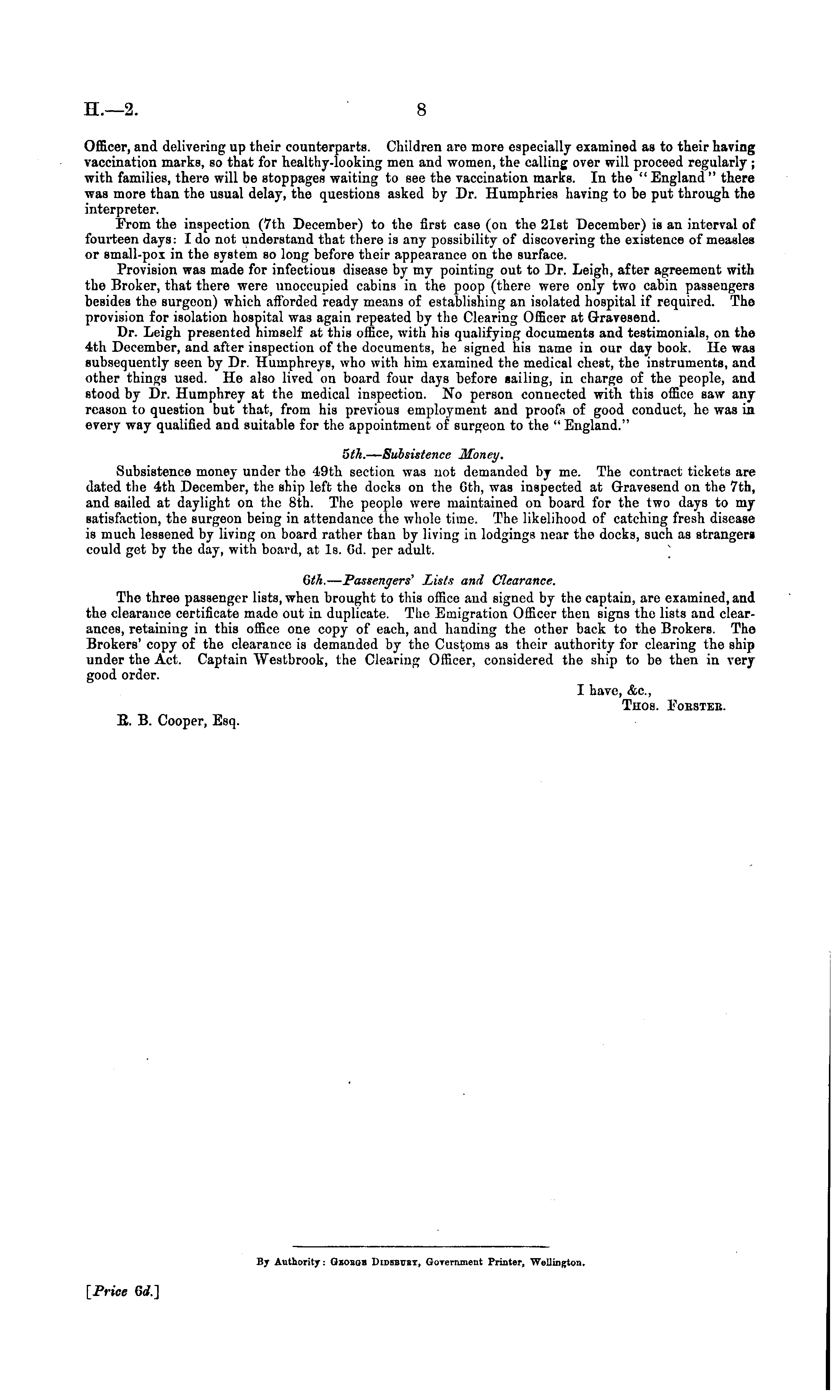 Officer, and delivering up their counterparts. Children aro more especially examined as to their having vaccination marks, so that for healthy-looking men and women, the calling over will proceed regularly ; with families, there will be stoppages waiting to see the vaccination marks. In the "England" there was more than the usual delay, the questions asked by Dr. Humphries having to be put through the interpreter. From the inspection (7th December) to the first case (on the 21st December) is an interval of fourteen days: I do not understand that there is any possibility of discovering the existence of measles or small-pox in the system so long before their appearance on the surface. Provision was made for infectious disease by my pointing out to Dr. Leigh, after agreement with the Broker, that there were unoccupied cabins in the poop (there were only two cabin passengers besides the surgeon) which afforded ready means of establishing an isolated hospital if required. The provision for isolation hospital was again repeated by the Clearing Officer at Gravesend. Dr. Leigh presented himself at this office, with his qualifying documents and testimonials, on the 4th December, and after inspection of the documents, he signed his name in our day book. He was subsequently seen by Dr. Humphreys, who with him examined the medical chest, the instruments, and other things used. He also lived on board four days before sailing, in charge of the people, and stood by Dr. Humphrey at the medical inspection. No person connected with this office saw any reason to question but that, from his previous employment and proofs of good conduct, he was in every way qualified and suitable for the appointment of surgeon to the " England." sth. — Subsistence Money. Subsistence money under the 49th section was not demanded by me. The contract tickets are dated the 4th December, the ship left the docks on the Gth, was inspected at Gravesend on the 7th, and sailed at daylight on the Bth. The people were maintained on board for the two days to my satisfaction, the surgeon being in attendance the whole time. The likelihood of catching fresh disease is much lessened by living on board rather than by living in lodgings near the docks, such as strangers could get by the day, with board, at Is. Gd. per adult. Gth. — Passengers' Lists and Clearance. The three passenger lists, when brought to this office and signed by the captain, are examined, and the clearance certificate made out in duplicate. The Emigration Officer then signs the lists and clearances, retaining in this office one copy of each, and handing the other back to the Brokers. The Brokers' copy of the clearance is demanded by the Customs as their authority for clearing the ship under the Act. Captain Westbrook, the Clearing Officer, considered the ship to be then in very good order. I have, &c., Thoh. Foesteh. E. B. Cooper, Esq. Bj Authority: Oiossa Didsbbkt, GoTernment Printer, Wellington. [Price Gd.]