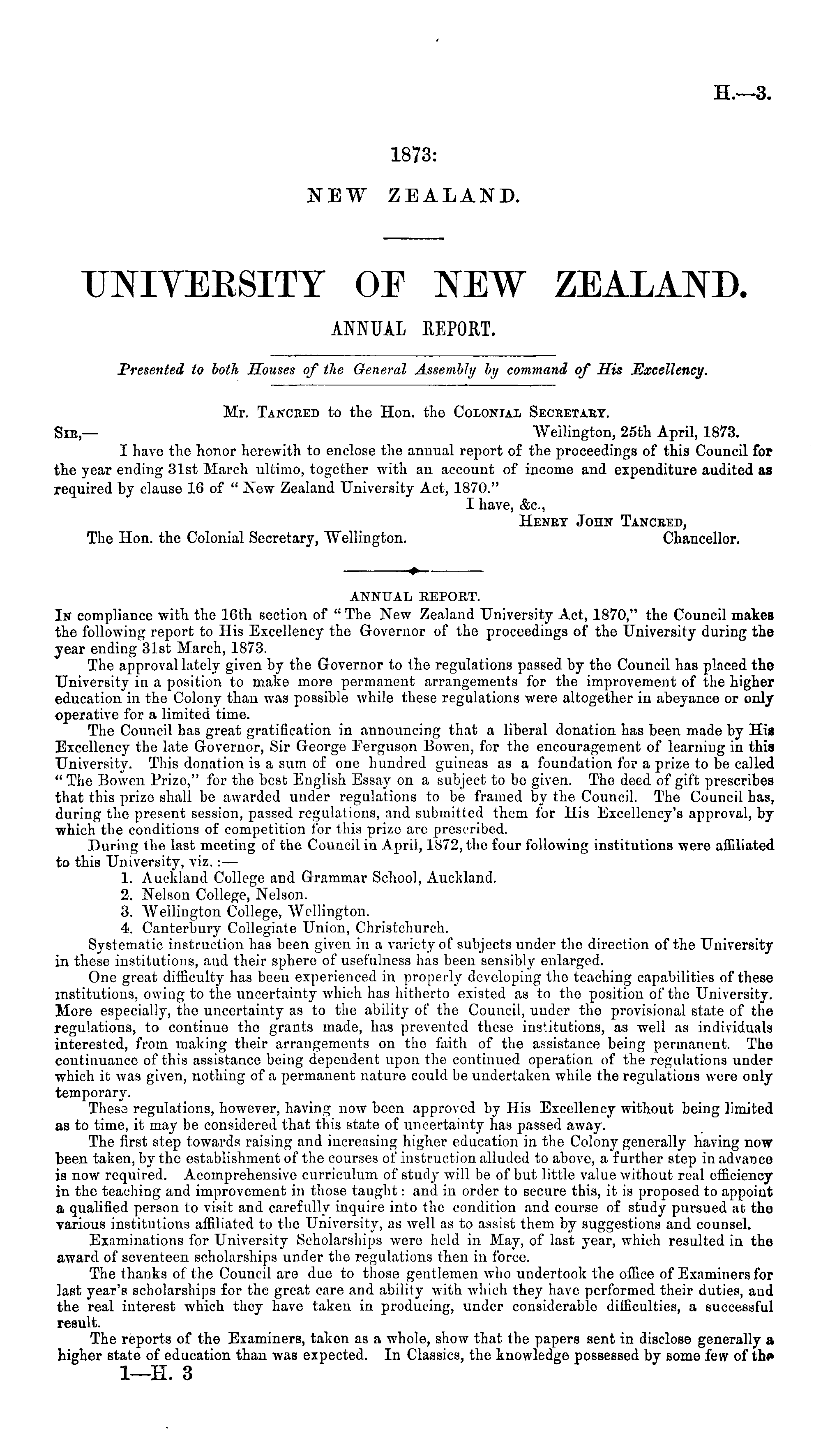ANNUAL REPORT. In compliance with the 16th section of " The New Zealand University Act, 1870," the Council makeß the following report to His Excellency the Governor of the proceedings of the University during the year ending 31st March, 1873. The approval lately given by the Governor to the regulations passed by the Council has placed the University in a position to make more permanent arrangements for the improvement of the higher education in the Colony than was possible while these regulations were altogether in abeyance or only operative for a limited time. The Council has great gratification in announcing that a liberal donation has been made by His Excellency the late Governor, Sir George Ferguson Bowen, for the encouragement of learning in this University. This donation is a sum of one hundred guineas as a foundation for a prize to be called " The Bowen Prize," for the best English Essay on a subject to be given. The deed of gift prescribes that this prize shall be awarded under regulations to be framed by the Council. The Council has, during the present session, passed regulations, and submitted them for His Excellency's approval, by ■which the conditions of competition for this prize are prescribed. During the last meeting of the Council in April, 1872, the four following institutions were affiliated to this University, viz.: — 1. Auckland College and Grammar School, Auckland. 2. Nelson College, Nelson. 3. Wellington College, Wellington. 4. Canterbury Collegiate Union, Christchurch. Systematic instruction has been given in a variety of subjects under the direction of the University in these institutions, and their sphere of usefulness has been sensibly enlarged. One great difficulty has been experienced in properly developing the teaching capabilities of these institutions, owing to the uncertainty which has hitherto existed as to tho position of the University. More especially, the uncertainty as to the ability of the Council, under the provisional state of the regulations, to continue the grants made, has prevented these institutions, as well as individuals interested, from making their arrangements on the faith of the assistance being permanent. The continuance of this assistance being dependent upon the continued operation of the regulations under which it was given, nothing of a permanent nature could be undertaken while the regulations were only temporary. Thesa regulations, however, having now been approved by His Excellency without being limited as to time, it may be considered that this state of uncertainty has passed away. The first step towards raising and increasing higher education in the Colony generally having now been taken, by the establishment of the courses of instruction alluded to above, a further step in advance is now required. Acomprehensivo curriculum of study will bo of but little value without real efficiency in the teaching and improvement in those taught: and in order to secure this, it is proposed to appoint a qualified person to visit and carefully inquire into the condition and course of study pursued at the various institutions affiliated to the University, as well as to assist them by suggestions and counsel. Examinations for University Scholarships were held in May, of last year, which resulted in the award of seventeen scholarships under the regulations then in force. The thanks of the Council are due to those geutlemen who undertook the office of Examiners for last year's scholarships for the great care and ability with which they have performed their duties, and the real interest which they have taken in producing, under considerable difficulties, a successful result. The reports of the Examiners, taken as a whole, show that the papers sent in disclose generally a higher state of education than was expected. In Classics, the knowledge possessed by some few of th«> I—E. 3