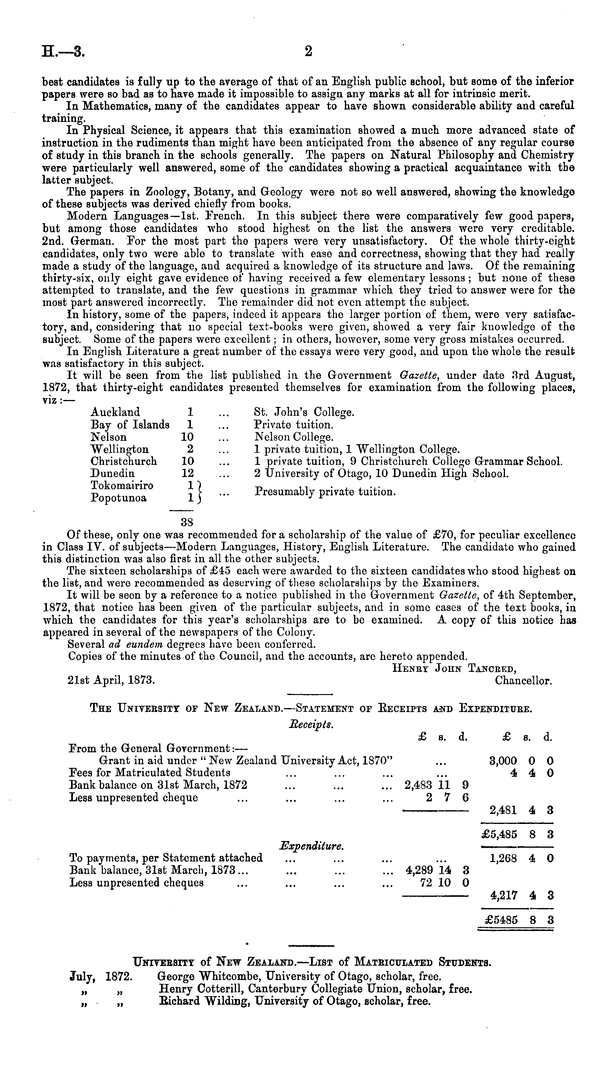 best candidates is fully up to the average of that of an English public school, but some of the inferior papers were so bad as to have made it impossible to assign any marks at all for intrinsic merit. In Mathematics, many of the candidates appear to have shown considerable ability and careful training. In Physical Science, it appears that this examination showed a much more advanced state of instruction in the rudiments than might have been anticipated from the absence of any regular course of study in this branch in the schools generally. The papers on Natural Philosophy and Chemistry were particularly well answered, some of the candidates showing a practical acquaintance with tbe latter subject. The papers in Zoology, Botany, and Geology were not so well answered, showing the knowledge of these subjects was derived chiefly from books. Modern Languages —Ist. Trench. In this subject there were comparatively few good papers, but among those candidates who stood highest on the list the answers were very creditable. 2nd. German. Tor the most part the papers were very unsatisfactory. Of the whole thirty-eight candidates, only two were able to translate with ease and correctness, showing that they had really made a study of the language, and acquired a knowledge of its structure and laws. Of the remaining thirty-six, only eight gave evidence of having received a few elementary lessons ; but none of these attempted to translate, and the few questions in grammar which they tried to answer were for the most part answered incorrectly. The remainder did not even attempt the subject. In history, some of the papers, indeed it appears the larger portion of them, were very satisfactory, and, considering that no special test-books were given, showed a very fair knowledge of the subject. Some of the papers were excellent; in others, however, some very gross mistakes occurred. In English Literature a great number of the essays were very good, and upon the whole the result was satisfactory in this subject. It will be seen from the list published in the Government Gazette, under date 3rd August, 1872, that thirty-eight candidates presented themselves for examination from the following places, viz :— Auckland 1 ... St. John's College. Bay of Islands 1 ... Private tuition. Nelson 10 ... Nelson College. Wellington 2 ... 1 private tuition, 1 Wellington College. Christchurch 10 ... 1 private tuition, 9 Christchurch College Grammar School. Dunedin 12 ... 2 University of Otago, 10 Dunedin High School. Tokomairiro 1) -n n , ~. Popotunoa lj - Presumably private tuition. 38 Of these, only one was recommended fora scholarship of the value of £70, for peculiar excellence in Class IV. of subjects —Modern Languages, History, English Literature. The candidate who gained this distinction was also first in all the other subjects. The sixteen scholarships of £45 each were awarded to the sixteen candidates who stood highest on the list, and were recommended as deserving of these scholarships by the Examiners. It will be seen by a reference to a notice published in the Government Gazette, of 4th September, 1872, that notice has been given of the particular subjects, and in some cases of the text books, in which the candidates for this year's scholarships are to be examined. A copy of this notice has appeared in several of the newspapers of the Colony. Several ad eundem degrees have been conferred. Copies of the minutes of the Council, and the accounts, are hereto appended. Henby John Tanceed, 21st April, 1873. Chancellor. The Uniyeesitt of New Zealand.—Statement of Eeceipts and Expendituee. Receipts. £ s. d. £ s. d. Prom the General Government:— Grant in aid under " New Zealand University Act, 1870" ... 3,000 0 0 Pees for Matriculated Students ... ... ... ... 4 4 0 Bank balance on 31st March, 1872 ... ... ... 2,483 11 9 Less unpresented cheque ... ... ... ... 276 2,481 4 3 £5,485 8 3 Expenditure. To payments, per Statement attached ... ... ... ... 1,2G8 4 0 Bank balance, 31st March, 1873... ... ... ... 4,289 14 3 Less unpresented cheques ... ... ... ... 72 10 0 4,217 4 3 £5485 8 3 Umiveesity of New Zealand. —List of Matriculated Students. July, 1872. George Whitcombe, University of Otago, scholar, free. „ „ Henry Cotterill, Canterbury Collegiate Union, scholar, free. „ „ Eichard Wilding, University of Otago, scholar, free.