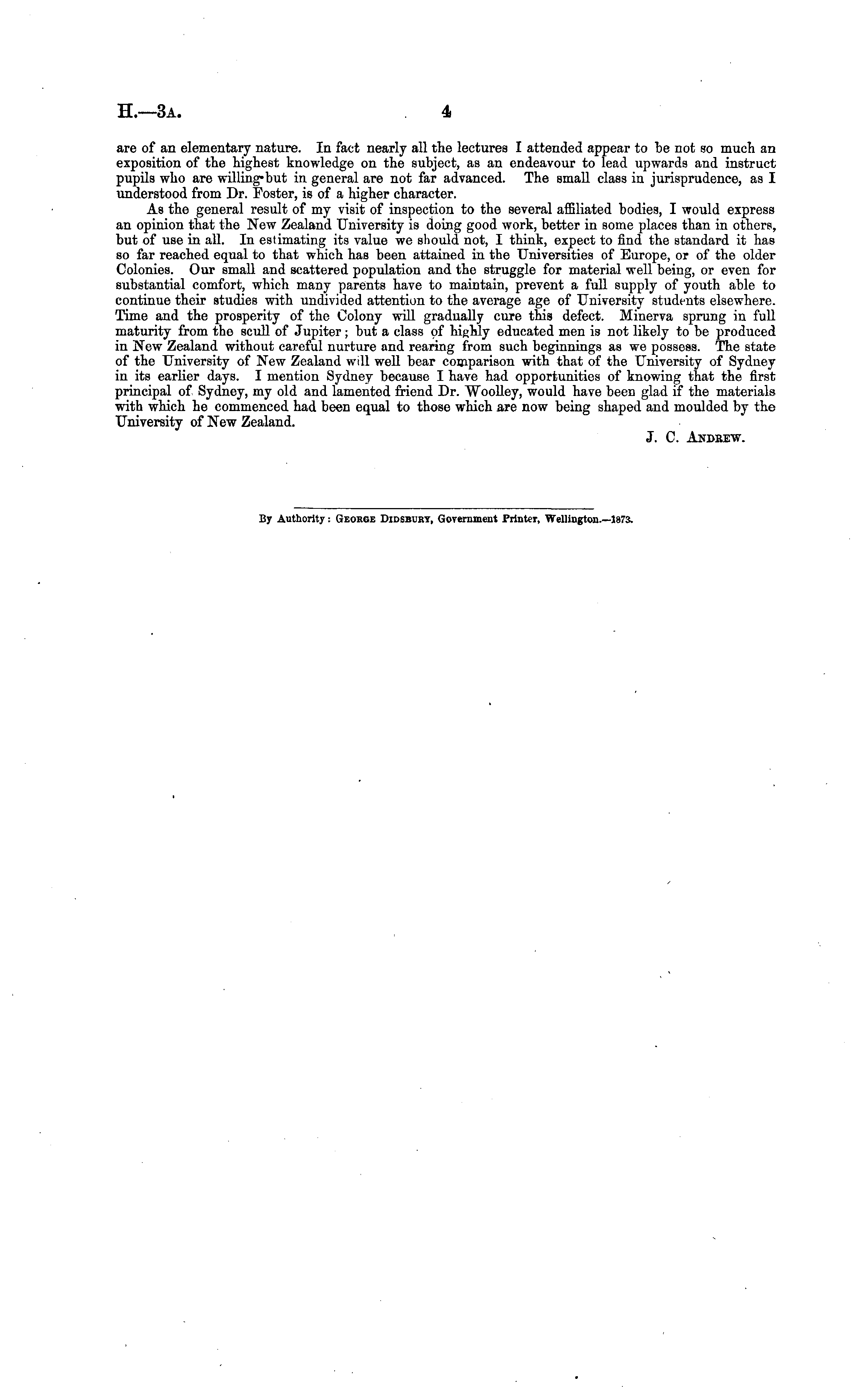 are of an elementary nature. In fact nearly all the lectures I attended appear to be not so much au exposition of the highest knowledge on the subject, as an endeavour to lead upwards and instruct pupils who are willing-but in general are not far advanced. The small class in jurisprudence, as I understood from Dr. Poster, is of a higher character. As the general result of my visit of inspection to the several affiliated bodies, I would express an opinion that the New Zealand University is doing good work, better in some places than in others, but of use in all. In estimating its value we should not, I think, expect to find the standard it has so far reached equal to that which has been attained in the Universities of Europe, or of the older Colonies. Our small and scattered population and the struggle for material well being, or even for substantial comfort, which many parents have to maintain, prevent a full supply of youth able to continue their studies with undivided attention to the average age of University students elsewhere. Time and the prosperity of the Colony will gradually cure this defect. Minerva sprung in full maturity from the scull of Jupiter ; but a class of highly educated men is not likely to be produced in New Zealand without careful nurture and rearing from such beginnings as we possess. The state of the University of New Zealand wdl well bear comparison with that of the University of Sydney in its earlier days. I mention Sydney because I have had opportunities of knowing that the first principal of Sydney, my old and lamented friend Dr. "Woolley, would have been glad if the materials with which he commenced had been equal to those which are now being shaped and moulded by the University of New Zealand. J. C. Andrew. B7 Authority: George Didsbury, Government Printer, Wellington.—l 373.