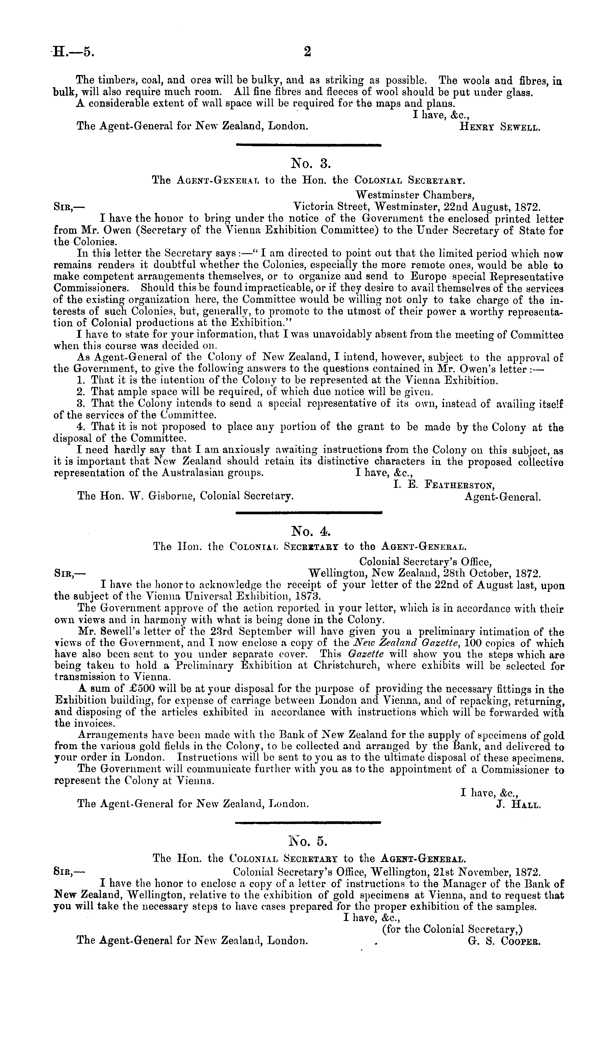 No. 5. The Hon. the Colonial Secbetaby to the Agestt-Geneeal. Sir, — Colonial Secretary's Office, "Wellington, 21st November, 1872. I have the honor to enclose a copy of a letter of instructions to the Manager of the Bank of New Zealand, Wellington, relative to the exhibition of gold specimens at Vienna, and to request that you will take the necessary steps to have cases prepared for the proper exhibition of the samples. I liave, &c, (for the Colonial Secretary,) The Agent-General for New Zealand, London. . G. 8. Coopee.