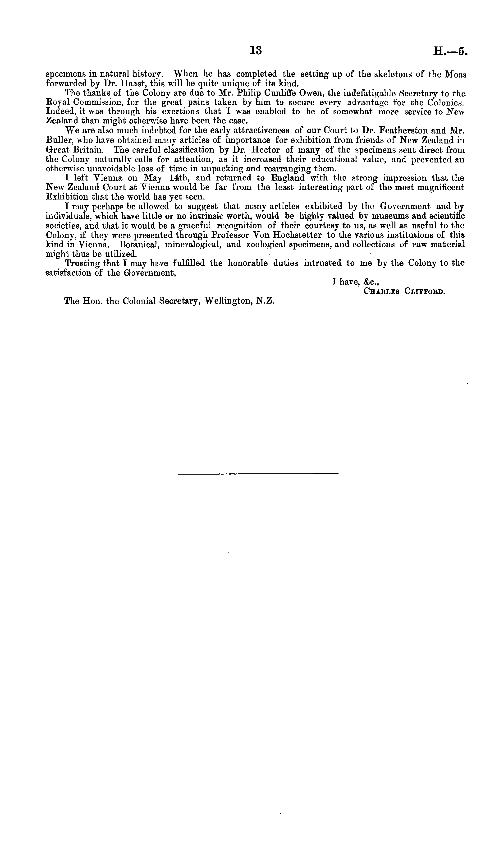 specimens in natural history. When he has completed the setting up of the skeletons of the Moas forwarded by Dr. Haast, this will be quite unique of its kind. The thanks of the Colony are due to Mr. Philip Cunliffe Owen, the indefatigable Secretary to the Koyal Commission, for the great pains taken by him to secure every advantage for the Colonies'. Indeed, it was through his exertions that I was enabled to be of somewhat more service to New Zealand than might otherwise have been the case. We are also much indebted for the early attractiveness of our Court to Dr. Featherston and Mr. Buller, who have obtained many articles of importance for exhibition from friends of New Zealand in Great Britain. The careful classification by Dr. Hector of many of the specimens sent direct from the Colony naturally calls for attention, as it increased their educational value, and prevented an otherwise unavoidable loss of time in unpacking and rearranging them. I left Vienna on May 11th, and returned to England with the strong impression that the New Zealand Court at Vienna would be far from the least interesting part of the most magnificent Exhibition that the world has yet seen. I may perhaps be allowed to suggest that many articles exhibited by the Government and by individuals, which have little or no intrinsic worth, would be highly valued by museums and scientific societies, and that it would be a graceful recognition of their courtesy to us, as well as useful to the Colony, if they were presented through Professor Yon Hochstetter to the various institutions of this kind in Vienna. Botanical, inineralogical, and zoological specimens, and collections of raw material might thus be utilized. Trusting that I may have fulfilled the honorable duties intrusted to me by the Colony to the satisfaction of the Government, I have, &c, Charles CLirroaD. The Hon. the Colonial Secretary, Wellington, N.Z.