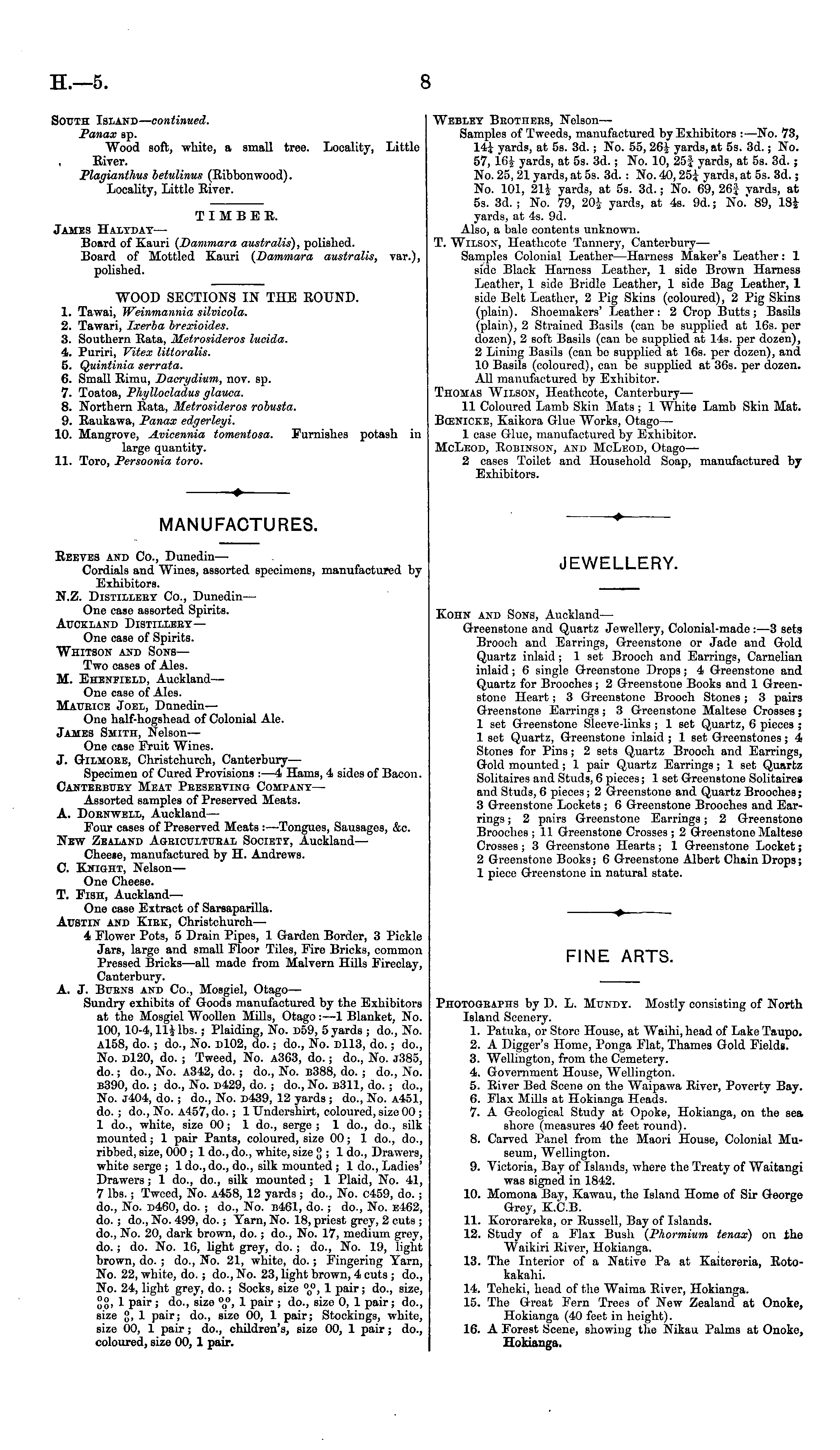 MANUFACTURES. Reeves and Co., Dunedin— Cordials and Wines, assorted specimens, manufactured by Exhibitors. N.Z. Distillery Co., Dunedin — One case assorted Spirits. Auckland Distillery— One case of Spirits. Whitson and Sons — Two cases of Ales. M. Ehenfield, Auckland— One case of Ales. Maueice Joel, Dunedin— One half-hogshead of Colonial Ale. James Smith, Nelson — One case Fruit Wines. J. Gilmoee, Christehurch, Canterbury — Specimen of Cured Provisions : —4 Hams, 4 sides of Bacon. Canterbury Meat Preserving Company— Assorted samples of Preserved Meats. A. Dornwell, Auckland — Four cases of Preserved Meats : —Tongues, Sausages, &c. New Zealand Agricultural Society, Auckland— Cheese, manufactured by H. Andrews. C. Knight, Nelson — One Cheese. T. Fish, AucklandOne case Extract of Sarsaparilla. Austin and Kirk, Christehurch — 4 Flower Pots, 5 Drain Pipes, 1 Garden Border, 3 Pickle Jars, large and small Floor Tiles, Fire Bricks, common Pressed Bricks—all made from Malvern Hills Fireclay, Canterbury. A. J. Bfens and Co., Mosgiel, Otago— Sundry exhibits of Goods manufactured by the Exhibitors at the Mosgiel Woollen Mills, Otago:—l Blanket, No. 100, 10-4, Hi lbs.; Plaiding, No. d 59, 5 yards ; do., No. Al5B, do. ; do., No. DlO2, do.; do., No. Dll 3, do.; do., No. Dl2O, do. ; Tweed, No. A 363, do.; do., No. J385, do.; do., No. A 342, do. ; do., No. 8388, do. ; do., No. 8390, do. ; do., No. 1)429, do. ; do., No. b3ll, do.; do., No. J404, do.; do., No. d 439, 12 yards; do., No. A 451, do. ; do., No. A 457, do.; 1 Undershirt, coloured, size 00 ; 1 do., white, size 00; 1 do., serge ; 1 do., do., silk mounted; 1 pair Pants, coloured, size 00; 1 do., do., ribbed, size, 000; 1 do., do., white, size 55; 1 do., Drawers, white serge ; 1 do., do., do., silk mounted ; 1 do., Ladies' Drawers; 1 do., do., silk mounted; 1 Plaid, No. 41, 7 lbs.; Tweed, No. a 458, 12 yards; do., No. c 459, do. ; do., No. d 460, do. ; do., No. b461, do.; do., No. e462, do. ; do., No. 499, do.; Yarn, No. 18, priest grey, 2 cuts ; do., No. 20, dark brown, do.; do., No. 17, medium grey, do.; do. No. 16, light grey, do. ; do., No. 19, light brown, do. ; do., No. 21, white, do.; Fingering Yarn, No. 22, white, do. ; do., No. 23, light brown, 4 cuts ; do., No. 24, light grey, do.; Socks, size ° o °, 1 pair; do., size, °Jj, 1 pair ; do., size ° o °, 1 pair ; do., size 0, 1 pair; do., size g, 1 pair; do., size 00, 1 pair; Stockings, white, size 00, 1 pair; do., children's, size 00, 1 pair; do., coloured, size 00, 1 pair.