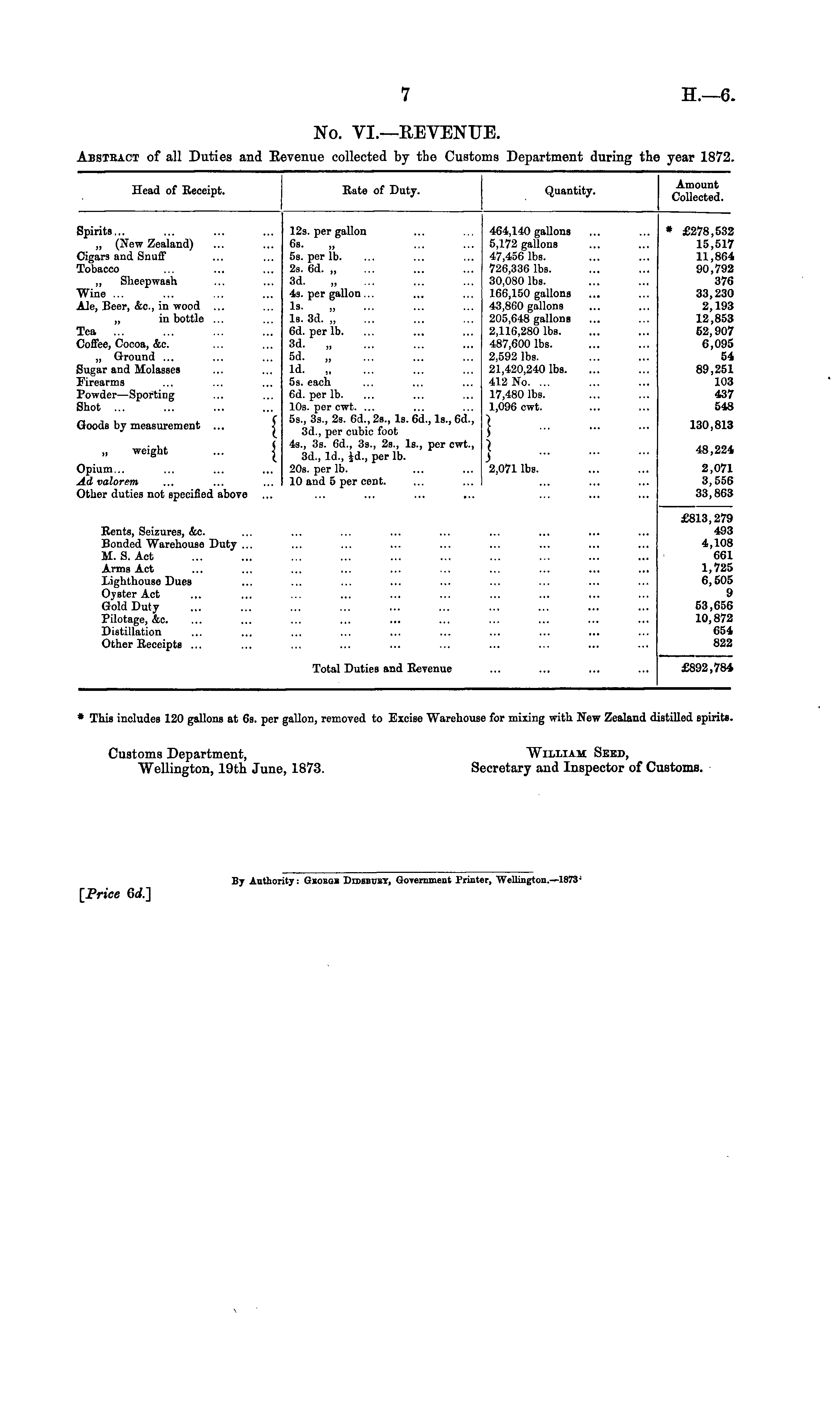 No. VI.—REVENUE. ABSTRACT of all Duties and Revenue collected by the Customs Department during the year 1872.