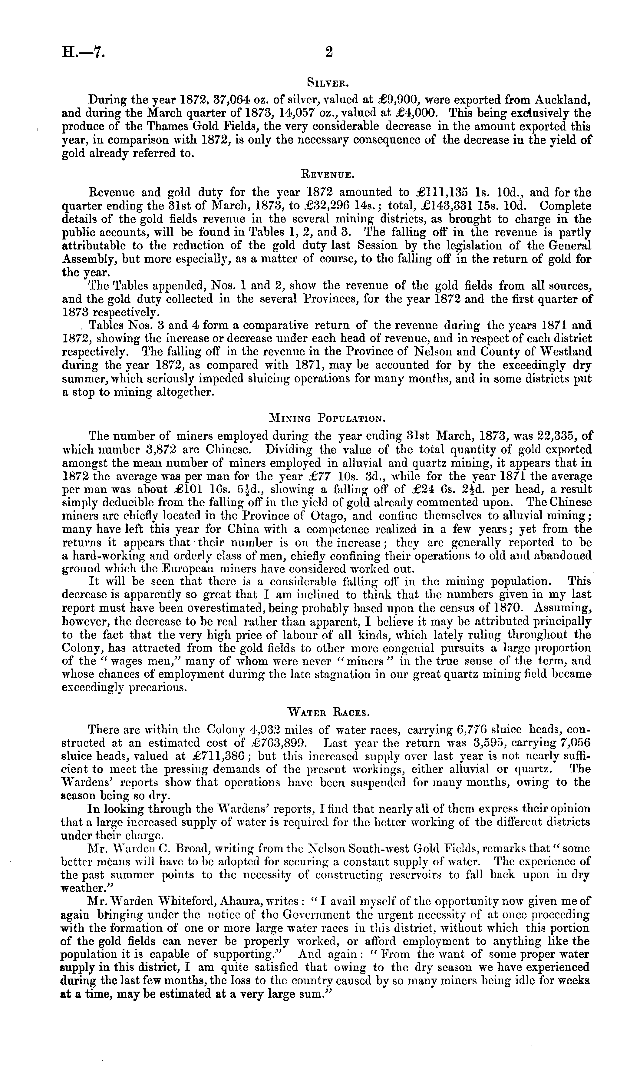 Silver. During the year 1872, 37,064 oz. of silver, valued at .£9,900, were exported from Auckland, and during the March quarter of 1873, 14,057 oz., valued at £4,000. This being exclusively the produce of the Thames Gold Fields, the very considerable decrease in the amount exported this year, in comparison with 1872, is only the necessary consequence of the decrease in the yield of gold already referred to. Revenue. Revenue and gold duty for the year 1872 amounted to £111,135 Is. 10d., and for the quarter ending the 31st of March, 1873, to £32,296 145.; total, £143,331 15s. lOd. Complete details of the gold fields revenue in the several mining districts, as brought to charge in the public accounts, will be found in Tables 1, 2, and 3. The falling off in the revenue is partly attributable to the reduction of the gold duty last Session by the legislation of the General Assembly, but more especially, as a matter of course, to the falling off in the return of gold for the year. The Tables appended, Nos. 1 and 2, show the revenue of the gold fields from all sources, and the gold duty collected in the several Provinces, for the year 1872 and the first quarter of 1873 respectively. . Tables Nos. 3 and 4 form a comparative return of the revenue during the years 1871 and 1872, showing the increase or decrease under each head of revenue, and in respect of each district respectively. The falling off in the revenue in the Province of Nelson and County of Westland during the year 1872, as compared with 1871, may be accounted for by the exceedingly dry summer, which seriously impeded sluicing operations for many months, and in some districts put a stop to mining altogether. Mining Population. The number of miners employed during the year ending 31st March, 1873, was 22,335, of which number 3,872 are Chinese. Dividing the value of the total quantity of gold exported amongst the mean number of miners employed in alluvial and quartz mining, it appears that in 1872 the average was per man for the year £77 10s. 3d., while for the year 1871 the average per man was about £101 16s. s£d., showing a falling off of £24 6s. 2|d. per head, a result simply dcducible from the falling off in the yield of gold already commented upon. The Chinese miners are chiefly located in the Province of Otago, and confine themselves to alluvial mining; many have left this year for China with a competence realized in a few years; yet from the returns it appears that their number is on the increase; they are generally reported to be a hard-working and orderly class of men, chiefly confining their operations to old and abandoned ground which the European miners have considered worked out. It will be seen that there is a considerable falling off in the mining population. This decrease is apparently so great that I am inclined to think that the numbers given in my last report must have been overestimated, being probably based upon the census of 1870. Assuming, however, the decrease to be real rather than apparent, I believe it may be attributed principally to the fact that the very high price of labour of all kinds, which lately ruling throughout the Colony, has attracted from the gold fields to other more congenial pursuits a large proportion of the " wages men," many of whom were never " miners " in the true sense of the term, and whose chances of employment during the late stagnation in our great quartz mining field became exceedingly precarious. Water Races. There are within the Colony 4,932 miles of water races, carrying 6,776 sluice heads, constructed at an estimated cost of £763,899. Last year the return was 3,595, carrying 7,056 sluice heads, valued at £711,386 ; but this increased supply over last year is not nearly sufficient to meet the pressing demands of the present workings, either alluvial or quartz. The Wardens' reports show that operations have been suspended for many months, owing to the season being so dry. In looking through the Wardens' reports, I find that nearly all of them express their opinion that a large increased supply of water is required for the better working of the different districts under their charge. Mr. Warden C. Broad, writing from the Nelson South-west Gold Fields, remarks that" some better means will have to be adopted for securing a constant supply of water. The experience of the past summer points to the necessity of constructing reservoirs to fall back upon in dry weather." Mr. Warden Whiteford, Ahaura, writes : " I avail myself of the opportunity now given me of again bringing under the notice of the Government the urgent necessity cf at once proceeding with the formation of one or more large water races in this district, without which this portion of the gold fields can never be properly worked, or afford employment to anything like the population it is capable of supporting." And again : " From the want of some proper water supply in this district, I am quite satisfied that owing to the dry season we have experienced during the last few months, the loss to the country caused by so many miners being idle for weeks at a time, may be estimated at a very large sum."