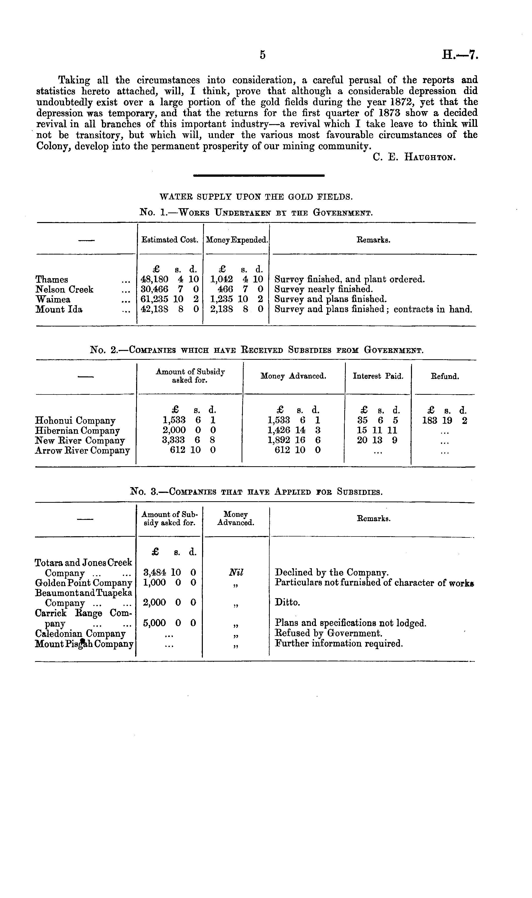 Taking all the circumstances into consideration, a careful perusal of the reports and statistics hereto attached, will, I think, prove that although a considerable depression did undoubtedly exist over a large portion of the gold fields during the year 1872, yet that the depression was temporary, and that the returns for the first quarter of 1873 show a decided revival in all branches of this important industry—a revival which I take leave to think will not be transitory, but which will, under the various most favourable circumstances of the Colony, develop into the permanent prosperity of our mining community. C. E. Haughton.