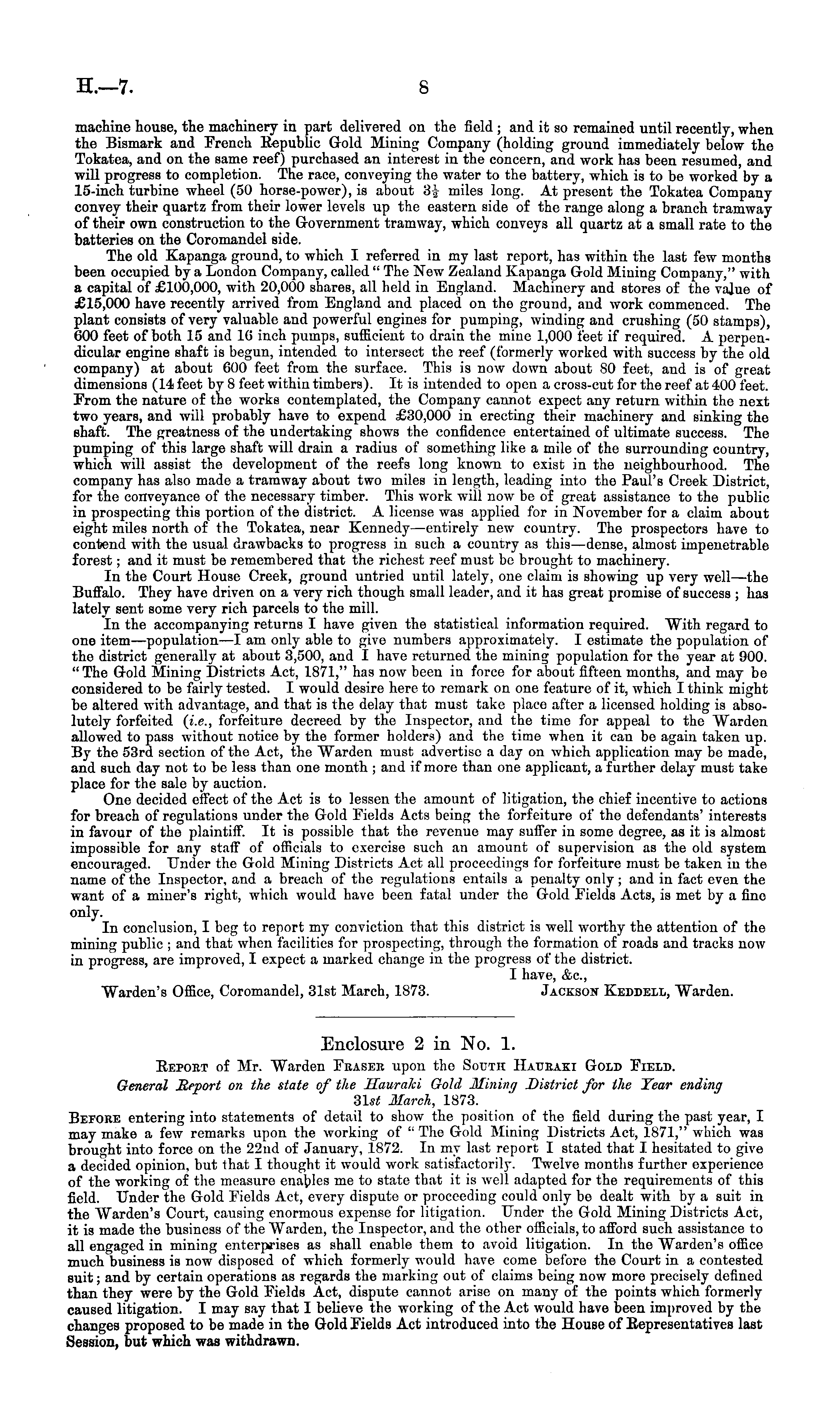 Enclosure 2 in No. 1. Report of Mr. Warden Phaser upon tho South Hauraki Gold Field. General Report on the state of the Hauraki Gold Mining District for the Year ending 3lst March, 1873. Before entering into statements of detail to show the position of the field during the past year, I may make a few remarks upon the working of " The Gold Mining Districts Act, 1871," which was brought into force on the 22nd of January, 1872. In my last report I stated that I hesitated to give a decided opinion, but that I thought it would work satisfactorily. Twelve months further experience of the working of the measure enables me to state that it is well adapted for the requirements of this field. Under the Gold Fields Act, every dispute or proceeding could only be dealt with by a suit in the Warden's Court, causing enormous expense for litigation. Under the Gold Mining Districts Act, it is made the business of the Warden, the Inspector, and the other officials, to afford such assistance to all engaged in mining enterprises as shall enable them to avoid litigation. In the Warden's office much business is now disposed of which formerly would have come before the Court in a contested suit; and by certain operations as regards the marking out of claims being now more precisely defined than they were by tho Gold Fields Act, dispute cannot arise on many of the points which formerly caused litigation. I may say that I believe the working of the Act would have been improved by the changes proposed to be made in the Gold Fields Act introduced into the House of Representatives last Session, but which was withdrawn.