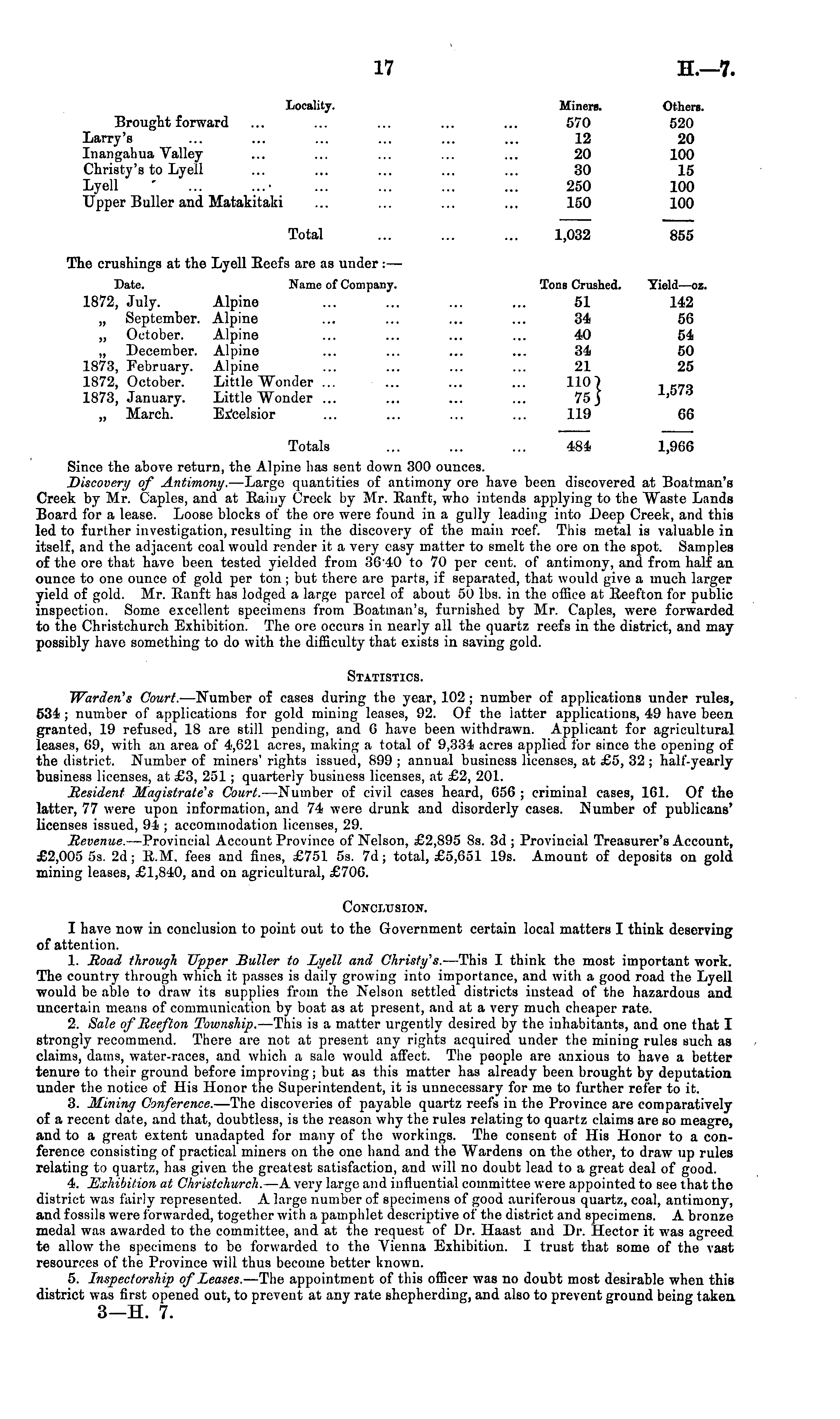 Since the above return, the Alpine has sent down 300 ounces. Discovery of Antimony. —Large quantities of antimony ore have been discovered at Boatman's Creek by Mr. Caples, and at Rainy Creek by Mr. Ranft, who intends applying to the Waste Lands Board for a lease. Loose blocks of the ore were found in a gully leading into Deep Creek, and this led to further investigation, resulting in the discovery of the main reef. This metal is valuable in itself, and the adjacent coal would render it a very easy matter to smelt the ore on the spot. Samples of the ore that have been tested yielded from 3G'4O to 70 per cent, of antimony, and from half an ounce to one ounce of gold per ton; but there are parts, if separated, that would give a much larger yield of gold. Mr. Ranft has lodged a large parcel of about 50 lbs. in the office at Reefton for public inspection. Some excellent specimens from Boatman's, furnished by Mr. Caples, were forwarded to the Christchurch Exhibition. The ore occurs in nearly all the quartz reefs in the district, and may possibly have something to do with the difficulty that exists in saving gold. Statistics. Warden's Court. —Number of cases during the year, 102 ; number of applications under rules, 534 ; number of applications for gold mining leases, 92. Of the iatter applications, 49 have been granted, 19 refused, 18 are still pending, and G have been withdrawn. Applicant for agricultural leases, 69, with an area of 4,621 acres, making a total of 9,334 acres applied for since the opening of the district. Number of miners' rights issued, 899 ; annual business licenses, at £5, 32 ; half-yearly business licenses, at £3, 251; quarterly business licenses, at £2, 201. Resident Magistrate's Court. —Number of civil cases heard, 656 ; criminal cases, 161. Of the latter, 77 were upon information, and 74 were drunk and disorderly cases. Number of publicans' licenses issued, 94 ; accommodation licenses, 29. Revenue. —Provincial Account Province of Nelson, £2,895 Bs. 3d ; Provincial Treasurer's Account, £2,005 ss. 2d; R.M. fees and fines, £751 ss. 7d; total, £5,651 19s. Amount of deposits on gold mining leases, £1,840, and on agricultural, £706. Conclusion. I have now in conclusion to point out to the Government certain local matters I think deserving of attention. 1. Road through Upper Buller to Lyell and Christy's.- —This I think the most important work. The country through which it passes is daily growing into importance, and with a good road the Lyell would be able to draw its supplies from the Nelson settled districts instead of the hazardous and uncertain means of communication by boat as at present, and at a very much cheaper rate. 2. Sale of Reef ton Township. —This is a matter urgently desired by the inhabitants, and one that I strongly recommend. There are not at present any rights acquired under the mining rules such as claims, dams, water-races, and which a sale would affect. The people are anxious to have a better tenure to their ground before improving; but as this matter has already been brought by deputation under the notice of His Honor the Superintendent, it is unnecessary for me to further refer to it. 3. Mining Conference. —The discoveries of payable quartz reefs in the Province are comparatively of a recent date, and that, doubtless, is the reason why the rules relating to quartz claims are so mean-re, aud to a great extent unadapted for many of the workings. The consent of His Honor to a conference consisting of practical miners on the one hand and the Wardens on the other, to draw up rules relating to quartz, has given the greatest satisfaction, and will no doubt lead to a great deal of good. 4. Exhibition at Christchurch. —A very large and influential committee were appointed to see that the district was fairly represented. A large number of specimens of good auriferous quartz, coal, antimony, and fossils were forwarded, together with a pamphlet descriptive of the district and specimens. A bronze medal was awarded to the committee, and at the request of Dv. Haast and Dr. Hector it was agreed te allow the specimens to be forwarded to the Vienna Exhibition. I trust that some of the vast resources of the Province will thus become better known. 5. Jnspectorship of Leases. —The appointment of this officer was no doubt most desirable when this district was first opened out, to prevent at any rate shepherding, and also to prevent ground being taken 3—H. 7.