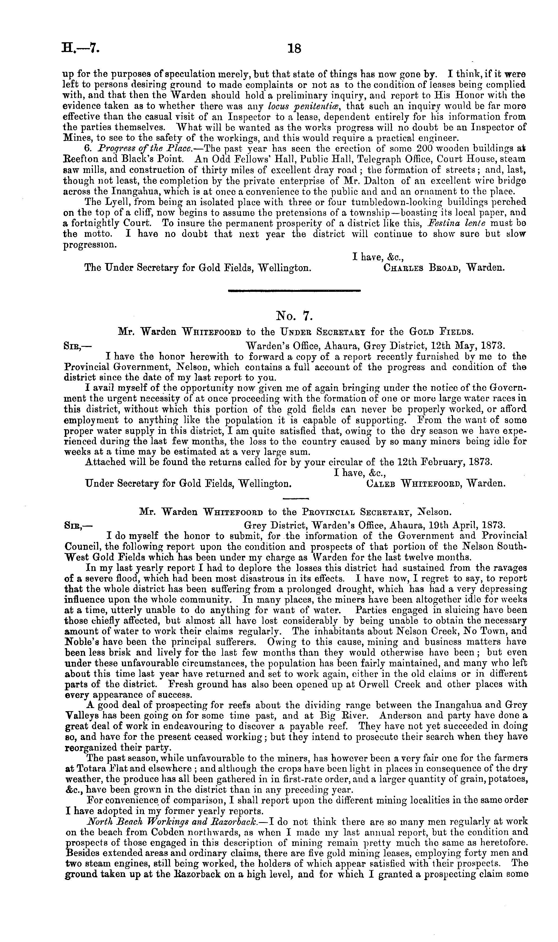 No. 7. Mr. Warden Whitefoord to the Under Secretary for the Gold Fields. Sir,— Warden's Office, Ahaura, Grey District, 12th May, 1873. I have the honor herewith to forward a copy of a report recently furnished by mo to the Provincial Government, Nelson, which contains a full account of the progress and condition of the district since the date of my last report to you. I avail myself of the opportunity now given me of again bringing under the notice of the Government the urgent necessity of at once proceeding with the formation of one or more large water races in this district, without which this portion of the gold fields can never be properly worked, or afford employment to anything like the population it is capable of supporting. From the want of some proper water supply in this district, I am quite satisfied that, owing to the dry season we have experienced during the last few months, the loss to tho country caused by so many miners being idle for weeks at a time may be estimated at a very large sum. Attached will be found the returns called for by your circular of the 12th February, 1873. I have, <fee, Under Secretary for Gold Fields, Wellington. Caleb Whitefoord, Warden.