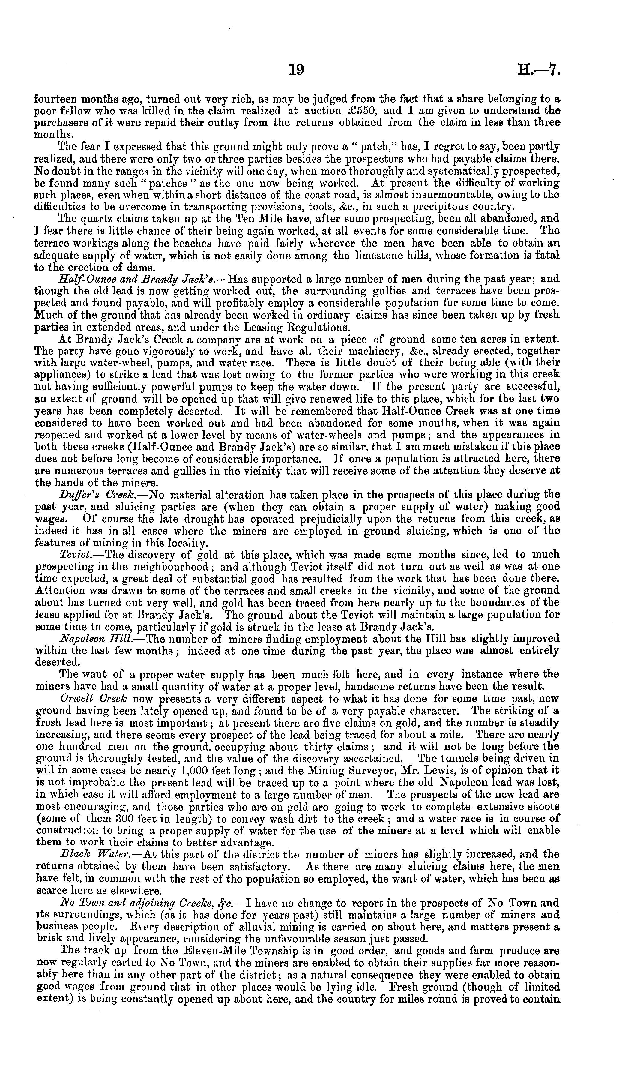 fourteen months ago, turned out very rich, as may be judged from the fact that a share belonging to a poor fellow who was killed in the claim realized at auction £550, and I am given to understand the purchasers of it were repaid their outlay from the returns obtained from the claim in less than three months. The fear I expressed that this ground might only prove a " patch," has, I regret to say, been partly realized, and there were only two or three parties besides tho prospectors who had payable claims there. No doubt in the ranges in the vicinity will one day, when more thoroughly and systematically prospected, be found many such " patches "as the one now being worked. At present the difficulty of working such places, even when within a short distance of the coast road, is almost insurmountable, owing to the difficulties to be overcome in transporting provisions, tools, &c, in such a precipitous country. The quartz claims taken up at the Ten Mile have, after some prospecting, been all abandoned, and I fear there is little chance of their being again worked, at all events for some considerable time. The terrace workings along the beaches have paid fairly wherever the men have been able to obtain an adequate supply of water, which is not easily done among the limestone hills, whose formation is fatal to the erection of dams. Half-Ounce and Brandy Jack's. —Has supported a large number of men during the past year; and though the old lead is now getting worked out, the surrounding gullies and terraces have been prospected and found payable, and will profitably employ a considerable population for some time to come. Much of the ground that has already been worked in ordinary claims has since been taken up by fresh parties in extended areas, and under the Leasing Regulations. At Brandy Jack's Creek a company are at work on a piece of ground some ten acres in extent. The party have gone vigorously to work, and have all their machinery, &c, already erected, together with large water-wheel, pumps, and water race. There is little doubt of their being able (with their appliances) to strike a lead that was lost owing to the former parties who were working in this creek not having sufficiently powerful pumps to keep the water down. If the present party are successful, an extent of ground will be opened up that will give renewed life to this place, which for the last two years has been completely deserted. It will be remembered that Half-Ounce Creek was at one time considered to have been worked out and had been abandoned for some months, when it was again reopened and worked at a lower level by means of water-wheels and pumps ; and the appearances in both these creeks (Half-Ounce and Brandy Jack's) are so similar, that I am much mistaken if this place does not before long become of considerable importance. If once a population is attracted here, there are numerous terraces and gullies in the vicinity that will receive some of the attention they deserve at the hands of the miners. Buffer's Creek. —No material alteration has taken place in the prospects of this place during the past year, and sluicing parties are (when they can obtain a proper supply of water) making good wages. Of course the late drought has operated prejudicially upon the returns from this creek, as indeed it has in all cases where the miners are employed in ground sluicing, which is one of the features of mining in this locality. Teviot. —The discovery of gold at this place, which was made some months sinre, led to much prospecting in the neighbourhood; and although Teviot itself did not turn out as well as was at one time expected, a great deal of substantial good has resulted from the work that has been done there. Attention was drawn to some of the terraces and small creeks in the vicinity, and some of the ground about has turned out very well, and gold has been traced from here nearly up to the boundaries of the lease applied for at Brandy Jack's. 'Hie ground about the Teviot will maintain a large population for some time to come, particularly if gold is struck in the lease at Brandy Jack's. Napoleon Hill —The number of miners finding employment about the Hill has slightly improved within the last few months ; indeed at one time during the past year, the place was almost entirely deserted. The want of a proper water supply has been much felt here, and in every instance where the miners have had a small quantity of water at a proper level, handsome returns have been the result. Orwell Creek now presents a very different aspect to what it has done for some time past, new ground having been lately opened up, and found to be of a very payable character. The striking of a fresh lead here is most important; at present there are five claims on gold, and the number is steadily increasing, and there seems every prospect of the lead being traced for about a mile. There are nearly one hundred men on the ground, occupying about thirty claims ; and it will not be long before the ground is thoroughly tested, and the value of the discovery ascertained. The tunnels being driven in will in some cases be nearly 1,000 feet long ; and the Mining Surveyor, Mr. Lewis, is of opinion that it is not improbable the present lead will be traced up to a point where the old Napoleon lead was lost, in which case it will afford employment to a large number of men. The prospects of the new lead are most encouraging, and those parties who are on gold are going to work to complete extensive shoots (some of them 300 feet in length) to convoy wash dirt to the creek ; and a water race is in course of construction to bring a proper supply of water for the use of the miners at a level which will enable them to work their claims to better advantage. Black Water. —At this part of the district the number of miners has slightly increased, and the returns obtained by them have been satisfactory. As there are many sluicing claims here, the men have felt, in com