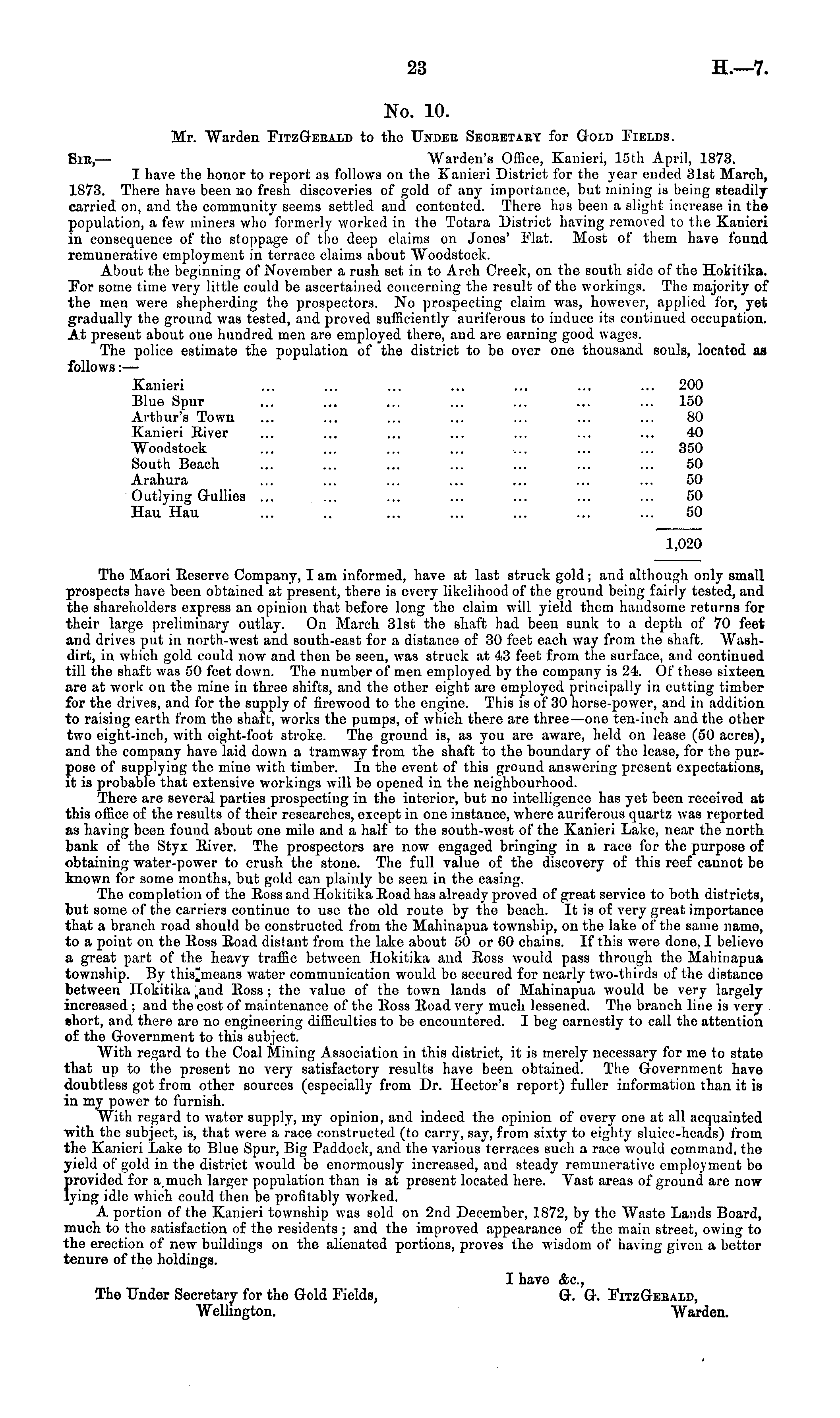 No. 10. Mr. Warden FitzGerald to the Under Secretary for Gold Fields. Sir,— Warden's Office, Kanieri, 15th April, 1873. I have the honor to report as follows on the Kanieri District for the year ended 31st March, 1873. There have been no fresh discoveries of gold of any importance, but mining is being steadily carried on, and the community seems settled and contented. There has been a slight increase in the population, a few miners who formerly worked in the Totara District having removed to the Kanieri in consequence of the stoppage of the deep claims on Jones' Flat. Most of them have found remunerative employment in terrace claims about Woodstock. About the beginning of November a rush set in to Arch Creek, on the south side of the Hokitika. For some time very little could be ascertained concerning the result of the workings. The majority of the men were shepherding the prospectors. No prospecting claim was, however, applied for, yet gradually the ground was tested, and proved sufficiently auriferous to induce its continued occupation. At present about one hundred men are employed there, and are earning good wages. The police estimate the population of the district to be over one thousand souls, located as follows:— Kanieri ... ... ... ... ... ... ... 200 Blue Spur ... ... ... ... ... ... ... 150 Arthur's Town ... ... ... ... ... ... ... 80 Kanieri River ... ... ... ... ... ... ... 40 Woodstock ... ... ... ... ... ... ... 350 South Beach ... ... ... ... ... ... ... 50 Arahura ... ... ... ... ... ... ... 50 Outlying Gullies ... ... ... ... ... ... ... 50 Hau Hau ... .. ... ... ... ... ... 50 1,020 The Maori Reserve Company, lam informed, have at last struck gold; and although only small prospects have been obtained at present, there is every likelihood of the ground being fairly tested, and the shareholders express an opinion that before long tho claim will yield them handsome returns for their large preliminary outlay. On March 31st the shaft had been sunk to a depth of 70 feet and drives put in north-west and south-east for a distance of 30 feet each way from the shaft. Washdirt, in which gold could now and then be seen, was struck at 43 feet from the surface, and continued till the shaft was 50 feet down. The number of men employed by the company is 24. Of these sixteen are at work on the mine in three shifts, and tho other eight are employed principally in cutting timber for the drives, and for the supply of firewood to the engine. This is of 30 horse-power, and in addition to raising earth from the shaft, works the pumps, of which there are three—one ten-inch and the other two eight-inch, with eight-foot stroke. The ground is, as you are aware, held on lease (50 acres), and the company have laid down a tramway from the shaft to the boundary of the lease, for the purpose of supplying the mine with timber. In the event of this ground answering present expectations, it is probable that extensive workings will be opened in the neighbourhood. There are several parties prospecting in the interior, but no intelligence has yet been received at this office of the results of their researches, except in one instance, where auriferous quartz was reported as having been found about one mile and a half to the south-west of the Kanieri Lake, near the north bank of the Styx River. The prospectors are now engaged bringing in a race for the purpose of obtaining water-power to crush the stone. The full value of the discovery of this reef caunot be known for some months, but gold can plainly be seen in the casing. The completion of the Ross and Hokitika Road has already proved of great service to both districts, but some of the carriers continue to use the old route by the beach. It is of very great importance that a branch road should be constructed from the Mahinapua township, on the lake of the same name, to a point on the Ross Road distant from the lake about 50 or 60 chains. If this were done, I believe a great part of the heavy traffic between Hokitika aud Ross would pass through the Mahinapua township. By thisjneans water communication would be secured for nearly two-thirds of the distance between Hokitika H and Ross ; the value of the town lands of Mahinapua would be very largely increased ; aud the cost of maintenance of the Ross Road very much lessened. The branch line is very short, and there are no engineering difficulties to be encountered. I beg earnestly to call the attention of the Government to this subject. With regard to the Coal Mining Association in this district, it is merely necessary for me to state that up to the present no very satisfactory results have been obtained. The Government have doubtless got from other sources (especially from Dr. Hector's report) fuller information than it is in my power to furnish. With regard to water supply, my opinion, and indeed tho opinion of every one at all acquainted with the subject, is, that were a race constructed (to carry, say, from sixty to eighty sluice-heads) from the Kanieri Lake to Blue Spur, Big Paddock, and the various terraces such a race would command, the yield of gold in the district would be enormously increased, and steady remunerative employment be provided for a.much larger population than is at present located here. Vast areas of ground are now lying idle which could then be profitably worked. A portion of the Kanieri township was sold on 2nd December, 1872, by the Waste Lands Board, much to the satisfaction of the residents ; and the improved appearance of the main street, owing to the erection of new buildings on the alienated portions, proves the wisdom of having given a better tenure of the holdings. I have &c, The Under Secretary for the Gold Fields, G. G. FitzGerald, Wellington. Warden.