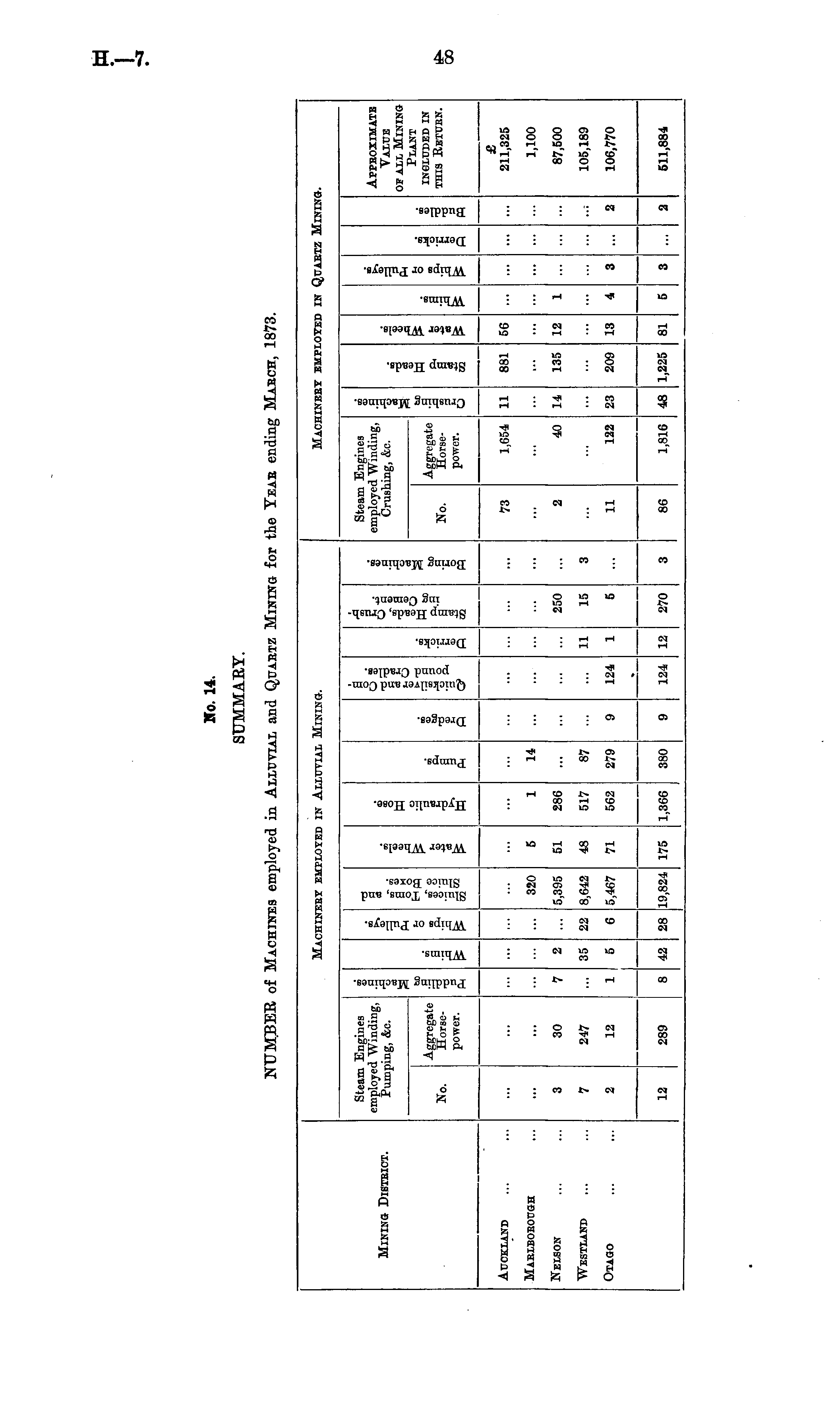 No. 14. SUMMARY. NUMBER of MACHINES employed in ALLUVIAL and QUARTZ MINING for the YEAR ending MARCH, 1873.