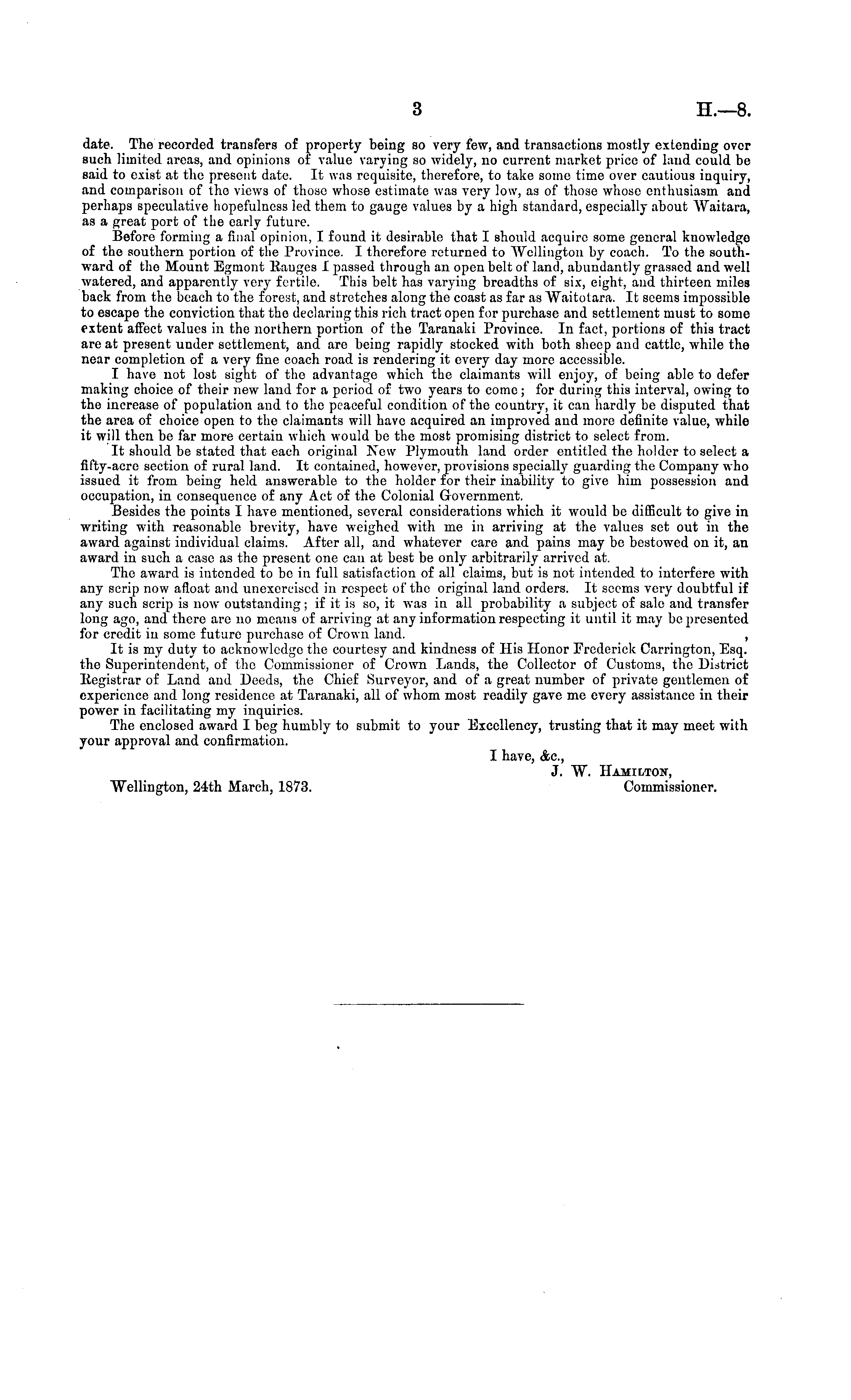 date. The recorded transfers of property being so very few, and transactions mostly extending over such limited areas, and opinions of value varying so widely, no current market price of hind could be said to exist at the present date. It was requisite, therefore, to take some time over cautious inquiry, and comparison of the views of those whose estimate was very low, as of those whoso enthusiasm and perhaps speculative hopefulness led them to gauge values by a high standard, especially about Waitara, as a great port of the early future. Before forming a final opinion, I found it desirable that I should acquire some general knowledge of the southern portion of the Province. I therefore returned to Wellington by coach. To the southward of tho Mount Egmont Ranges 1 passed through an open belt of land, abundantly grassed and well watered, and apparently very fertile. This belt has varying breadths of six, eight, and thirteen miles back from the beach to the forest, and stretches along the coast as far as Waitolara. It seems impossible to escape the conviction that tho declaring this rich tract open for purchase and settlement must to some extent affect values in the northern portion of the Taranaki Province. In fact, portions of this tract are at present under settlement, and are being rapidly stocked with both sheep and cattle, while the near completion of a very fine coach road is rendering it every day more accessible. I have not lost sight of the advantage which the claimants will enjoy, of being able to defer making choice of their new land for a period of two years to come ; for during this interval, owing to the increase of population and to the peaceful condition of the country, it can hardly be disputed that the area of choice open to the claimants will have acquired an improved and more definite value, while it will then be far more certain which would be the most promising district to select from. It should be stated that each original New Plymouth land order entitled the holder to select a fifty-acre section of rural land. It contained, however, provisions specially guarding the Company who issued it from being held answerable to the holder for their inability to give him possession and occupation, in consequence of any Act of the Colonial Government. Besides the points I have mentioned, several considerations which it would be difficult to give in writing with reasonable brevity, have weighed with me in arriving at the values set out in the award against individual claims. After all, and whatever care and pains may be bestowed on it, an award in such a case as the present one can at best be only arbitrarily arrived at. The award is intended to be in full satisfaction of all claims, but is not intended to interfere with any scrip now afloat and unexercised in respect of the original land orders. It seems very doubtful if any such scrip is now outstanding; if it is so, it was in all probability a subject of sale and transfer long ago, and there are no means of arriving at any information respecting it until it may be presented for credit in some future purchase of Crown land. , It is my duty to acknowledge the courtesy and kindness of His Honor Frederick Carrington, Esq. the Superintendent, of the Commissioner of Crown Lands, the Collector of Customs, the District Registrar of Land and Deeds, the Chief Survey ror, and of a great number of private gentlemen of experience and long residence at Taranaki, all of whom most readily gave mo every assistance in their power in facilitating my inquiries. The enclosed award I beg humbly to submit to your Excellency, trusting that it may meet with your approval and confirmation. I have, &c, J. W. Hamilton, Wellington, 24th March, 1873. Commissioner.