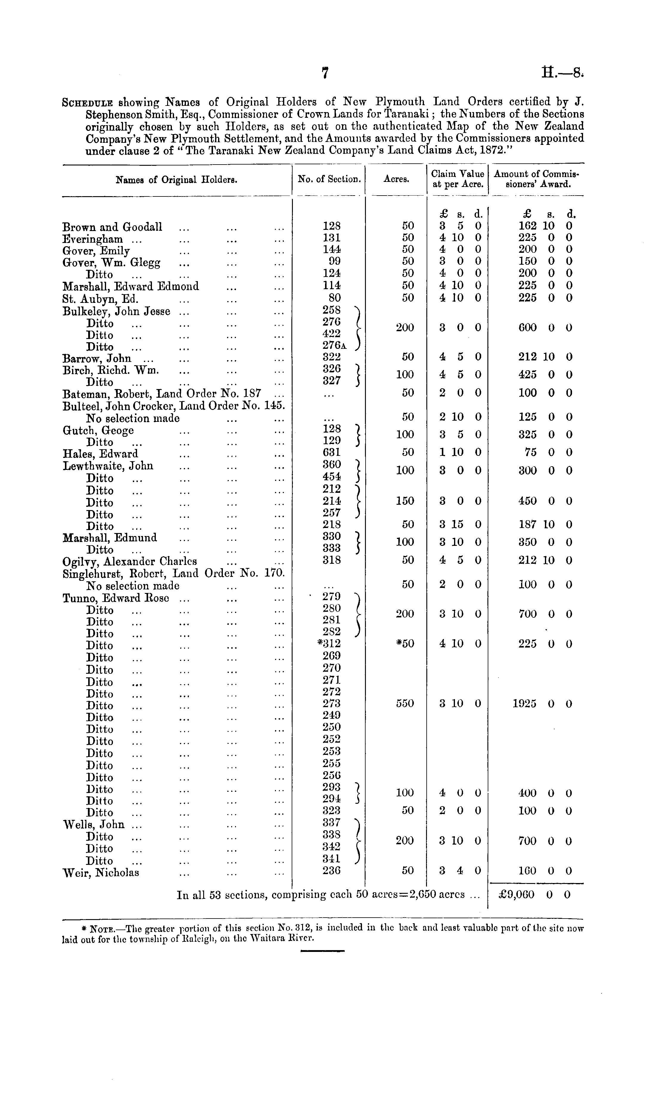 SCHEDULE showing Names of Original Holders of New Plymouth Land Orders certified by J. Stephenson Smith, Esq., Commissioner of Crown Lands for Taranaki; the Numbers of the Sections originally chosen by such Holders, as set out on the authenticated Map of the New Zealand Company's New Plymouth Settlement, and the Amounts awarded by the Commissioners appointed under clause 2 of "The Taranaki New Zealand Company's Land Claims Act, 1872."