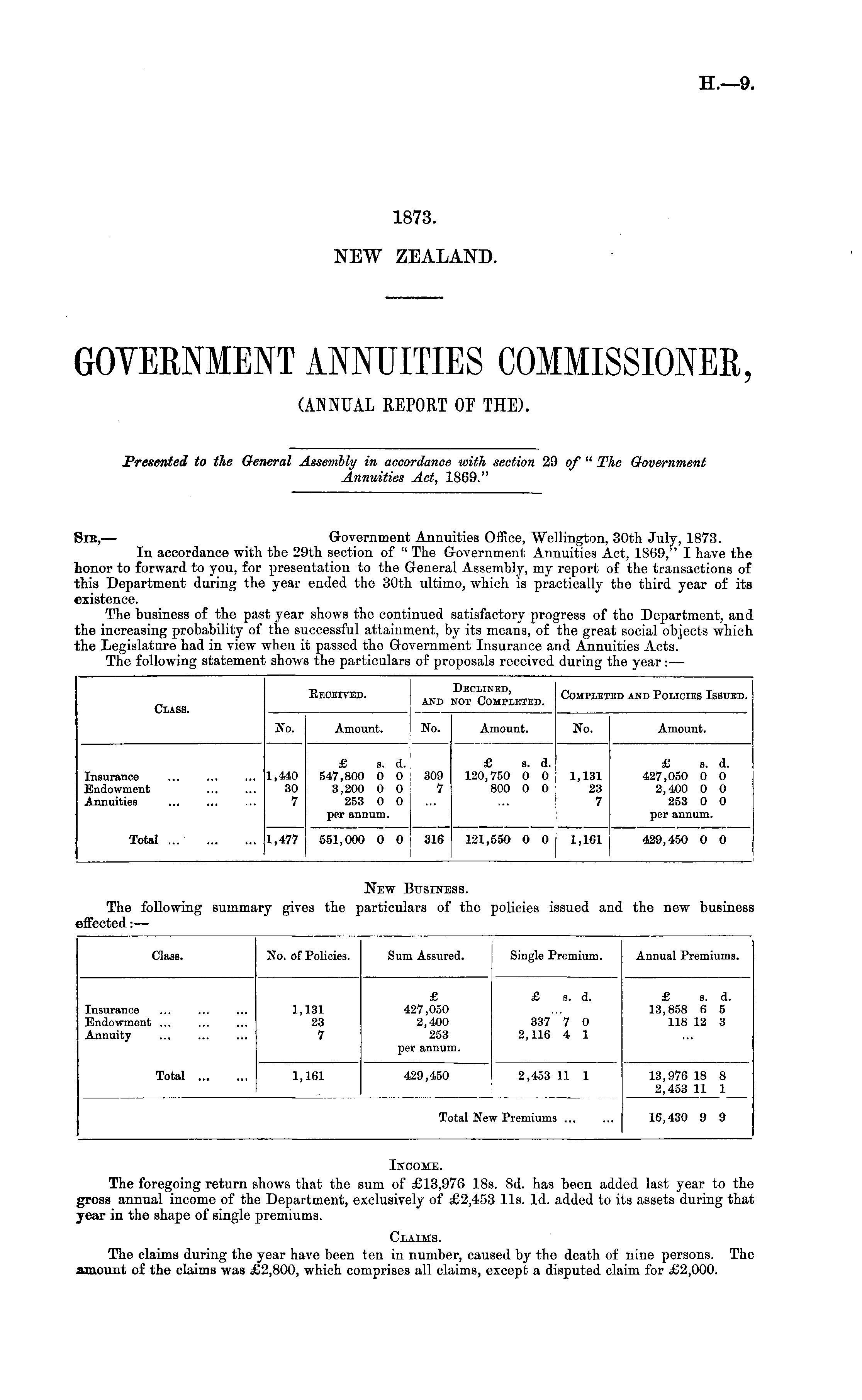Sib, — Government Annuities Office, "Wellington, 30th July, 1873. In accordance with the 29th section of " The Government Annuities Act, 1869," I have the honor to forward to you, for presentation to the General Assembly, my report of the transactions of this Department during the year ended the 30th ultimo, which is practically the third year of its existence. The business of the past year shows the continued satisfactory progress of the Department, and the increasing probability of the successful attainment, by its means, of the great social objects which the Legislature had in view when it passed the Government Insurance and Annuities Acts. The following statement shows the particulars of proposals received during the year: — _ . _