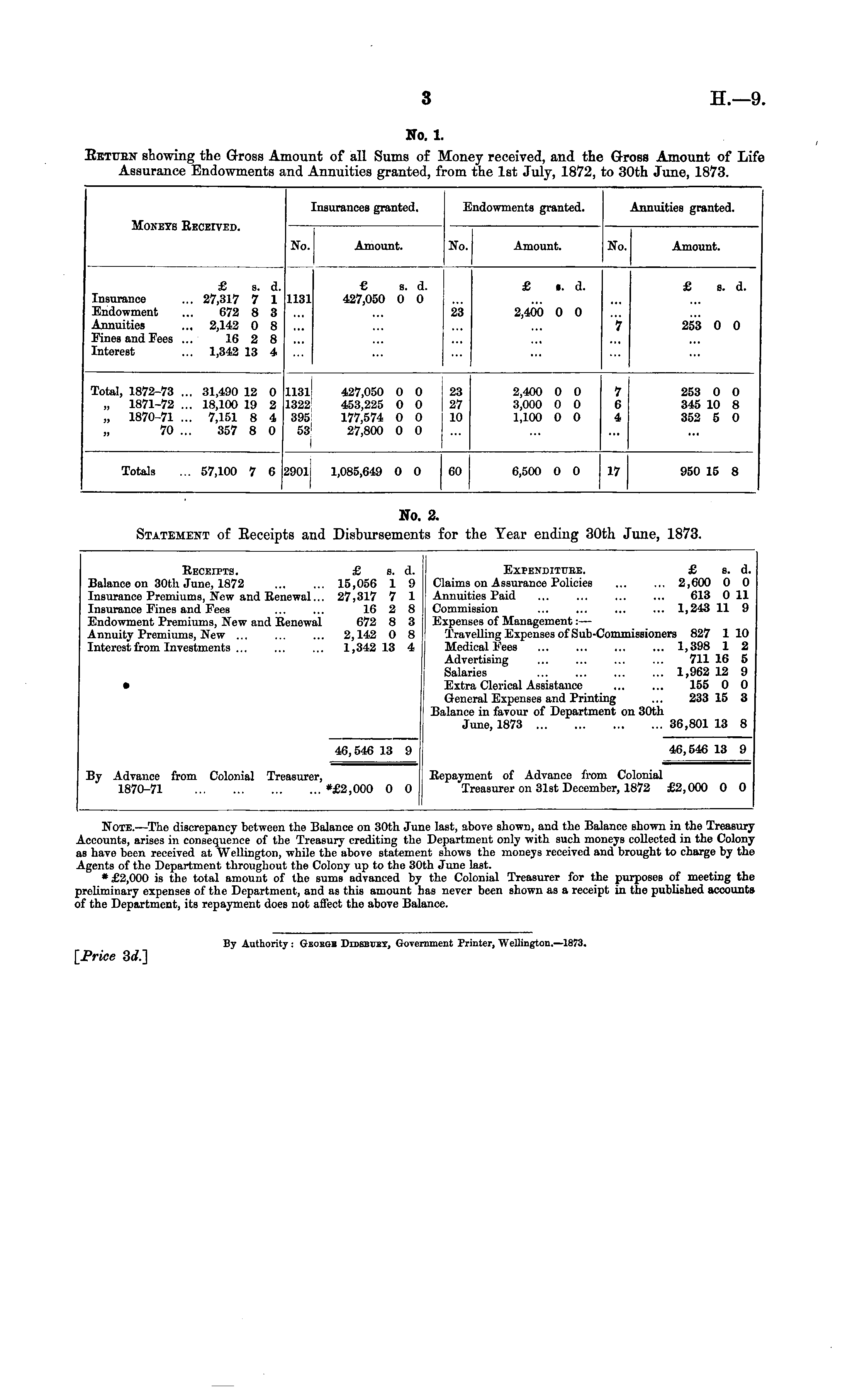No. 1. RETURN showing the Gross Amount of all Sums of Money received, and the Gross Amount of Life Assurance Endowments and Annuities granted, from the 1st July, 1872, to 30th June, 1873.