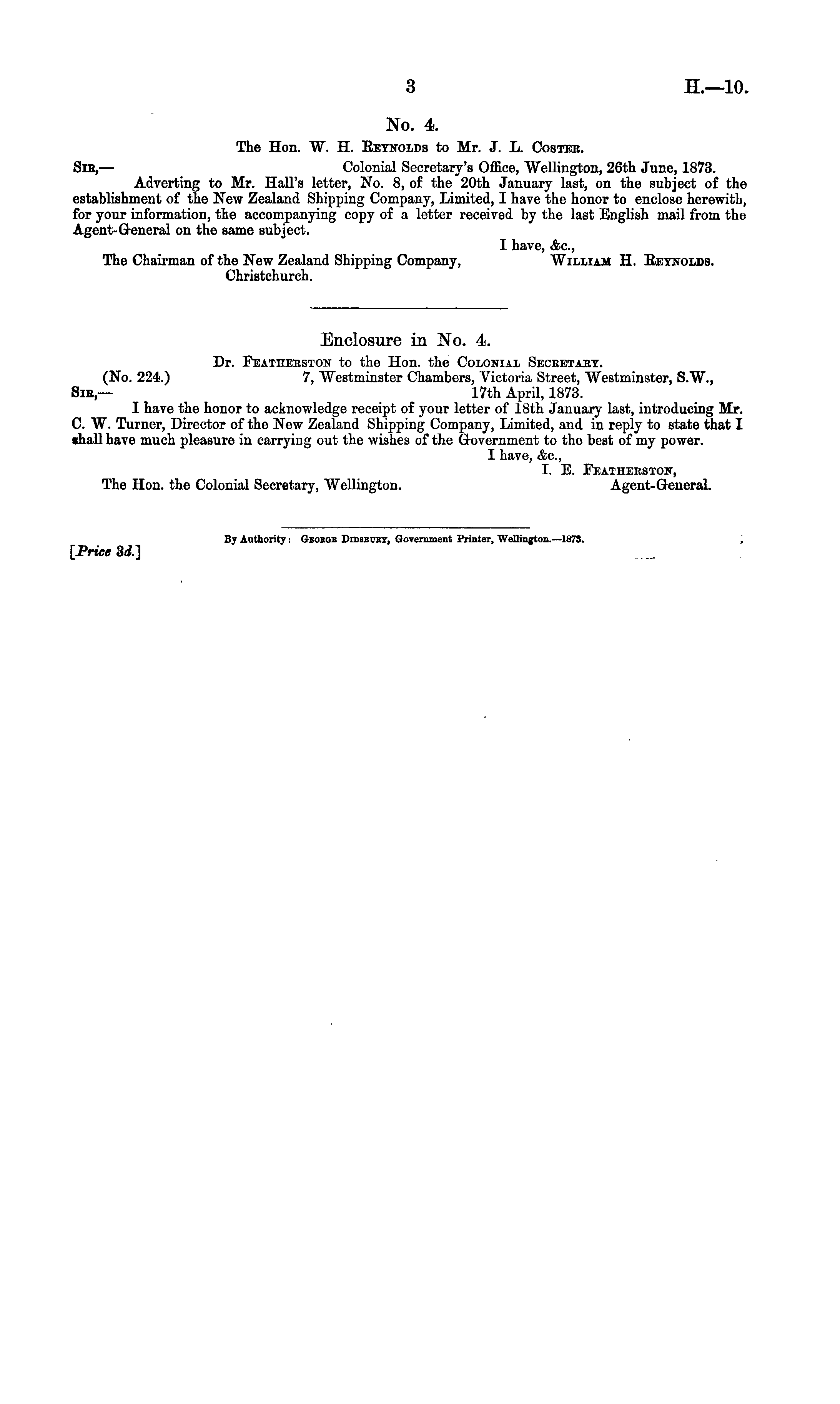 No. 4. The Hon. W. H. Eeynolds to Mr. J. L. Coster. Sir, — Colonial Secretary's Office, Wellington, 26th June, 1873. Adverting to Mr. Hall's letter, No. 8, of the 20th January last, on the subject of the establishment of the New Zealand Shipping Company, Limited, I have the honor to enclose herewith, for your information, the accompanying copy of a letter received by the last English mail from the Agent-General on the same subject. I have, <fee, The Chairman of the New Zealand Shipping Company, William H. Eeynolds. Christchurch.