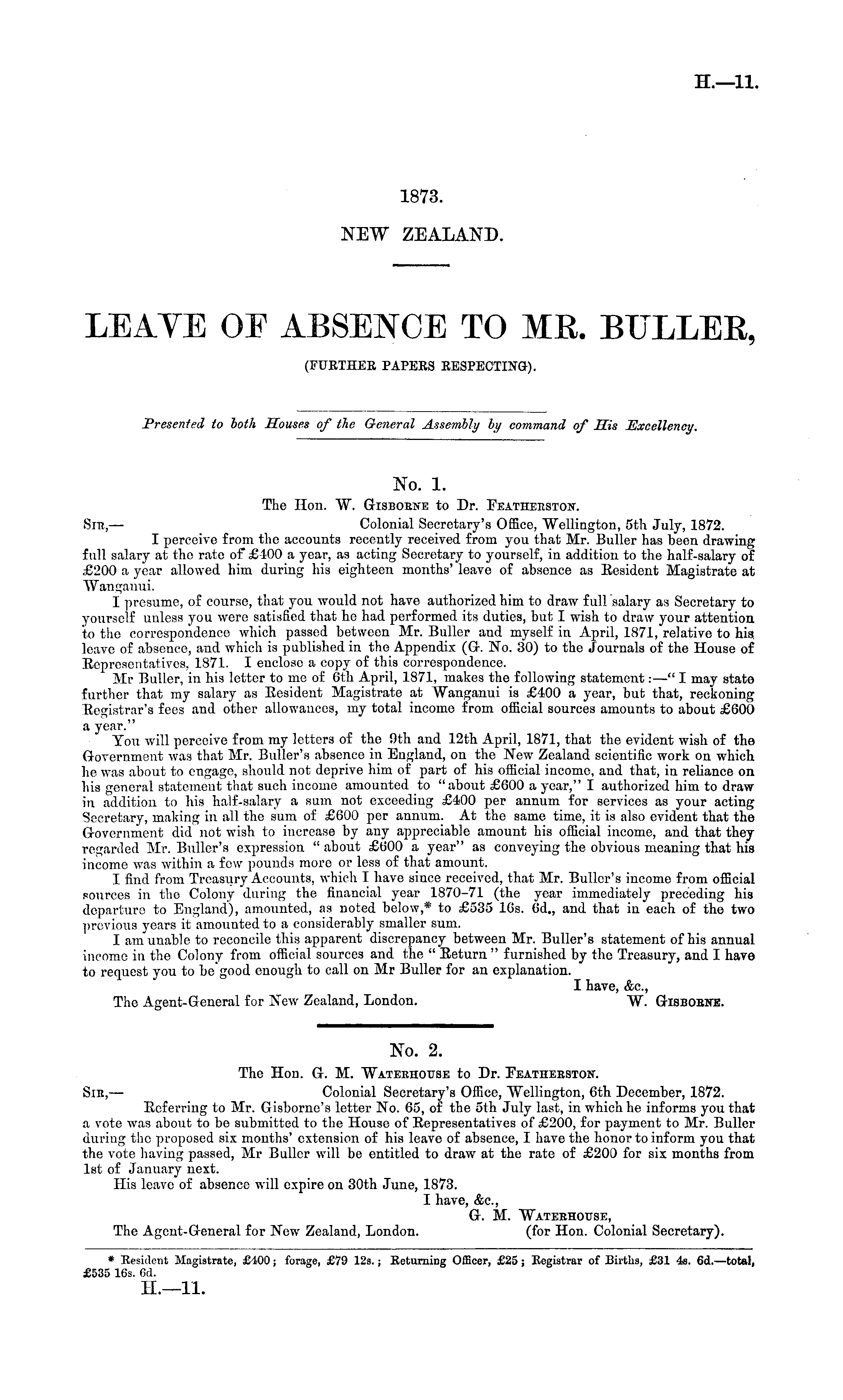 No. 1. The Hon. W. Gisborne to Dr. Featheeston. Str,— Colonial Secretary's Office, Wellington, sth July, 1872. I perceive from the accounts recently received from you that Mr. Buller has been drawing full salary at the rate of £400 a year, as acting Secretary to yourself, in addition to the half-salary of £200 a year allowed him during his eighteen months' leave of absence as Eesident Magistrate at Wanganui. I presume, of course, that you would not have authorized him to draw full "salary as Secretary to yourself unless you were satisfied that he had performed its duties, but I wish to draw your attention to the correspondence which passed between Mr. Buller and myself in April, 1871, relative to his. leave of absence, and which is published in the Appendix (G. No. 30) to the Journals of the House of Representatives, 1871. I enclose a copy of this correspondence. Mr Buller, in his letter to me of 6th April, 1871, makes the following statement: —" I may state further that my salary as Resident Magistrate at Wanganui is £400 a year, but that, reckoning Registrar's fees and other allowances, my total income from official sources amounts to about £600 a year." You will perceive from my letters of the 9th and 12th April, 1871, that the evident wish of the Government was that Mr. Buller's absence in England, on the New Zealand scientific work on which he was about to engage, should not deprive him of part of his official income, and that, in reliance on his general statement that such income amounted to "about £600 a year," I authorized him to draw in addition to his half-salary a sum not exceeding £400 per annum for services as your acting Secretary, making in all the sum of £600 per annum. At the same time, it is also evident that the Government did not wish to increase by any appreciable amount his official income, and that they regarded Mr. Buller's expression " about £600 a year" as conveying the obvious meaning that his income was within a few pounds more or less of that amount. I find from Treasury Accounts, which I have since received, that Mr. Buller's income from official sources in tho Colony during the financial year 1870-71 (the year immediately preceding his departure to England), amounted, as noted below,* to £535 16s. 6d., and that in each of the two previous years it amounted to a considerably smaller sum. I amunable to reconcile this apparent discrepancy between Mr. Buller's statement of his annual income in the Colony from official sources and the " Return " furnished by the Treasury, and I have to request you to be'good enough to call on Mr Buller for an explanation. I have, &c, The Agent-General for New Zealand, London. W. Gisbobne.