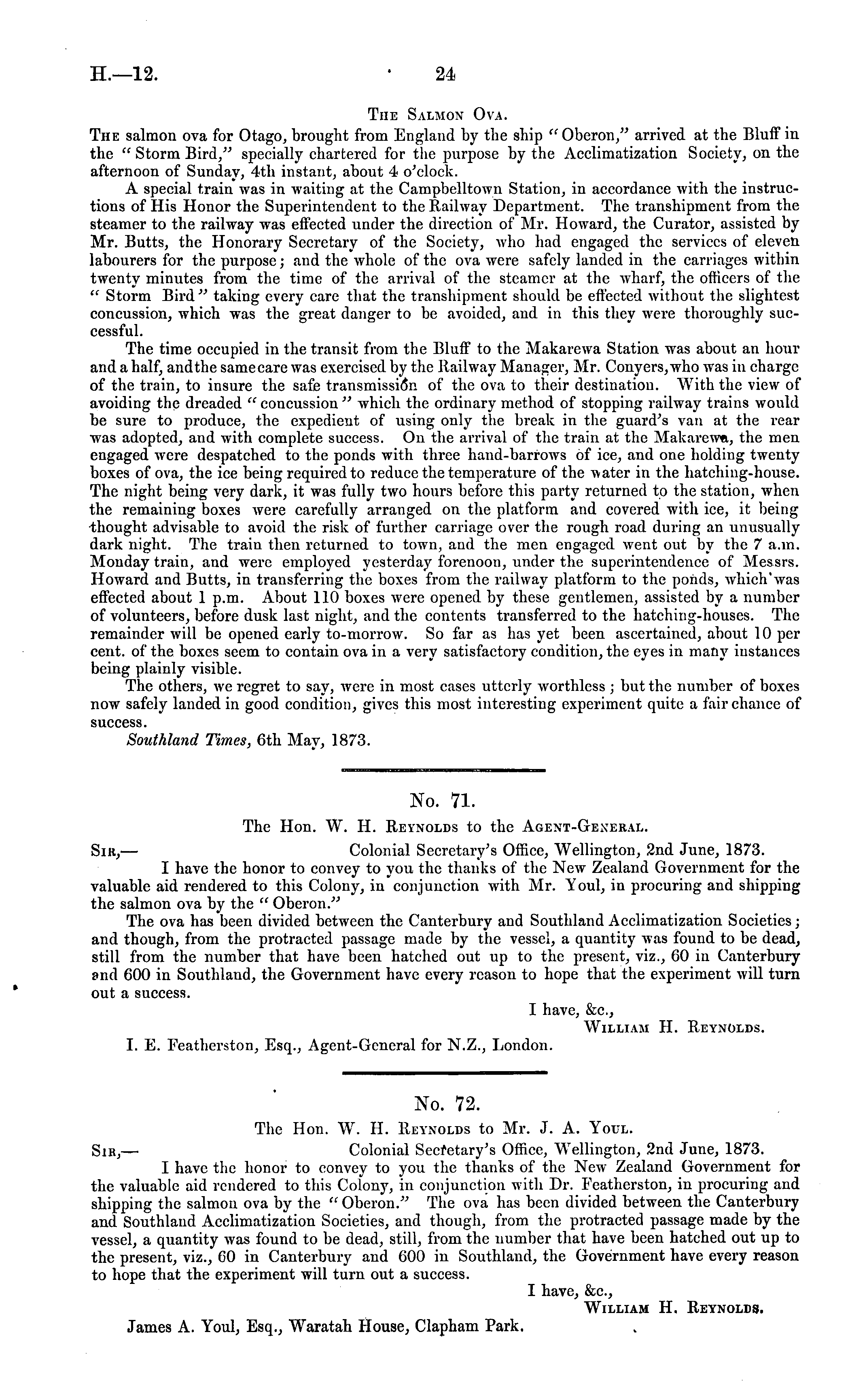 No. 72. The Hon. W r. H. Reynolds to Mr. J. A. Youl. Sir, — Colonial Secretary's Office, Wellington, 2nd June, 1873. I have the honor to convey to you the thanks of the New Zealand Government for the valuable aid rendered to this Colony, in conjunction with Dr. Featherston, in procuring and shipping the salmon ova by the "Oberon." The ova has been divided between the Canterbury and Southland Acclimatization Societies, and though, from the protracted passage made by the vessel, a quantity was found to be dead, still, from the number that have been hatched out up to the present, viz., 60 in Canterbury and 600 in Southland, the Government have every reason to hope that the experiment will turn out a success. I have, &c, William H. Reynolds. James A. Youl, Esq., Waratah House, Clapham Park.