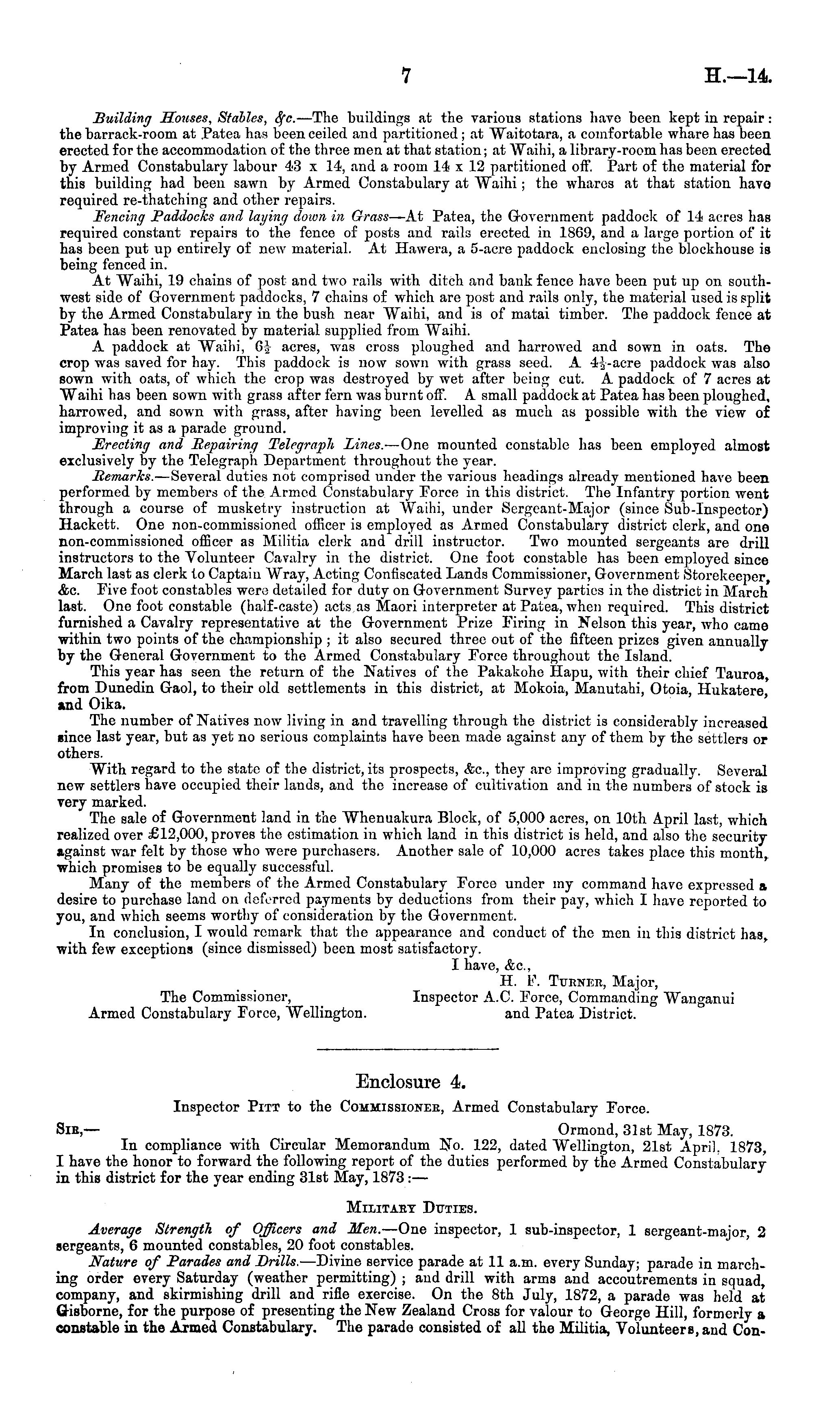 Enclosure 4. Inspector Pitt to the Commissioner, Armed Constabulary Force. Sir,— Ormond, 31st May, 1873. In compliance with Circular Memorandum No. 122, dated Wellington, 21st April. 1873, I have the honor to forward the following report of the duties performed by the Armed Constabulary in this district for the year ending 31st May, 1873 : — Military Duties. Average Strength of Officers and Men. —One inspector, 1 sub-inspector, 1 sergeant-major, 2 sergeants, 6 mounted constables, 20 foot constables. Nature of Parades and Drills. —Divine service parade at 11 a.m. every Sunday; parade in marching order every Saturday (weather permitting) ; aud drill with arms and accoutrements in squad, company, and skirmishing drill and rifle exercise. On the Bth July, 1872, a parade was held at Gisborne, for the purpose of presenting the New Zealand Cross for valour to George Hill, formerly a constable in the Armed Constabulary. The parade consisted of all the Militia, Volunteers, and Con-