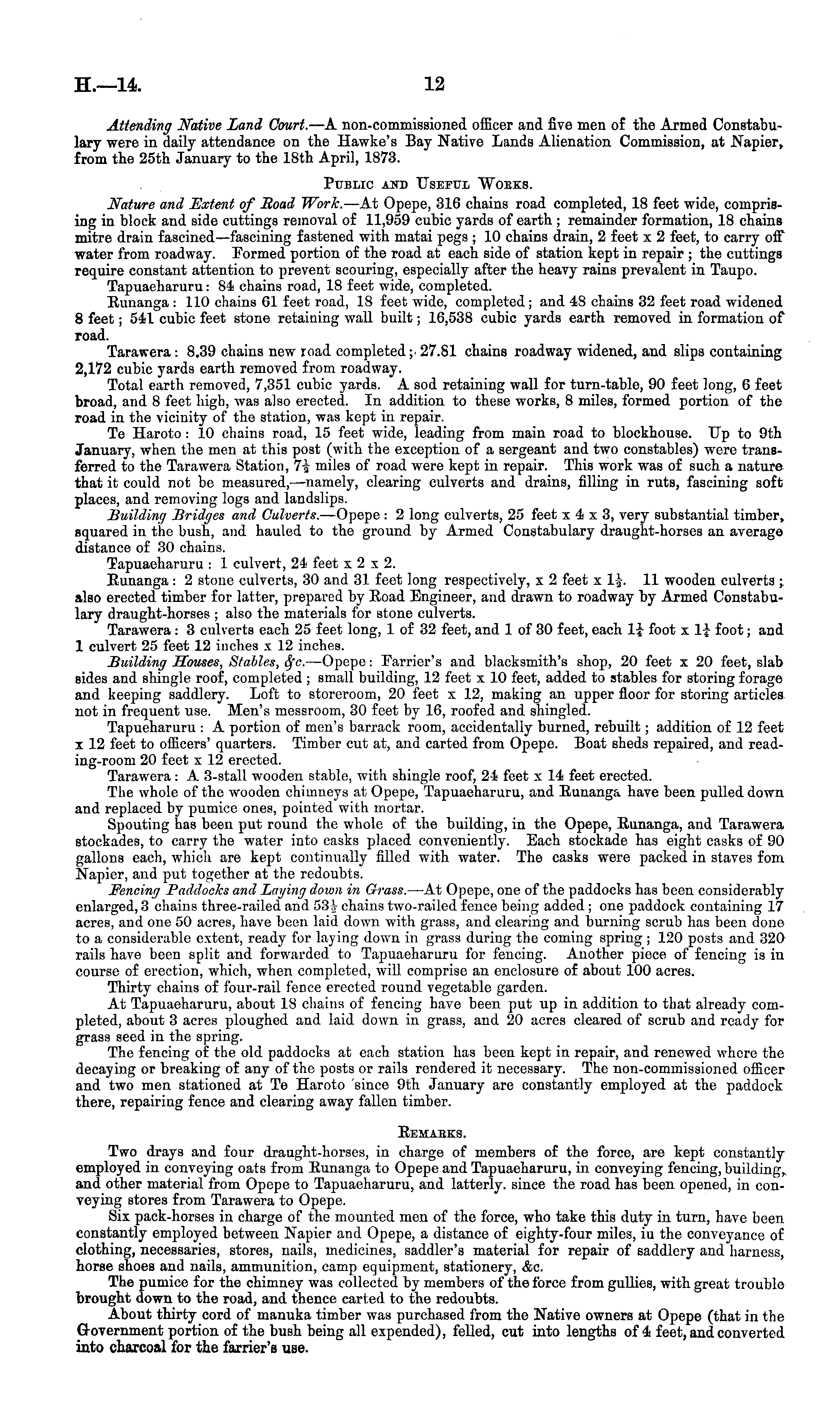 Attending Native Land Court. —A non-commissioned officer and five men of the Armed Constabulary were in daily attendance on the Hawke's Bay Native Lands Alienation Commission, at Napier, from the 25th January to the 18th April, 1873. Public and Useful Works. Nature and Extent of Boad Work. —At Opepe, 316 chains road completed, 18 feet wide, comprising in block and side cuttings removal of 11,959 cubic yards of earth ; remainder formation, 18 chains mitre drain fascined —fascining fastened with matai pegs ; 10 chains drain, 2 feet x 2 feet, to carry off water from roadway. Formed portion of the road at each side of station kept in repair ; the cuttings require constant attention to prevent scouring, especially after the heavy rains prevalent in Taupo. Tapuaeharuru: 84 chains road, 18 feet wide, completed. Runanga: 110 chains 61 feet road, 18 feet wide, completed; and 48 chains 32 feet road widened 8 feet; 541 cubic feet stone retaining wall built; 16,538 cubic yards earth removed in formation of road. Tarawera: 8.39 chains new road completed;-27.81 chains roadway widened, and slips containing 2,172 cubic yards earth removed from roadway. Total earth removed, 7,351 cubic yards. A sod retaining wall for turn-table, 90 feet long, 6 feet broad, and 8 feet high, was also erected. In addition to these works, 8 miles, formed portion of the road in the vicinity of the station, was kept in repair. Te Haroto :10 chains road, 15 feet wide, leading from main road to blockhouse. Up to 9th January, when the men at this post (with the exception of a sergeant and two constables) were transferred to the Tarawera Station, l\ miles of road were kept in repair. This work was of such a nature that it could not be measured, —namely, clearing culverts and drains, filling in ruts, fascining soft places, and removing logs and landslips. Building Bridges and Culverts. —Opepe : 2 long culverts, 25 feet x 4 x 3, very substantial timber, Bquared in the bush, and hauled to the ground by Armed Constabulary draught-horses an average distance of 30 chains. Tapuaeharuru : 1 culvert, 24 feet x 2 x 2. Runanga : 2 stone culverts, 30 and 31 feet long respectively, x 2 feet x \\, 11 wooden culverts ; also erected timber for latter, prepared by Road Engineer, and drawn to roadway by Armed Constabulary draught-horses ; also the materials for stone culverts. Tarawera : 3 culverts each 25 feet long, lof 32 feet, and lof 30 feet, each 1J foot xlt foot; and 1 culvert 25 feet 12 inches x 12 inches. Bitilding Houses, Stables, Sfc. —Opepe: Farrier's and blacksmith's shop, 20 feet x 20 feet, slab sides and shingle roof, completed; small building, 12 feet xlO feet, added to stables for storing forage and keeping saddlery. Loft to storeroom, 20 feet x 12, making an upper floor for storing articles not in frequent use. Men's messroom, 30 feet by 16, roofed and shingled. Tapueharuru : A portion of men's barrack room, accidentally burned, rebuilt; addition of 12 feet xl 2 feet to officers' quarters. Timber cut at, and carted from Opepe. Boat sheds repaired, and read-ing-room 20 feet x 12 erected. Tarawera : A 3-stall wooden stable, with shingle roof, 24 feet x 14 feet erected. The whole of the wooden chimneys at Opepe, Tapuaeharuru, and Runanga have been pulled down and replaced by pumice ones, pointed with mortar. Spouting has been put round the whole of the building, in the Opepe, Runanga, and Tarawera stockades, to carry the water into casks placed conveniently. Each stockade has eight casks of 90 gallons each, which are kept continually filled with water. The casks were packed in staves fom Napier, and put together at the redoubts. Fencing Paddocks and Laying down in Grass. —At Opepe, one of the paddocks has been considerably enlarged, 3 chains three-railed and 58J chains two-railed fence being added ; one paddock containing 17 acres, aud one 50 acres, have been laid down with grass, and clearing and burning scrub has been done to a considerable extent, ready for laying down in grass during the coming spring ; 120 posts and 320 rails have been split and forwarded to Tapuaeharuru for fencing. Another piece of fencing is in course of erection, which, when completed, will comprise an enclosure of about 100 acres. Thirty chains of four-rail fence erected round vegetable garden. At Tapuaeharuru, about 18 chains of fencing have been put up in addition to that already completed, about 3 acres ploughed and laid down in grass, and 20 acres cleared of scrub and ready for grass seed in the spring. The fencing of the old paddocks at each station has been kept in repair, and renewed where the decaying or breaking of any of the posts or rails rendered it necessary. The non-commissioned officer and two men stationed at Te Haroto since 9th January are constantly employed at the paddock there, repairing fence and clearing away fallen timber. Remarks. Two drays and four draught-horses, in charge of members of the force, are kept constantly employed in conveying oats from Runanga to Opepe and Tapuaeharuru, in conveying fencing, building, and other material from Opepe to Tapuaeharuru, and latterly, since the road has been opened, in conveying stores from Tarawera to Opepe. Six pack-horses in charge of the mounted men of the force, who take this duty in turn, have been constantly employed between Napier and Opepe, a distance of eighty-four miles, iv the conveyance of clothing, necessaries, stores, nails, medicines, saddler's material for repair of saddlery and harness, horse shoes and nails, ammunition, camp equipment, stationery, &c. The pumice for the chimney was collected by members of the force from gullies, with great trouble brought down to the road, and thence carted to the redoubts. About thirty cord of manuka timber was purchased from the Native owners at Opepe (that in the Government portion of the bush being all expended), felled, cut into lengths of 4 feet, and converted into charcoal for the farrier's use.