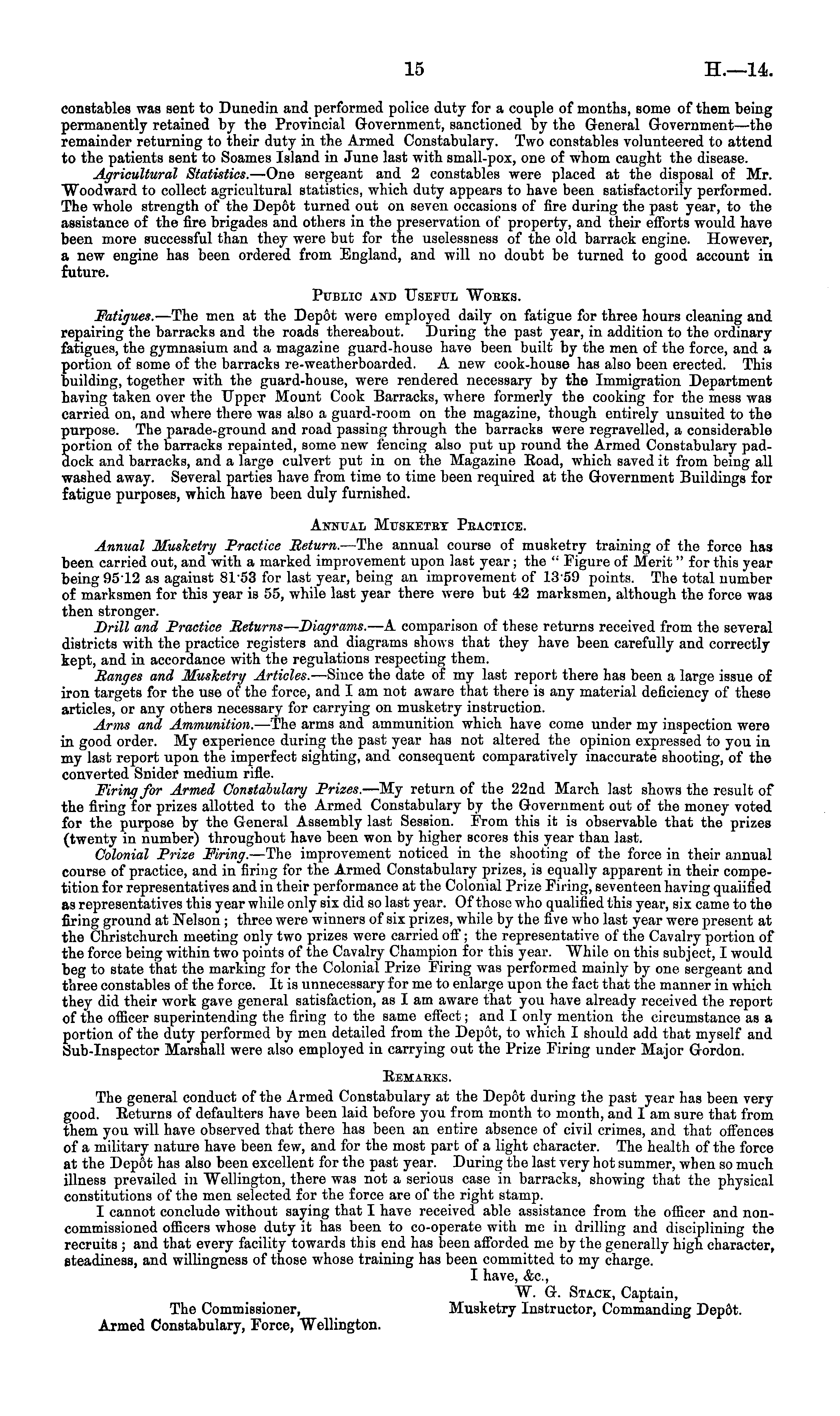 constables was sent to Dunedin and performed police duty for a couple of months, some of them being permanently retained by the Provincial Government, sanctioned by the General Government—the remainder returning to their duty in the Armed Constabulary. Two constables volunteered to attend to the patients sent to Soames Island in June last with small-pox, one of whom caught the disease. Agricultural Statistics. —One sergeant and 2 constables were placed at the disposal of Mr. Woodward to collect agricultural statistics, which duty appears to have been satisfactorily performed. The whole strength of the Depot turned out on seven occasions of fire during the past year, to the assistance of the fire brigades and others in the preservation of property, and their eiforts would have been more successful than they wore but for the uselessness of the old barrack engine. However, a new engine has been ordered from England, and will no doubt be turned to good account in future. Public and Useful Works. Fatigues. —The men at the Depot were employed daily on fatigue for three hours cleaning and repairing the barracks and the roads thereabout. During the past year, in addition to the ordinary fatigues, the gymnasium and a magazine guard-house have been built by the men of the force, and a portion of some of the barracks re-weatherboarded. A new cook-house has also been erected. This building, together with the guard-house, were rendered necessary by the Immigration Department having taken over the Upper Mount Cook Barracks, where formerly the cooking for the mess was carried on, and where there was also a guard-room on the magazine, though entirely unsuited to the purpose. The parade-ground and road passing through the barracks were regravelled, a considerable portion of the barracks repainted, some new fencing also put up round the Armed Constabulary paddock and barracks, and a large culvert put in on the Magazine Road, which saved it from being all washed away. Several parties have from time to time been required at the Government Buildings for fatigue purposes, which have been duly furnished. Annual Musketry Practice. Annual Musketry Practice Beturn. —The annual course of musketry training of the force has been carried out, and with a marked improvement upon last year ; the ': Figure of Merit " for this year being 9512 as against 8153 for last year, being an improvement of 1359 points. The total number of marksmen for this year is 55, while last year there were but 42 marksmen, although the force was then stronger. Drill and Practice Beturns — Diagrams. —A comparison of these returns received from the several districts with the practice registers and diagrams shows that they have been carefully and correctly kept, and in accordance with the regulations respecting them. Banqes and Musketry Articles. —Since the date of my last report there has been a large issue of iron targets for the use of the force, and I am not aware that there is any material deficiency of these articles, or any others necessary for carrying on musketry instruction. Arms and Ammunition. —The arms and ammunition which have come under my inspection were in good order. My experience during the past year has not altered the opinion expressed to you in my last report upon the imperfect sighting, and consequent comparatively inaccurate shooting, of the converted Snider medium rifle. Firing for Armed Constabulary Prizes. —My return of the 22nd March last shows the result of the firing for prizes allotted to the Armed Constabulary by the Government out of the money voted for the purpose by the General Assembly last Session. From this it is observable that the prizes (twenty in number) throughout have been won by higher scores this year than last. Colonial Prize Firing. —The improvement noticed in the shooting of the force in their annual course of practice, and in firing for the Armed Constabulary prizes, is equally apparent in their competition for representatives and in their performance at the Colonial Prize Firing, seventeen having qualified as representatives this year while only six did so last year. Of those who qualified this year, six came to tho firing ground at Nelson ; threo were winners of six prizes, while by the five who last year were present at the Christchurch meeting only two prizes were carried off; the representative of the Cavalry portion of the force being within two points of the Cavalry Champion for this year. While on this subject, I would beg to state that the marking for the Colonial Prize Firing was performed mainly by one sergeant and three constables of the force. It is unnecessary for me to enlarge upon the fact that the manner in which they did their work gave general satisfaction, as I am aware that you have already received the report of the officer superintending the firing to the same effect; and I only mention the circumstance as a portion of the duty performed by men detailed from the Depot, to which I should add that myself and Sub-Inspector Marshall were also employed in carrying out the Prize Firing under Major Gordon. Remarks. The general conduct of the Armed Constabulary at the Depot during the past year has been very good. Returns of defaulters have been laid before you from month to month, and lam sure that from them you will have observed that there has been an entire absence of civil crimes, and that offences of a military nature have been few, and for the most part of a light character. The health of the force at the Depot has also been excellent for the past year. During the last very hot summer, when so much illness prevailed in Wellington, there was not a serious case in barracks, showing that the physical constitutions of the men selected for the force are of the right stamp. I cannot conclude without saying that I have received able assistance from the officer and noncommissioned officers whose duty it has been to co-operate with me in drilling and disciplining t