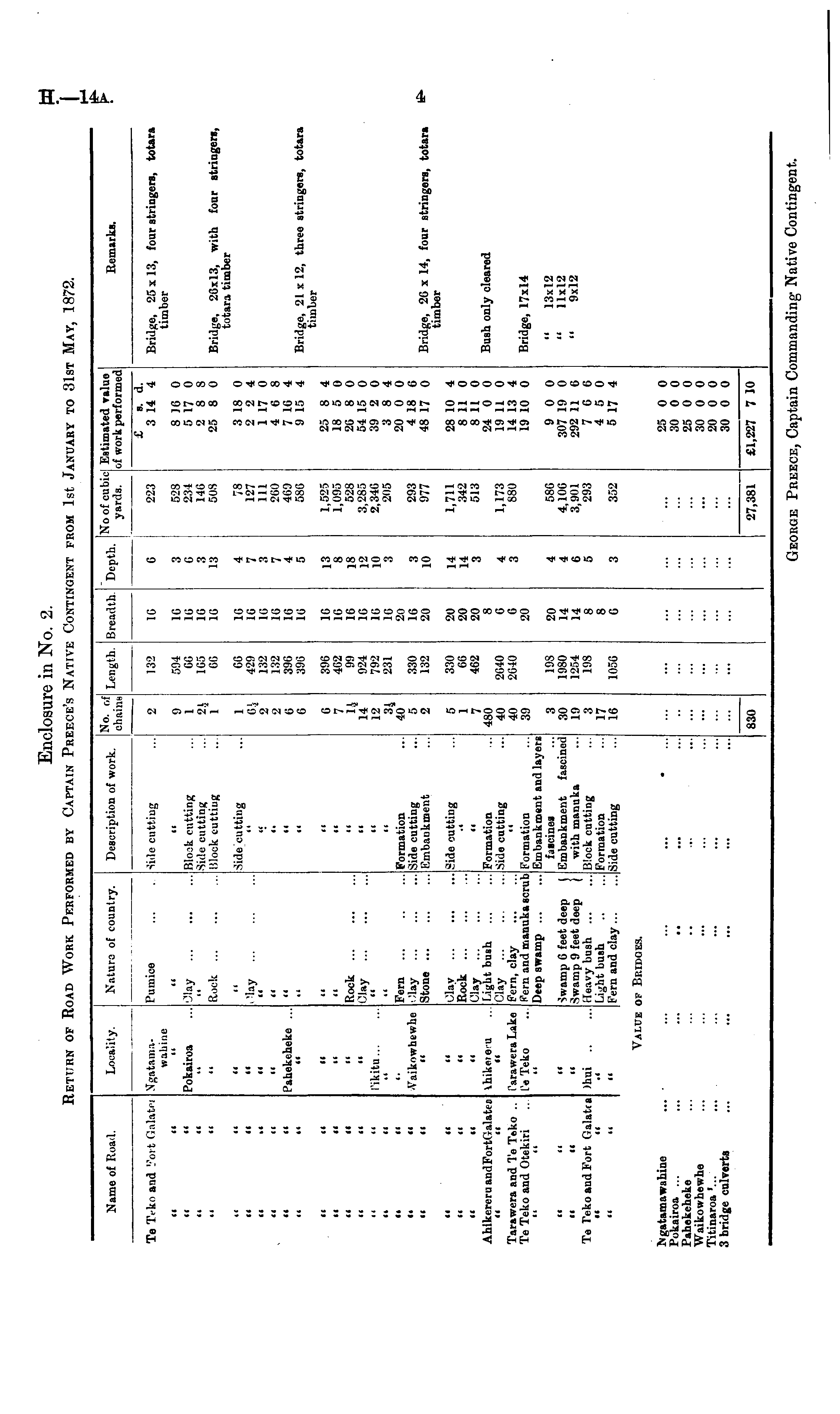 Enclosure in No. 2. RETURN OF ROAD WORK PERFORMED BY CAPTAIN PREECE'S NATIVE CONTINGENT FROM 1st JANUARY TO 31st MAY, 1872.
