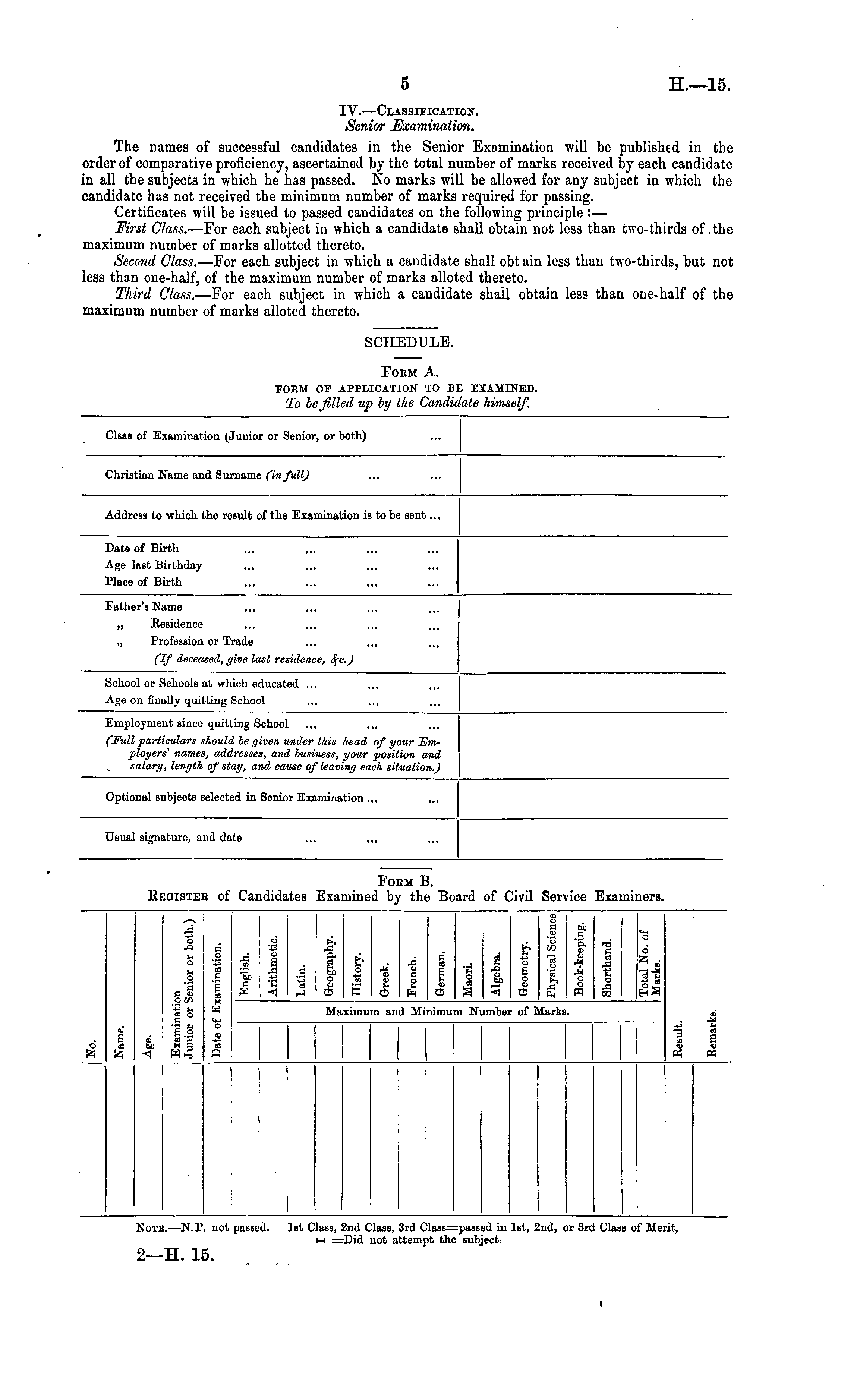 IV. —Classification. Senior Examination. The names of successful candidates in the Senior Examination will be published in the order of comparative proficiency, ascertained by the total number of marks received by each candidate in all the subjects in which he has passed. No marks will be allowed for any subject in which the candidate has not received the minimum number of marks required for passing. Certificates will be issued to passed candidates on the following principle :— First Class. —For each subject in which a candidate shall obtain not less than two-thirds of the maximum number of marks allotted thereto. Second Class. —For each subject in which a candidate shall obtain less than two-thirds, but not less than one-half, of the maximum number of marks alloted thereto. Third Class. —For each subject in which a candidate shall obtain less than one-half of the maximum number of marks alloted thereto.