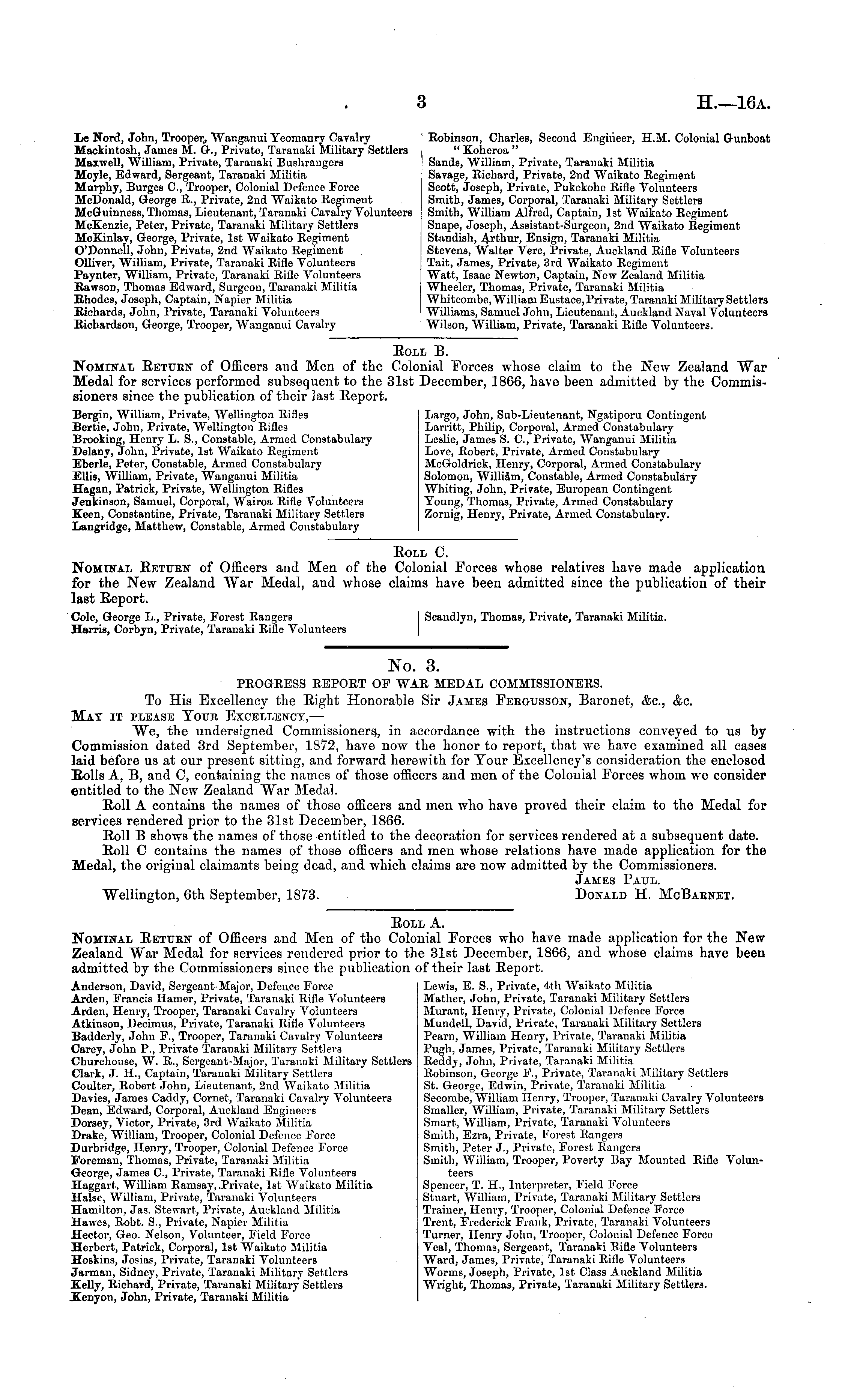 No. 3. PROGRESS REPORT OF WAR MEDAL COMMISSIONERS. To His Excellency the Right Honorable Sir James Feegusson, Baronet, &c, &c. May it please Toue Excellency,— We, the undersigned Commissioners, in accordance with the instructions conveyed to us by Commission dated 3rd September, 1872, have now the honor to report, that we have examined all cases laid before us at our present sitting, and forward herewith for Your Excellency's consideration the enclosed Rolls A, B, and C, containing the names of those officers and men of the Colonial Forces w rhom we consider entitled to the New Zealand War Medal. Roll A contains the names of those officers and men who have proved their claim to the Medal for services rendered prior to the 31st December, 1866. Roll B shows the names of those entitled to the decoration for services rendered at a subsequent date. Roll C contains the names of those officers and men whose relations have made application for the Medal, the original claimants being dead, and which claims are now admitted by the Commissioners. James Paul. Wellington, 6th September, 1873. Donald H. Mcßaenet.