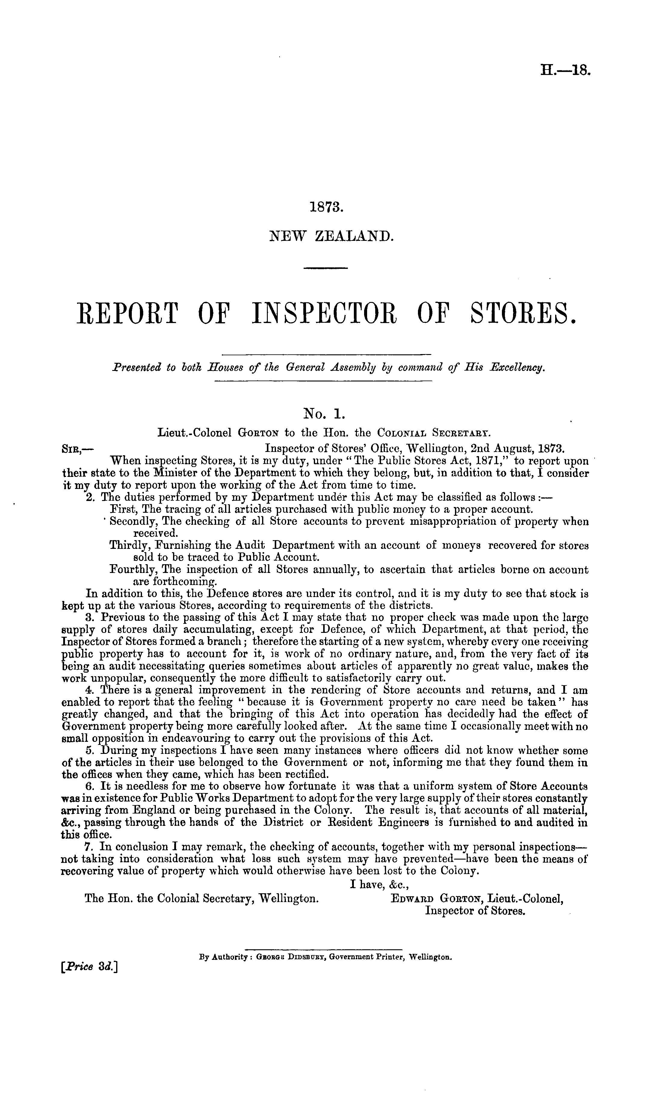Presented to both Houses of the General Assembly by command of His Excellency. No. 1. Lieut.-Colonel Gorton to the Hon. the Colonial Secretary. Sir, — Inspector of Stores' Office, Wellington, 2nd August, 1873. When inspecting Stores, it is my duty, under " The Public Stores Act, 1871," to report upon their state to the Minister of the Department to which they belong, but, in addition to that, I consider it my duty to report upon the working of the Act from time to time. 2. The duties performed by my Department under this Act may be classified as follows : — First, The tracing of all articles purchased with public money to a proper account. ' Secondly, The checking of all Store accounts to prevent misappropriation of property when received. Thirdly, Furnishing the Audit Department with an account of moneys recovered for stores sold to be traced to Public Account. Fourthly, The inspection of all Stores annually, to ascertain that articles borne on account are forthcoming. In addition to this, the Defence stores are under its control, and it is my duty to see that stock is kept up at the various Stores, according to requirements of the districts. 3. Previous to the passing of this Act I may state that no proper check was made upon the large supply of stores daily accumulating, except for Defence, of which Department, at that period, the Inspector of Stores formed a branch ; therefore the starting of a new system, whereby every one receiving public property has to account for it, is work of no ordinary nature, and, from the very fact of its being an audit necessitating queries sometimes about articles of apparently no great value, makes the work unpopular, consequently the more difficult to satisfactorily carry out. 4. There is a general improvement in the rendering of Store accounts and returns, and I am enabled to report that the feeling "because it is Government property no care need be taken" has greatly changed, and that the bringing of this Act into operation has decidedly had the effect of Government property being more carefully looked after. At the same time I occasionally meet with no small opposition in endeavouring to carry out the provisions of this Act. 5. During my inspections I have seen many instances where officers did not know whether some of the articles in their use belonged to the Government or not, informing me that they found them in the offices when they came, which has been rectified. 6. It is needless for me to observe how fortunate it was that a uniform system of Store Accounts was in existence for Public Works Department to adopt for the very large supply of their stores constantly arriving from England or being purchased in the Colony. The result is, that accounts of all material, &c., passing through the hands of the District or Resident Engineers is furnished to and audited in this office. 7. In conclusion I may remark, the checking of accounts, together with my personal inspections— not taking into consideration what loss such system may have prevented —have been the means of recovering value of property which would otherwise have been lost to the Colony. I have, &c, The Hon. the Colonial Secretary, Wellington. Edward Gorton, Lieut.-Colonel, Inspector of Stores. By Authority : Gbobocc Didsbuby, Government Printer, Wellington. [Price 3d.]