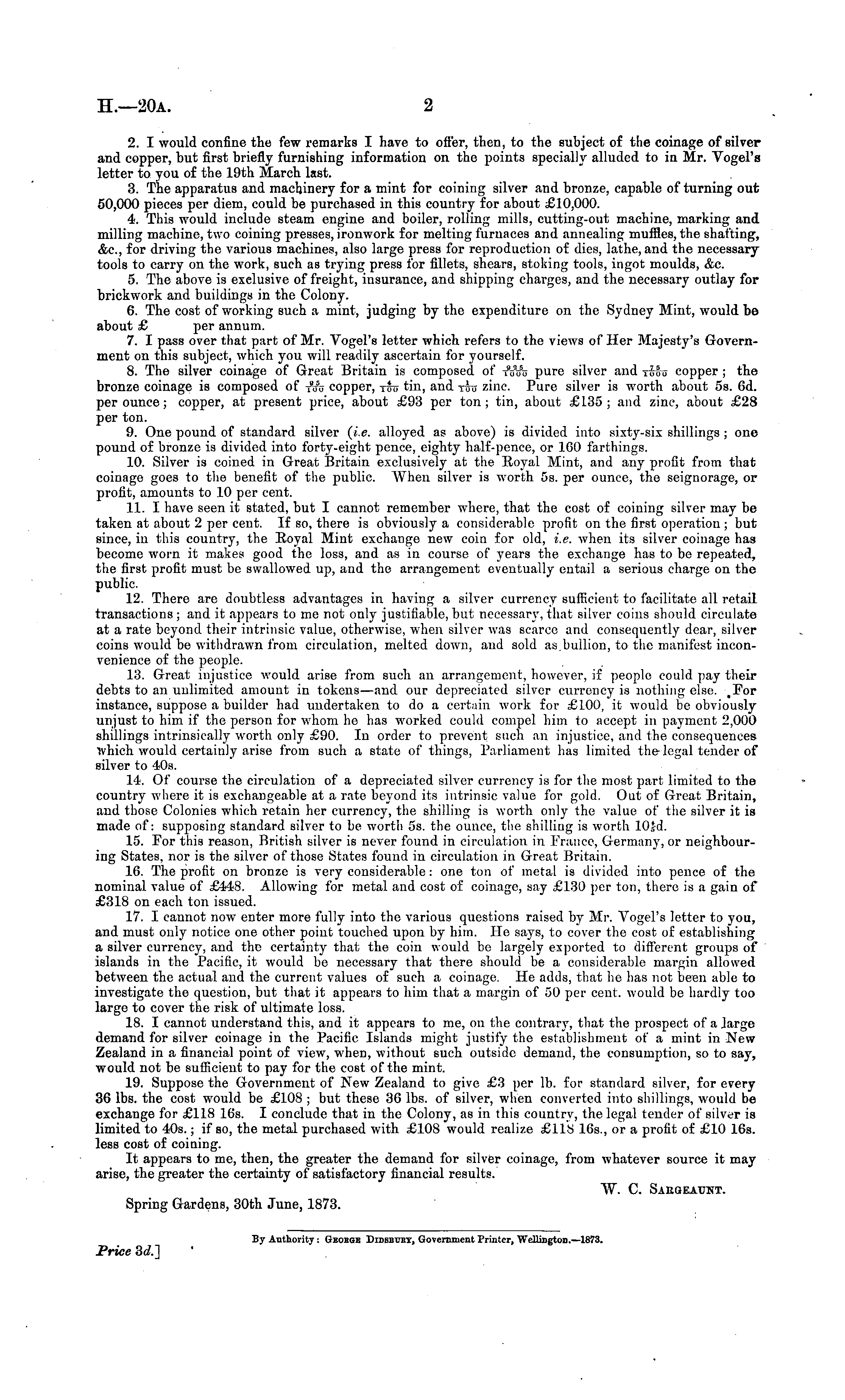 2. I would confine the few remarks I have to offer, then, to the subject of the coinage of silver and copper, but first briefly furnishing information on the points specially alluded to in Mr. Vogel's letter to you of the 19th March last. 3. The apparatus and machinery for a mint for coining silver and bronze, capable of turning out 50,000 pieces per diem, could be purchased in this country for about £10,000. 4. This would include steam engine and boiler, rolling mills, cutting-out machine, marking and milling machine, two coining presses, ironwork for melting furnaces and annealing muffles, the shafting, &c, for driving the various machines, also large press for reproduction of dies, lathe, and the necessary tools to carry on the work, such as trying press for fillets, shears, stoking tools, ingot moulds, &c. 5. The above is exclusive of freight, insurance, and shipping charges, and the necessary outlay for brickwork and buildings in the Colony. 6. The cost of working such a mint, judging by the expenditure on the Sydney Mint, would be about £ per annum. 7. I pass over that part of Mr. Vogel's letter which refers to the views of Her Majesty's Government on this subject, which you will readily ascertain for yourself. 8. The silver coinage of Great Britain is composed of -nfoo pure silver and tMo copper ; the bronze coinage is composed of tij\j copper, too tin, and tto zinc. Pure silver is w-orth about ss. 6d. per ounce; copper, at present price, about £93 per ton; tin, about £135 ; and zinc, about £28 per ton. 9. One pound of standard silver {i.e. alloyed as above) is divided into sixty-six shillings ; one pound of bronze is divided into forty-eight pence, eighty half-pence, or 160 farthings. 10. Silver is coined in Great Britain exclusively at the Eoyal Mint, and any profit from that coinage goes to the benefit of tho public. When silver is worth ss. per ounce, the seignorage, or profit, amounts to 10 per cent. 11. I have seen it stated, but I cannot remember where, that the cost of coining silver may be taken at about 2 per cent. If so, there is obviously a considerable profit on the first operation ; but since, in this country, the Eoyal Mint exchange new coin for old, i.e. when its silver coinage has become worn it makes good the loss, and as in course of years the exchange has to be repeated, the first profit must be swallowed up, and the arrangement eventually entail a serious charge on the public. 12. There are doubtless advantages in having a silver currency sufficient to facilitate all retail transactions ; and it appears to me not only justifiable, but necessary, that silver coins should circulate at a rate beyond their intrinsic value, otherwise, when silver was scarce and consequently dear, silver coins would be withdrawn from circulation, melted down, and sold as.bullion, to the manifest inconvenience of the people. 13. Great injustice would arise from such an arrangement, however, if people could pay their debts to an unlimited amount in tokens—and our depreciated silver currency is nothing else. .For instance, suppose a builder had undertaken to do a certain work for £100, it would be obviously unjust to him if the person for whom he has worked could compel him to accept in payment 2,000 shillings intrinsically worth only £90. In order to prevent such an injustice, and the consequences which would certainly arise from such a state of things, Parliament has limited the legal tender of silver to 40s. 14. Of course the circulation of a depreciated silver currency is for the most part limited to the country where it is exchangeable at a rate beyond its intrinsic value for gold. Out of Great Britain, and those Colonies which retain her currency, the shilling is worth only the value of the silver it is made of: supposing standard silver to be worth ss. the ounce, the shilling is worth 10_d. 15. For this reason, British silver is never found in circulation in France, Germany, or neighbouring States, nor is the silver of those States found in circulation in Great Britain. 16. The profit on bronze is very considerable : one ton of metal is divided into pence of the nominal value of £448. Allowing for metal and cost of coinage, say £130 per ton, there is a gain of £318 on each ton issued. 17. I cannot now enter more fully into the various questions raised by Mr. Vogel's letter to you, and must only notice one other point touched upon by him. He says, to cover the cost of establishing a silver currency, and tho certainty that the coin would be largely exported to different groups of islands in the Pacific, it would be necessary that there should be a considerable margin allowed between the actual and the current values of such a coinage. He adds, that he has not been able to investigate the question, but that it appears to him that a margin of 50 per cent, would be hardly too large to cover the risk of ultimate loss. 18. I cannot understand this, and it appears to me, on the contrary, that the prospect of a large demand for silver coinage in the Pacific Islands might justify the establishment of a mint in New Zealand in a financial point of view, when, without such outside demand, the consumption, so to say, would not be sufficient to pay for the cost of the mint. 19. Suppose the Government of New Zealand to give £3 per lb. for standard silver, for every 36 lbs. the cost would be £108 ; but these 36 lbs. of silver, when converted into shillings, would be exchange for £118 16s. I conclude that in the Colony, as in this country, the legal tender of silver is limited to 405.; if so, the metal purchased with £108 would realize £118 165., or a profit of £10 16s. less cost of coining. It appears to me, then, the greater the demand for silver coinage, from whatever source it may arise, the greater the certainty of satisfactory financial results. W. C. Sargeaunt. Spring Gardens, 30th June, 1873. By Authority : Geobge Didsbvby, Government Printer, Wellington.—lB73. Price 3