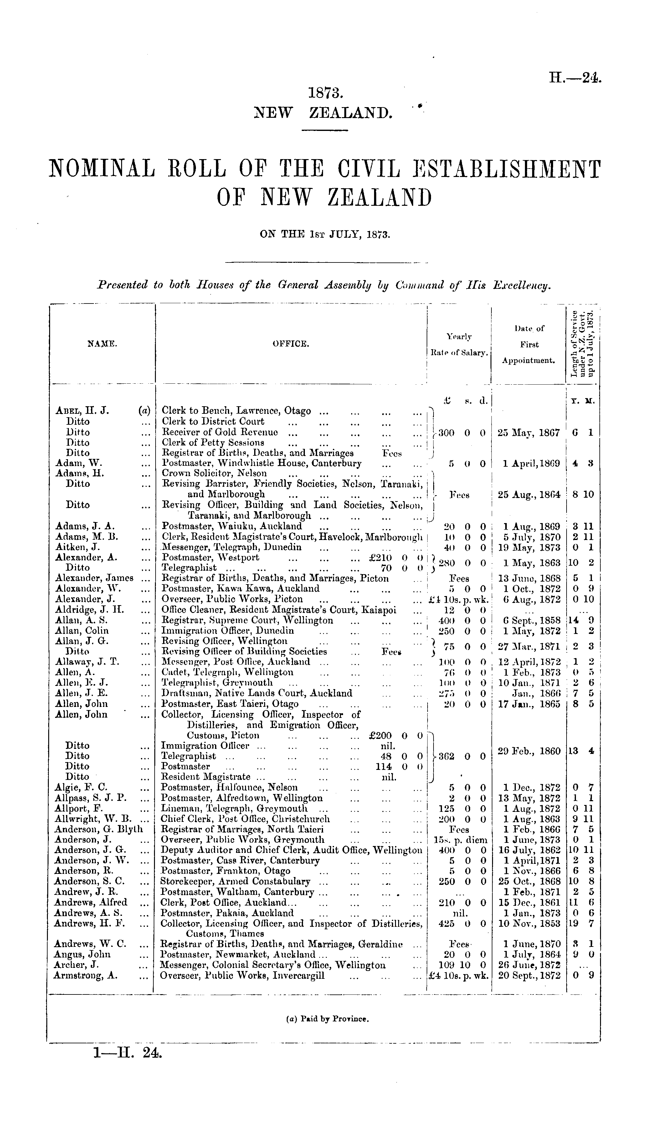 NOMINAL ROLL OF THE CIVIL ESTABLISHMENT OF NEW ZEALAND ON THE 1ST JULY, 1873.